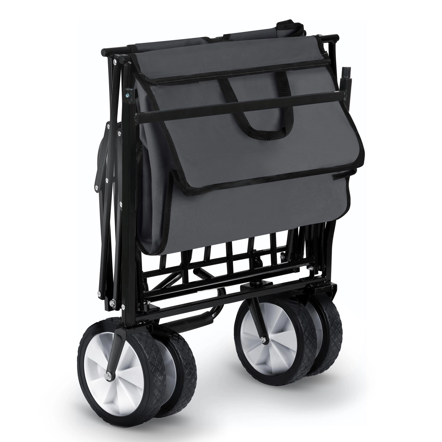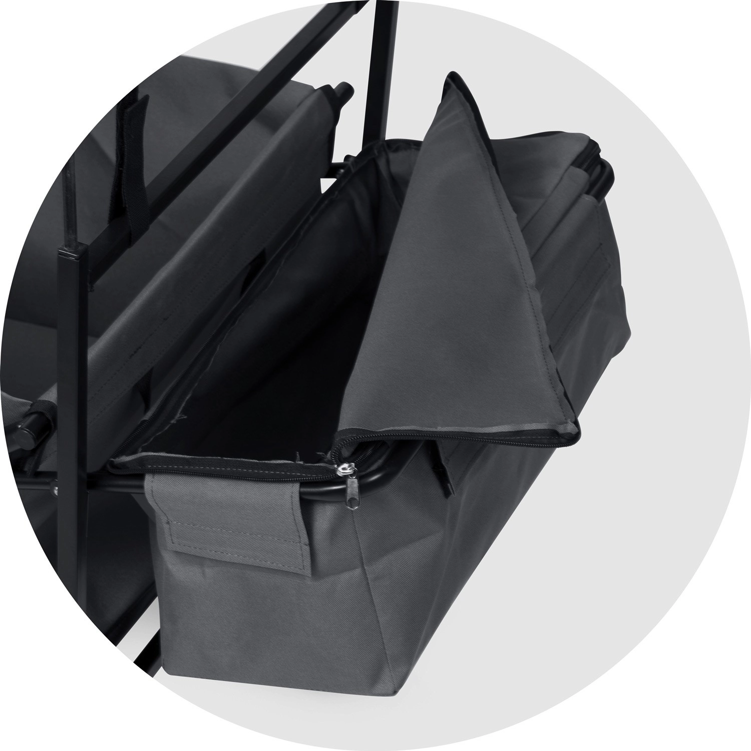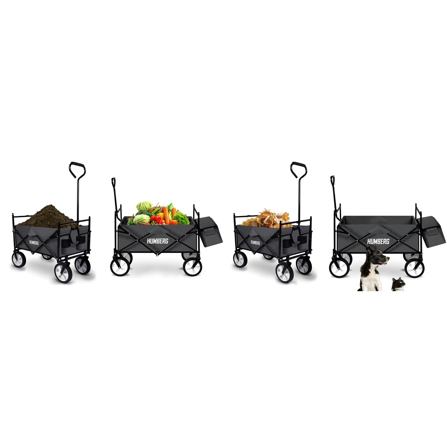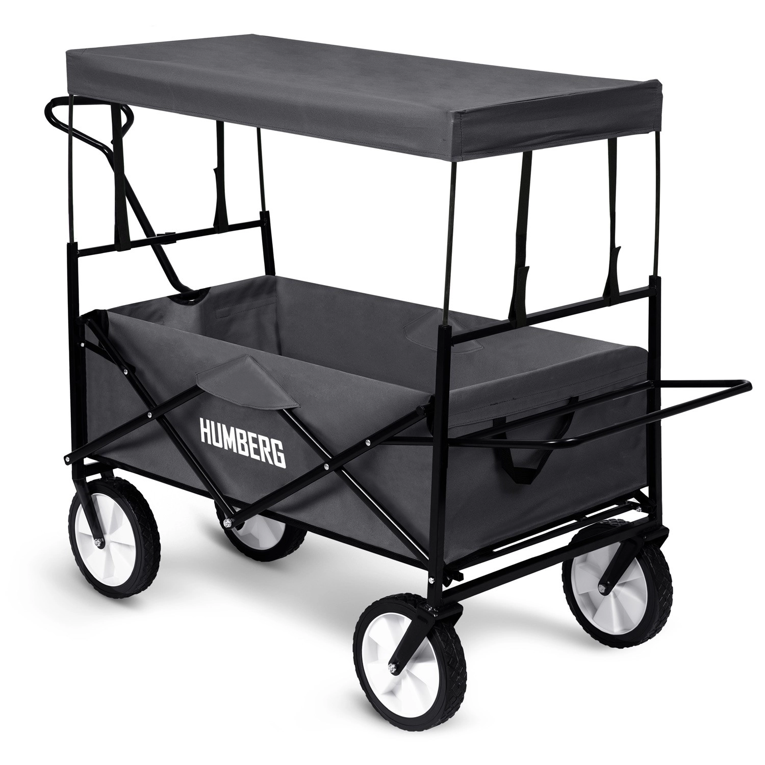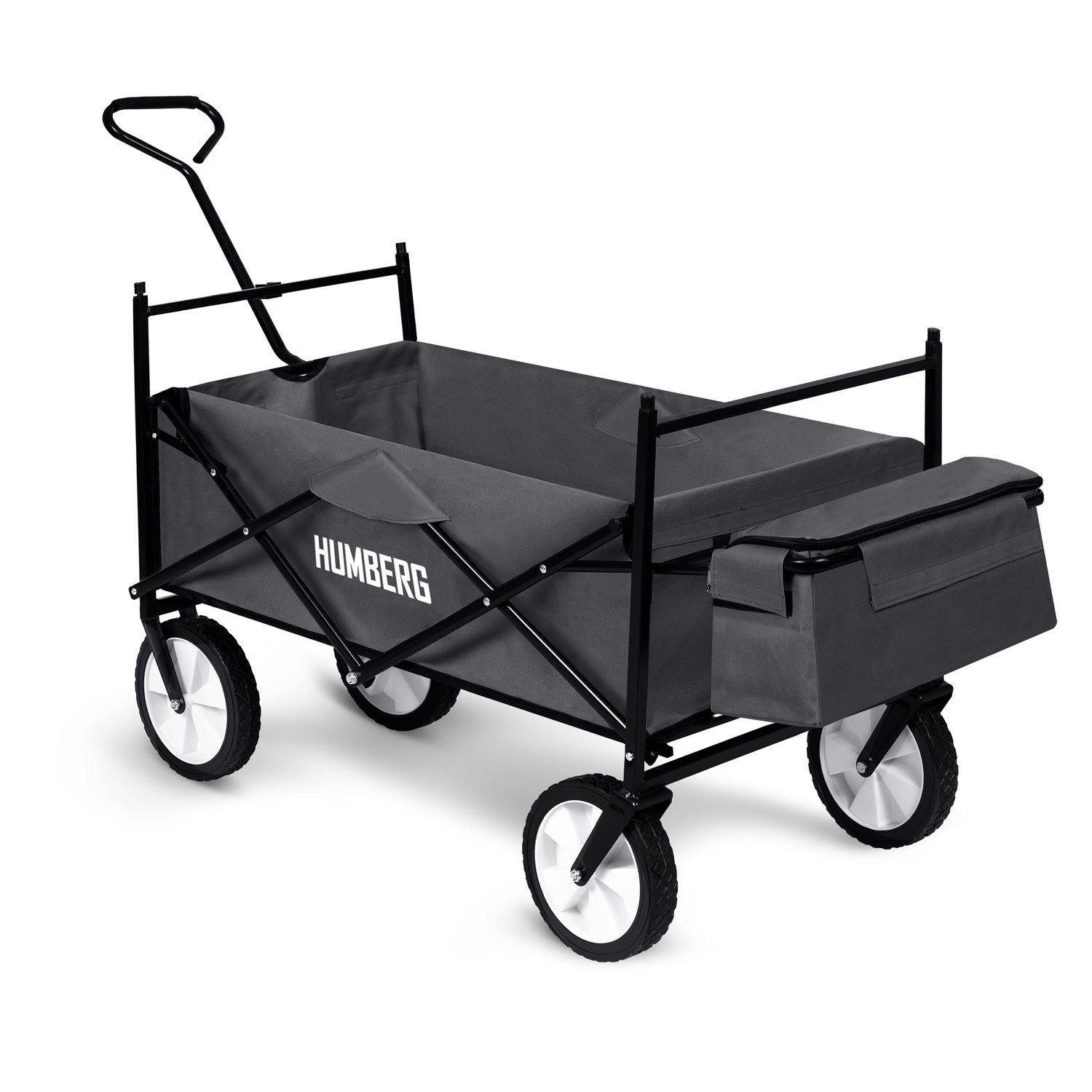 Praktičen zložljiv voziček HUMBERG s prostornino 80 l in nosilnostjo 90 kg olajša prevoz tovora na vrtu, izletih in na plaži. Ima nastavljivo strešico proti soncu in dežju, vzdržljiv jeklen okvir s prašnim lakiranjem, udoben teleskopski ročaj z nedrsečim premazom ter dodatni snemljiv žep na zadrgo za drobnarije. Sprednja vrtljiva kolesa zagotavljajo enostavno manevriranje, konstrukcija pa se hitro zloži v kompaktno velikost za preprosto prenašanje in shranjevanje.