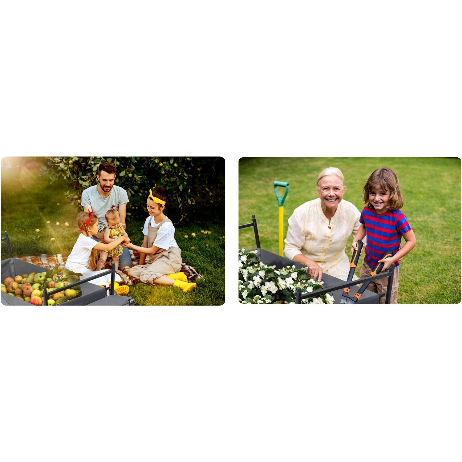 Iščete vsestransko pomoč pri prenašanju tovora? Zložljiv voziček HUMBERG ponuja prostoren tekstilni koš s prostornino 80 l, trden jeklen okvir in velika kolesa za stabilno vožnjo po različnih podlagah. Zahvaljujoč nastavljivi strešici zaščiti vsebino pred soncem in rahlim dežjem ter ohranja udobje pri prevozu občutljivih predmetov.