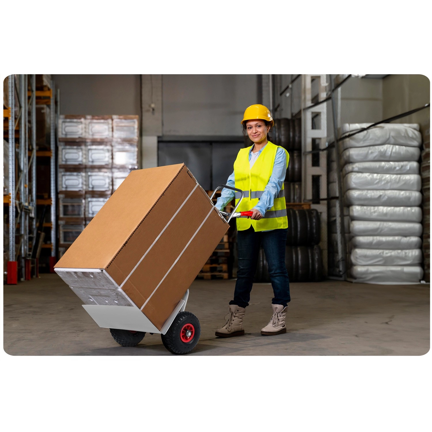 Velika napihljiva kolesa z ventili in kovinsko ojačitvijo omogočajo gladek prevoz tovora prek pragov, tlakovanih in grobih površin.