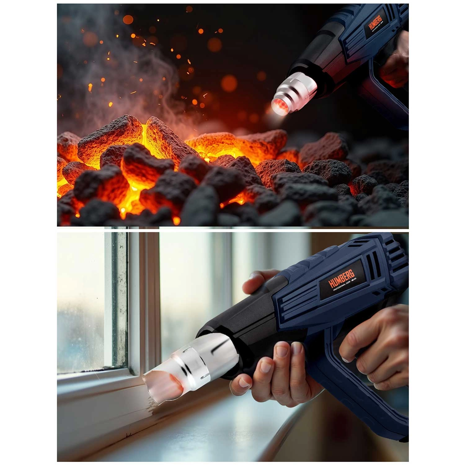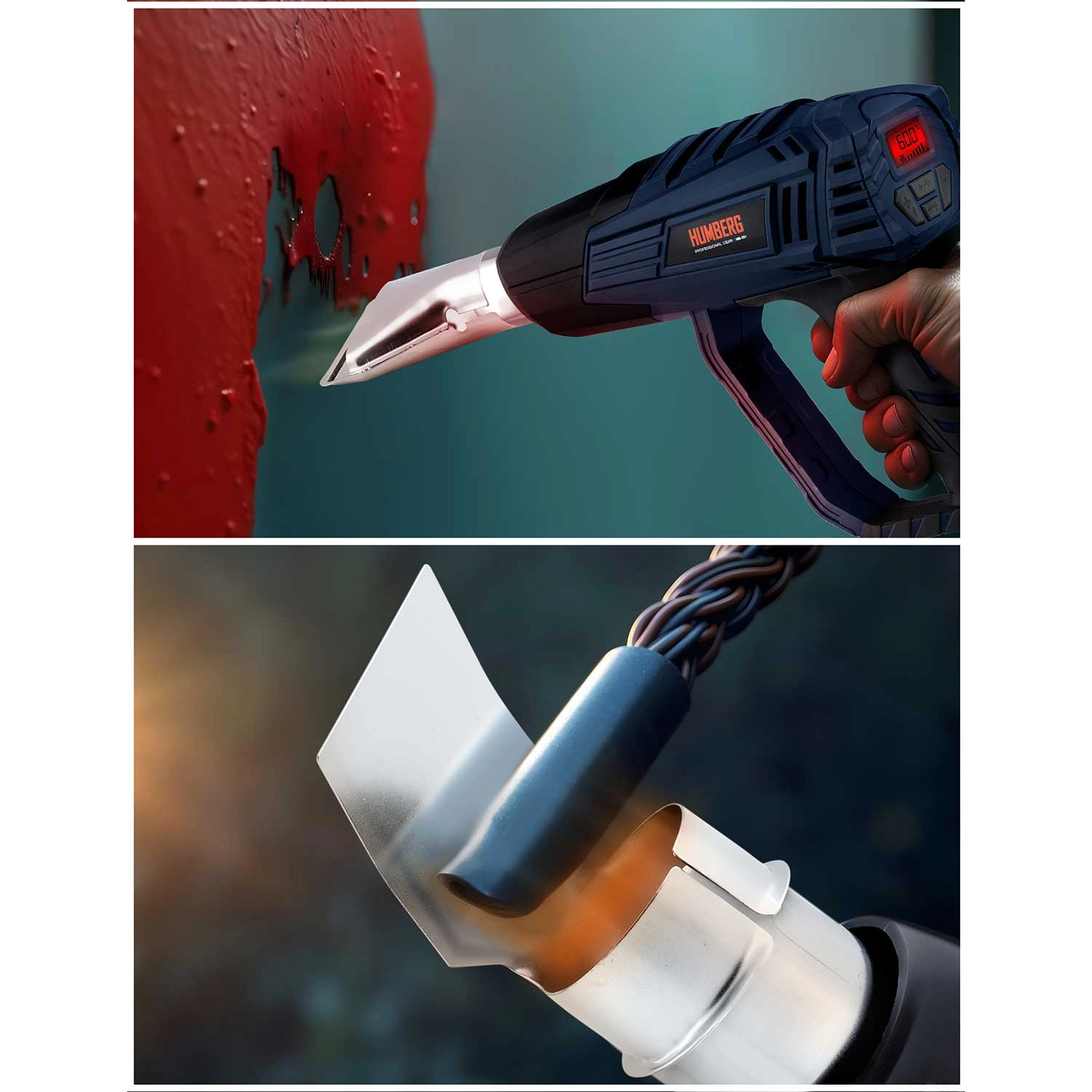 Vročezračni pištolj HUMBERG je zanesljiv pomočnik za delavnico in dom. Zahvaljujoč moči 2000 W in natančni regulaciji v korakih po 60 °C zlahka nastavite optimalno temperaturo za odstranjevanje starih premazov, sušenje, odmrzovanje, krčenje bužirk ali oblikovanje plastike. Barvni LCD-zaslon jasno prikazuje izbrano temperaturo in z menjavo barve obvešča o segrevanju ter pripravljenosti na delo.