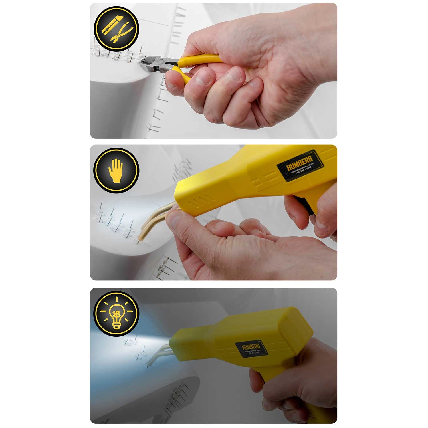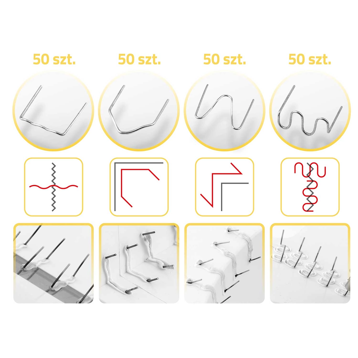 V kompletu je bogat nabor 200 sponk v 4 oblikah za različne tipe razpok – ravne, notranje in zunanje kote ter širše poškodbe. Po zavarjanju zlahka odstranite štrleče konce s kleščami za prirezovanje in poravnate površino z olfa nožem za čist rezultat, pripravljen za morebitno brušenje ali lakiranje.