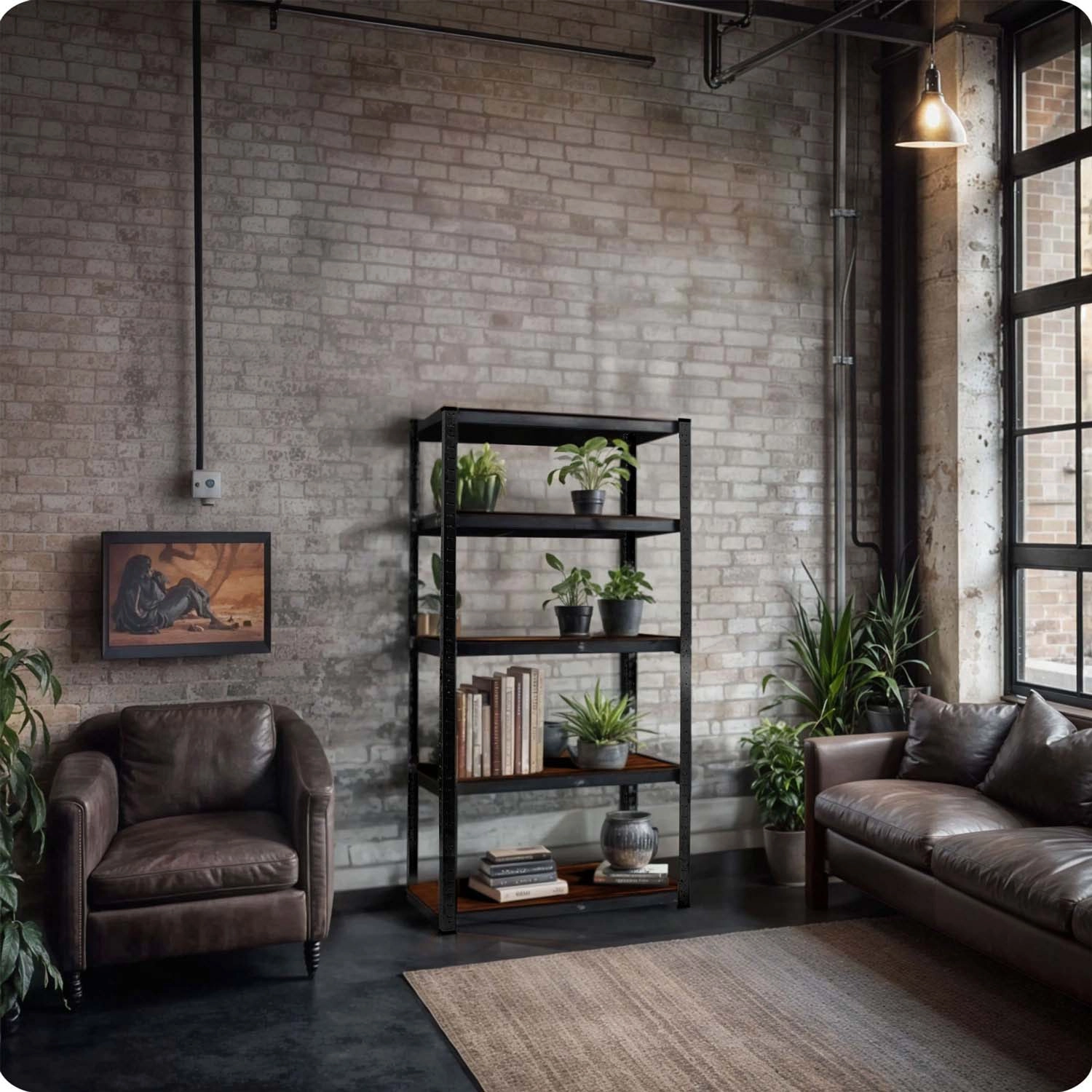 Galvanizirani jekleni profili s prašnim lakom v črni barvi in rustikalne MDF police so enostavne za vzdrževanje ter primerne za garažo, delavnico in sodoben dom.