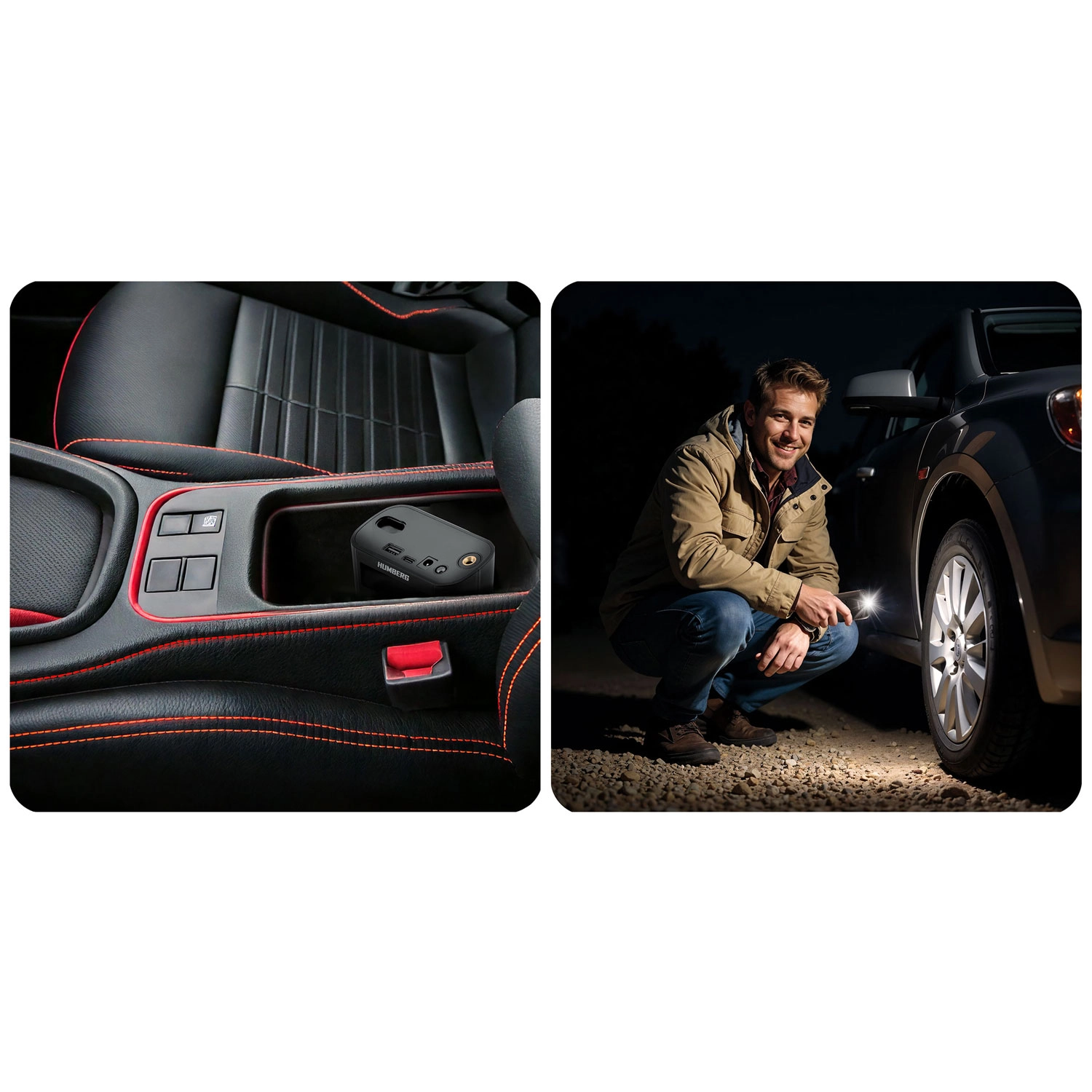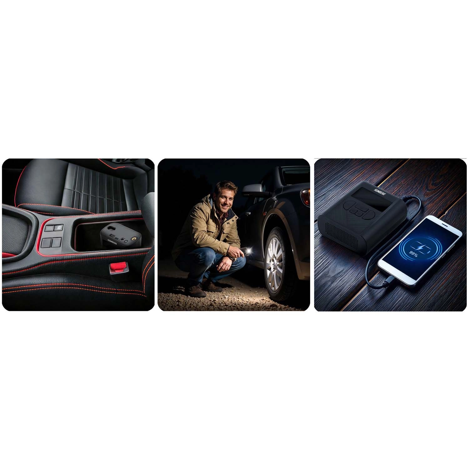 Uporaben je za pnevmatike avtomobilov, motociklov in koles, pa tudi za športne žoge in napihljive igrače. Vgrajena LED-svetilka s signalom SOS poveča varnost pri nočnih posegih ob vozilu, powerbank pa napolni vaša naprave.