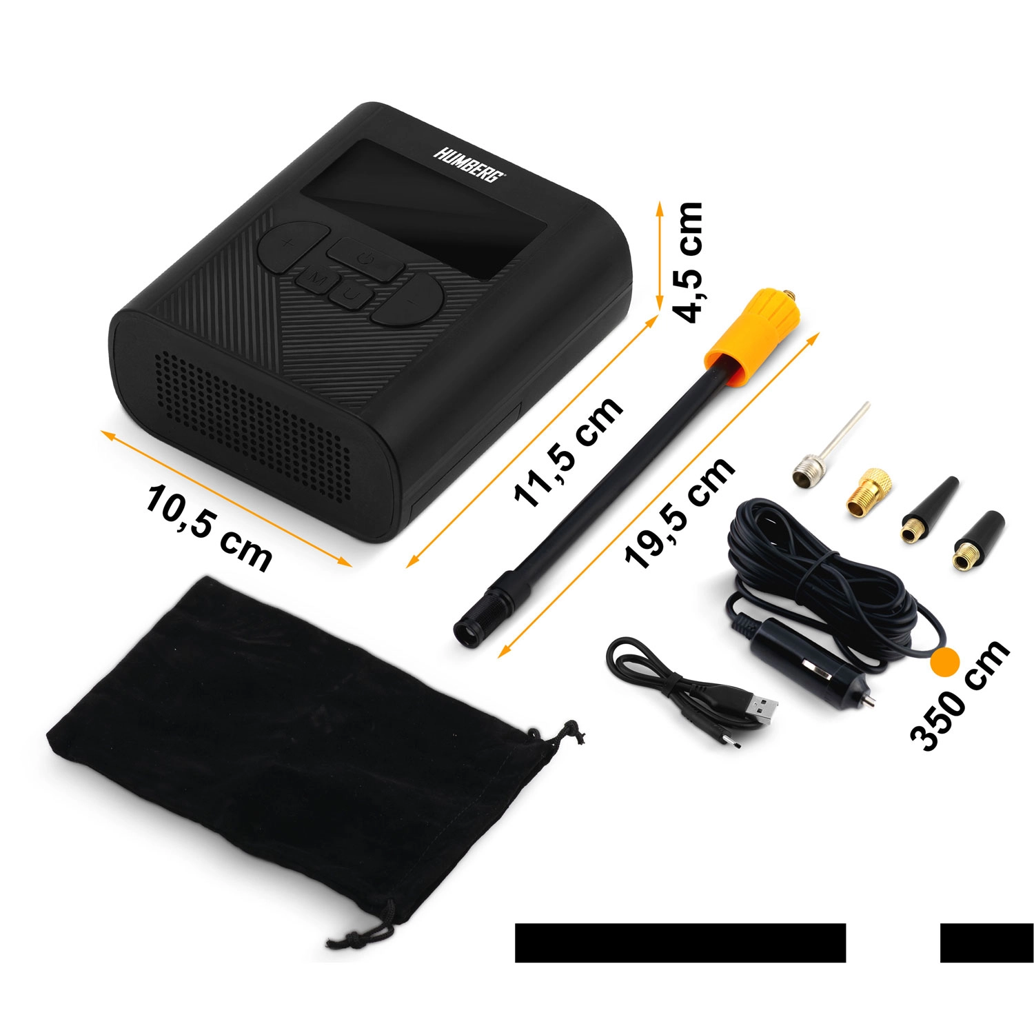 Nastavite ciljni tlak in mini kompresor HUMBERG se po doseženi vrednosti sam ustavi. Pregleden zaslon in upravljanje z gumbi za udobno in varno uporabo.