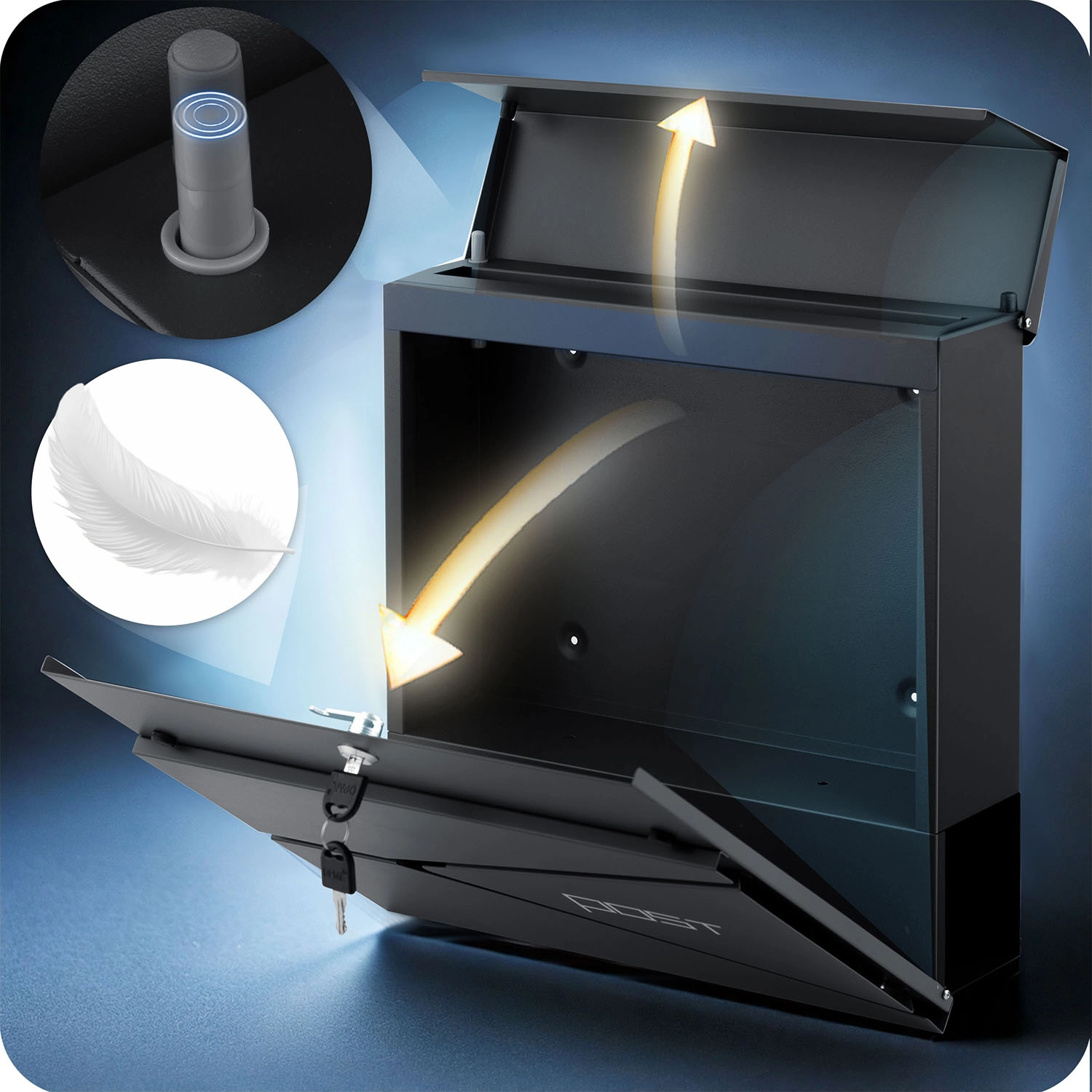 Pokrov zgornjega vmeta se zapira gladko in tiho, zato ne moti vas niti sosedov. Prekrivni ščit hkrati varuje pošto pred dežjem in snegom.