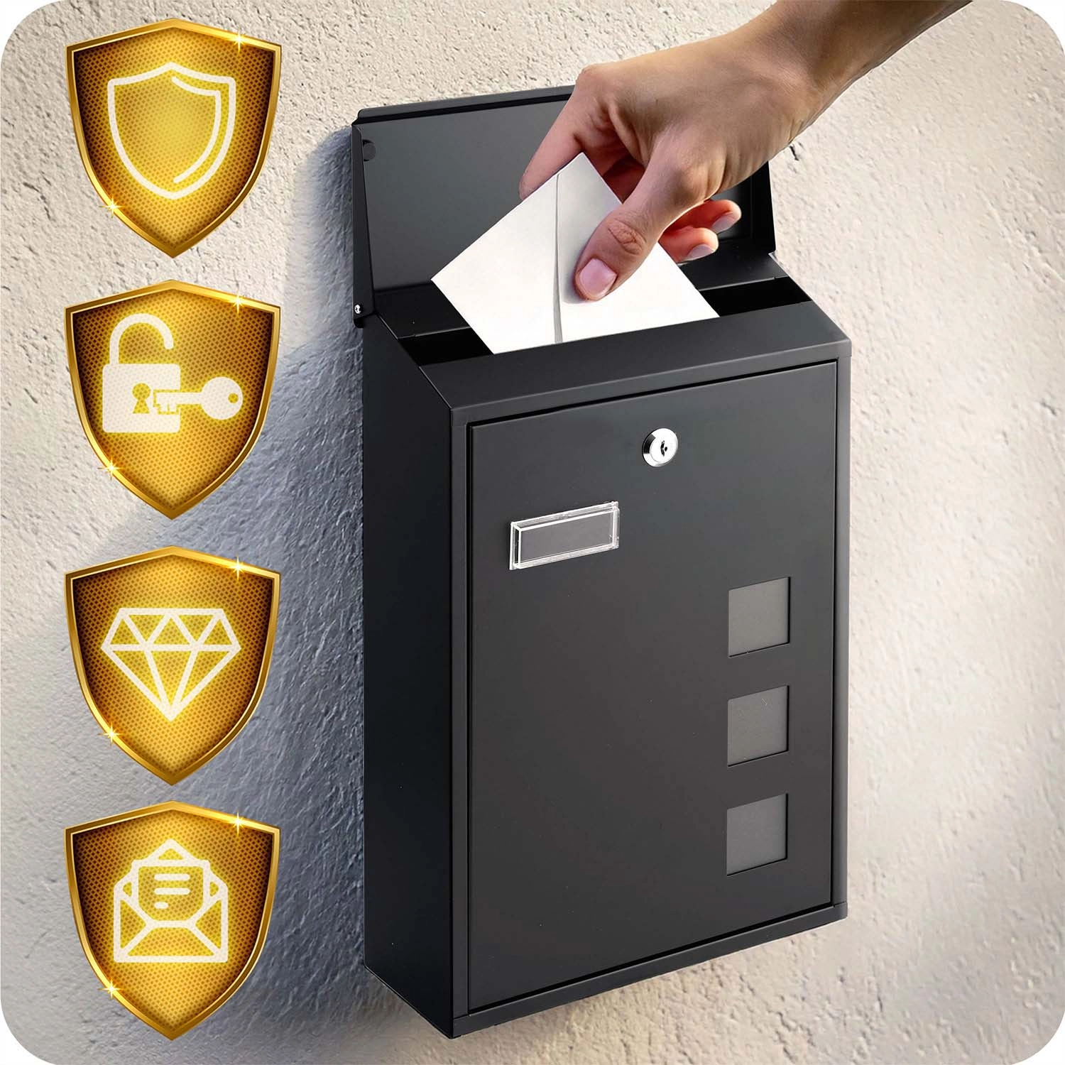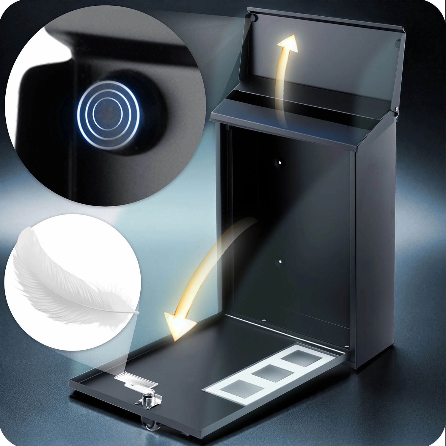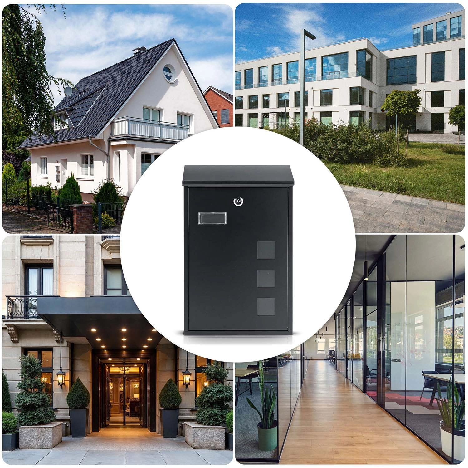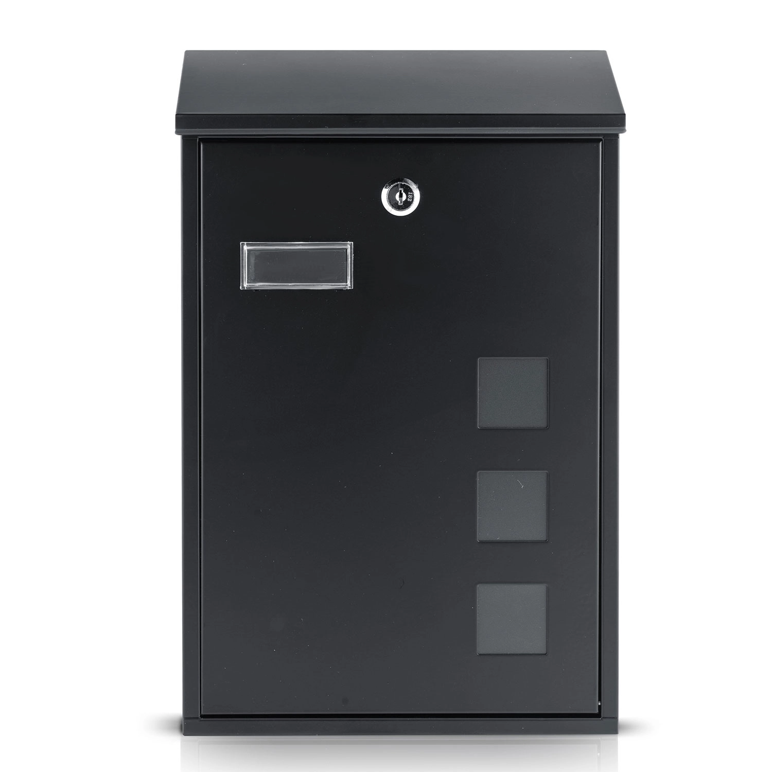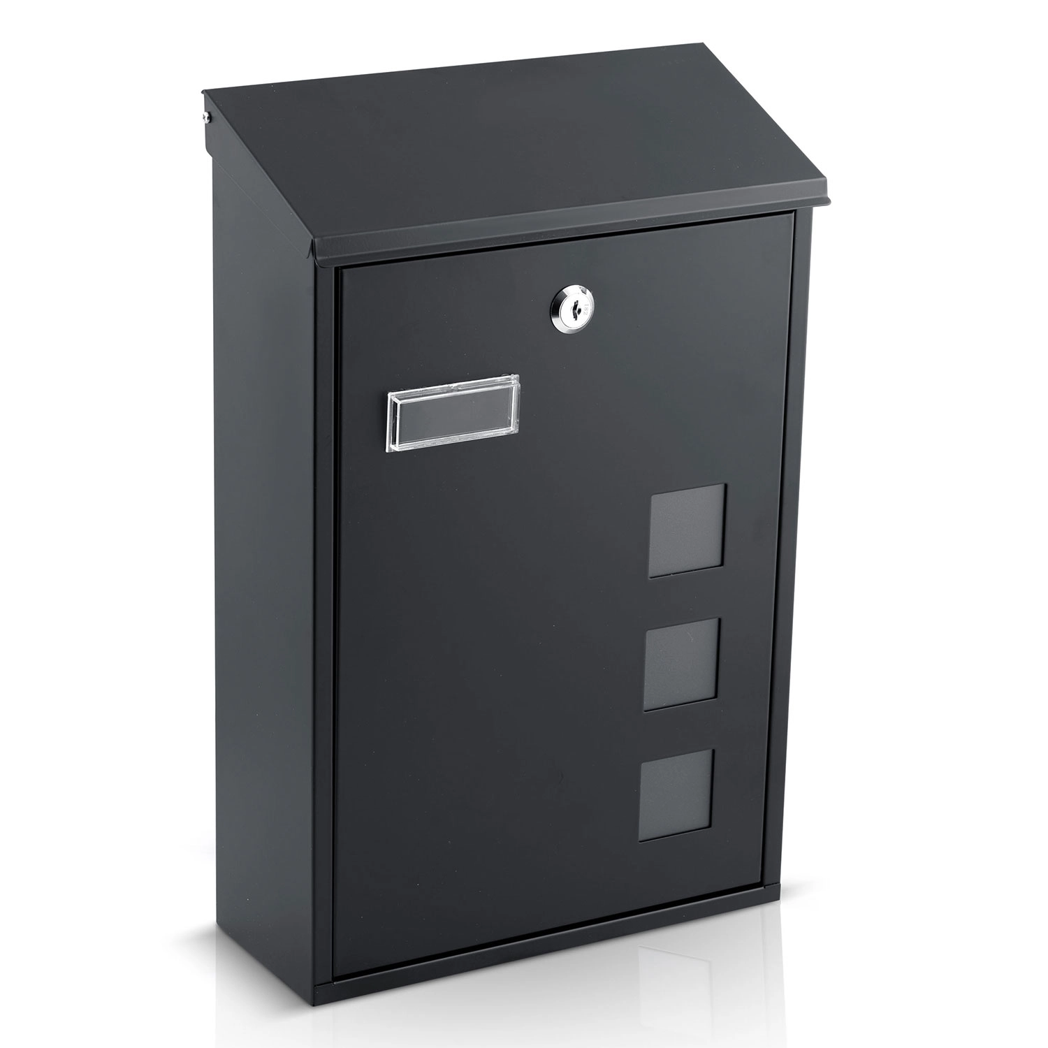Moderen stenski poštni nabiralnik je izdelan iz trpežnega pocinkanega jekla in površinsko obdelan s prašnim lakom v elegantni črni barvi. Zato odlično kljubuje koroziji, vlagi in UV-žarkom ter se lepo poda k sodobnim fasadam in ograjam. Premišljena zasnova ščiti pisma pred dežjem in snegom, medtem ko kontrolna okenca omogočajo hiter vpogled v vsebino brez odpiranja.