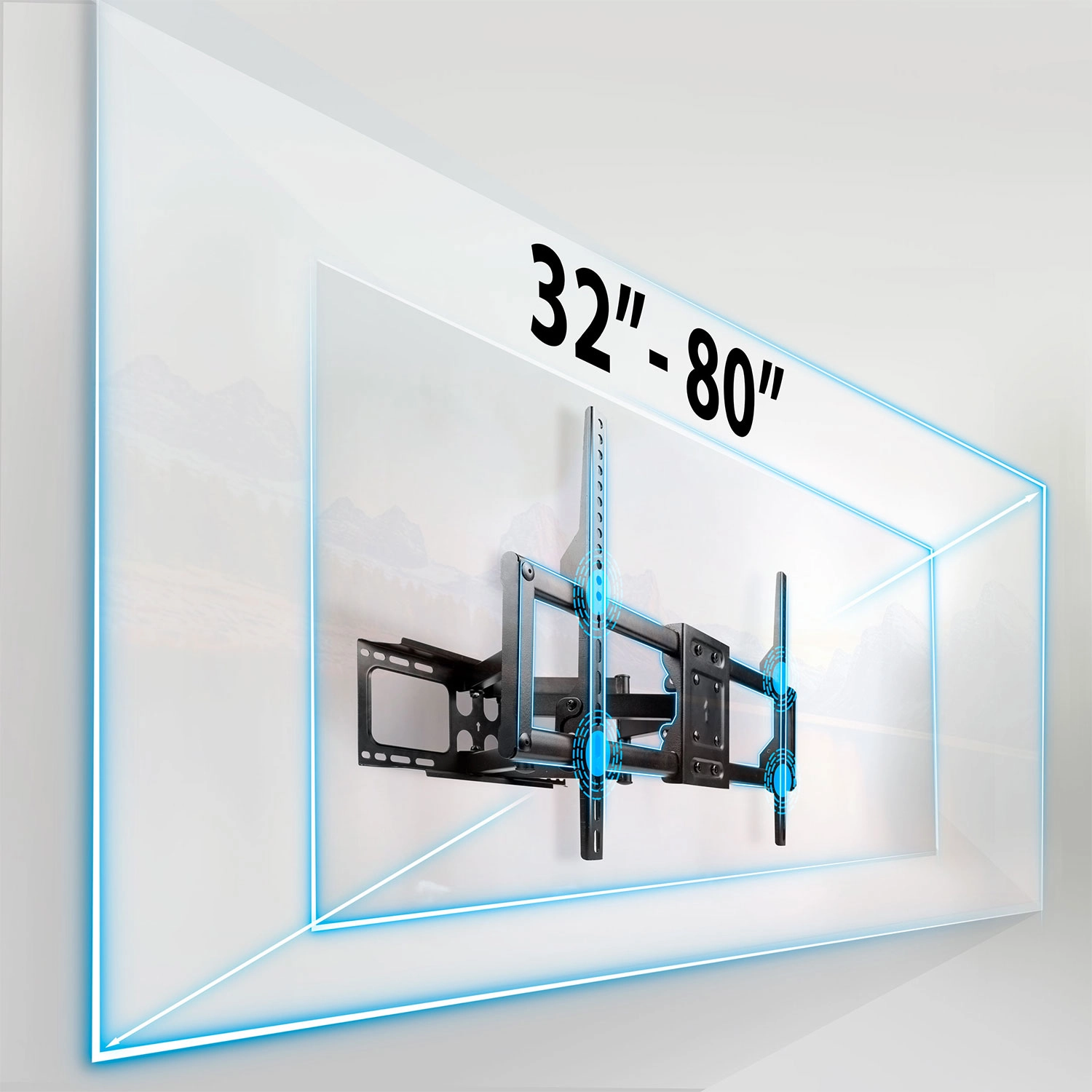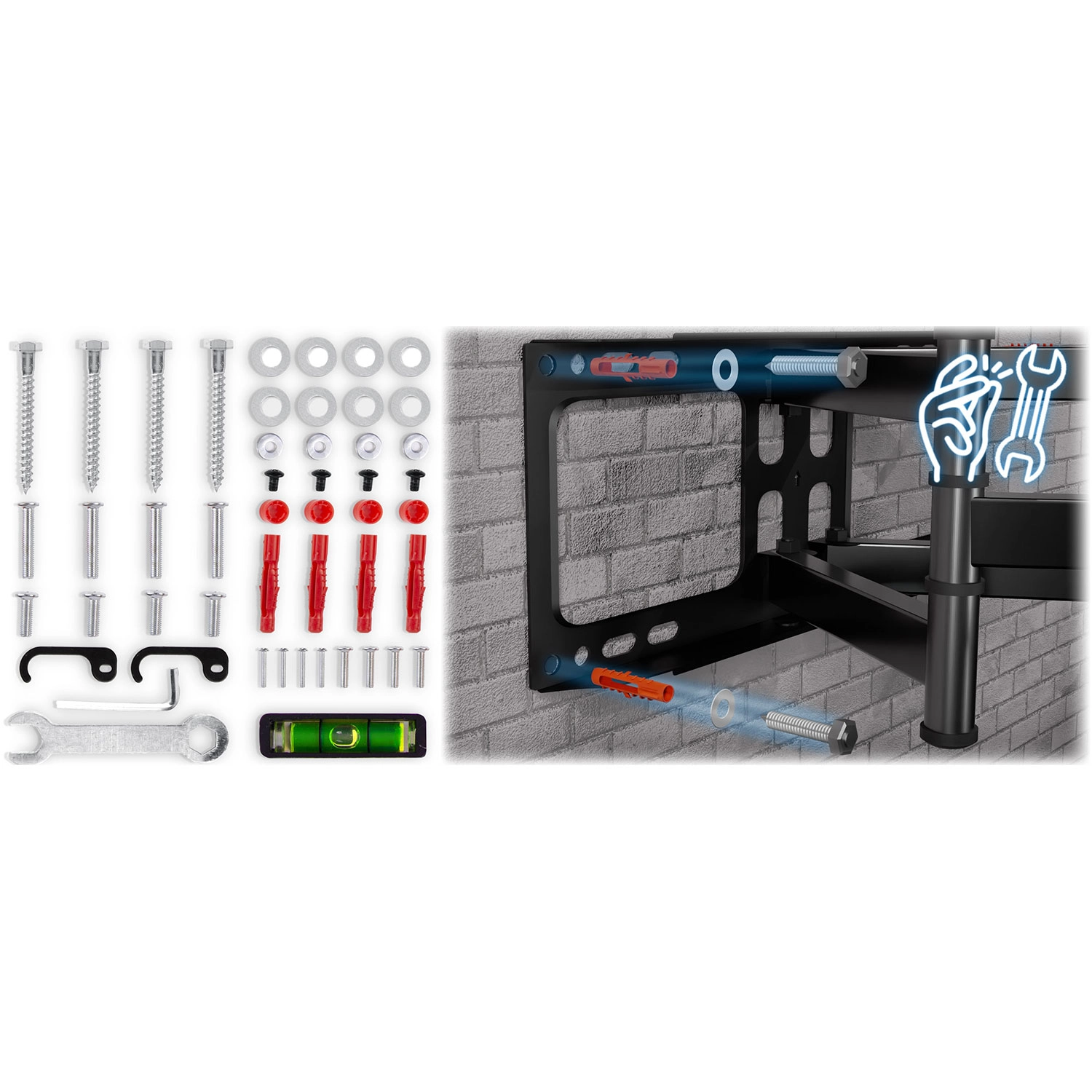 Združljivost VESA 200×200 do 600×400 pokriva večino televizorjev 32–80". V paketu najdete popoln montažni komplet, vključno z vložki, vijaki, podložkami, ključem in miniaturno vodno tehtnico za natančno in hitro namestitev na betonske, mavčnokartonske in opečnate stene.