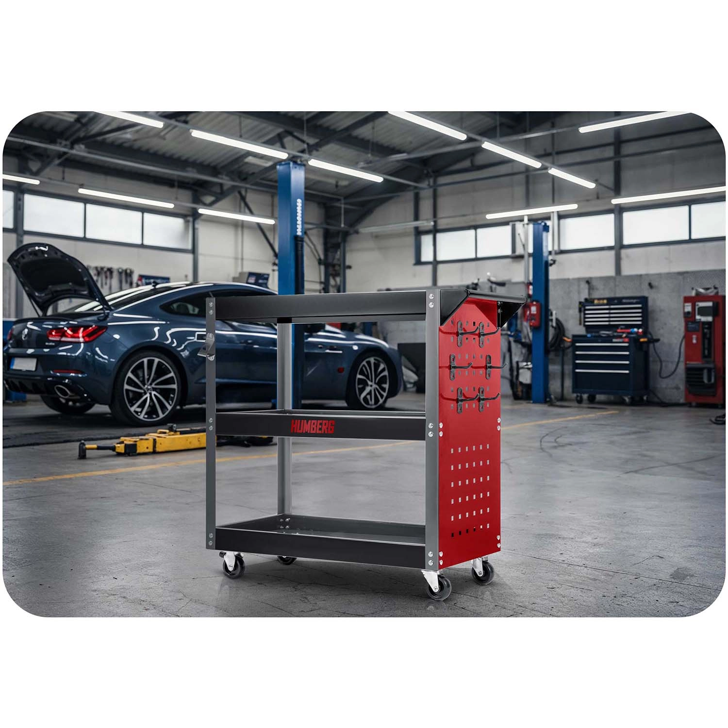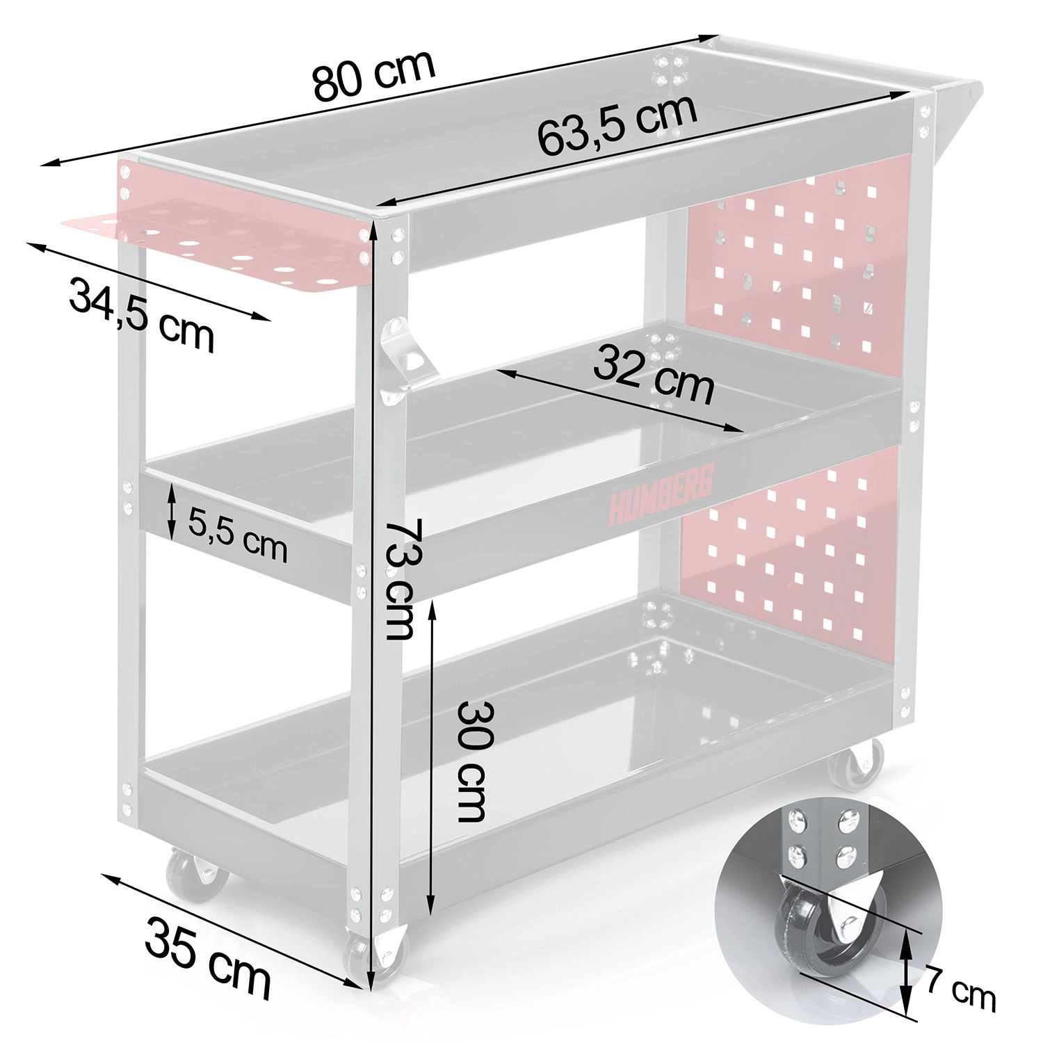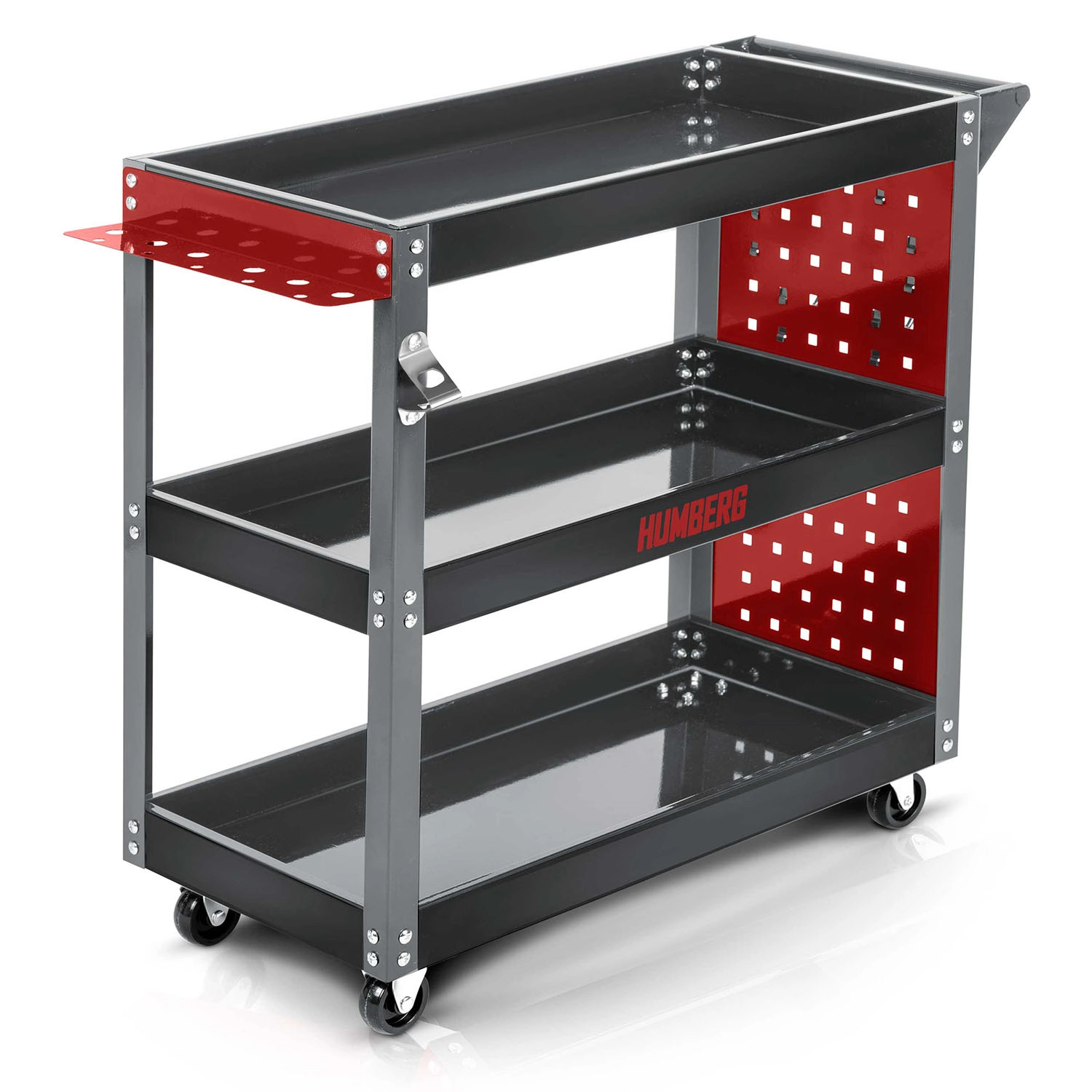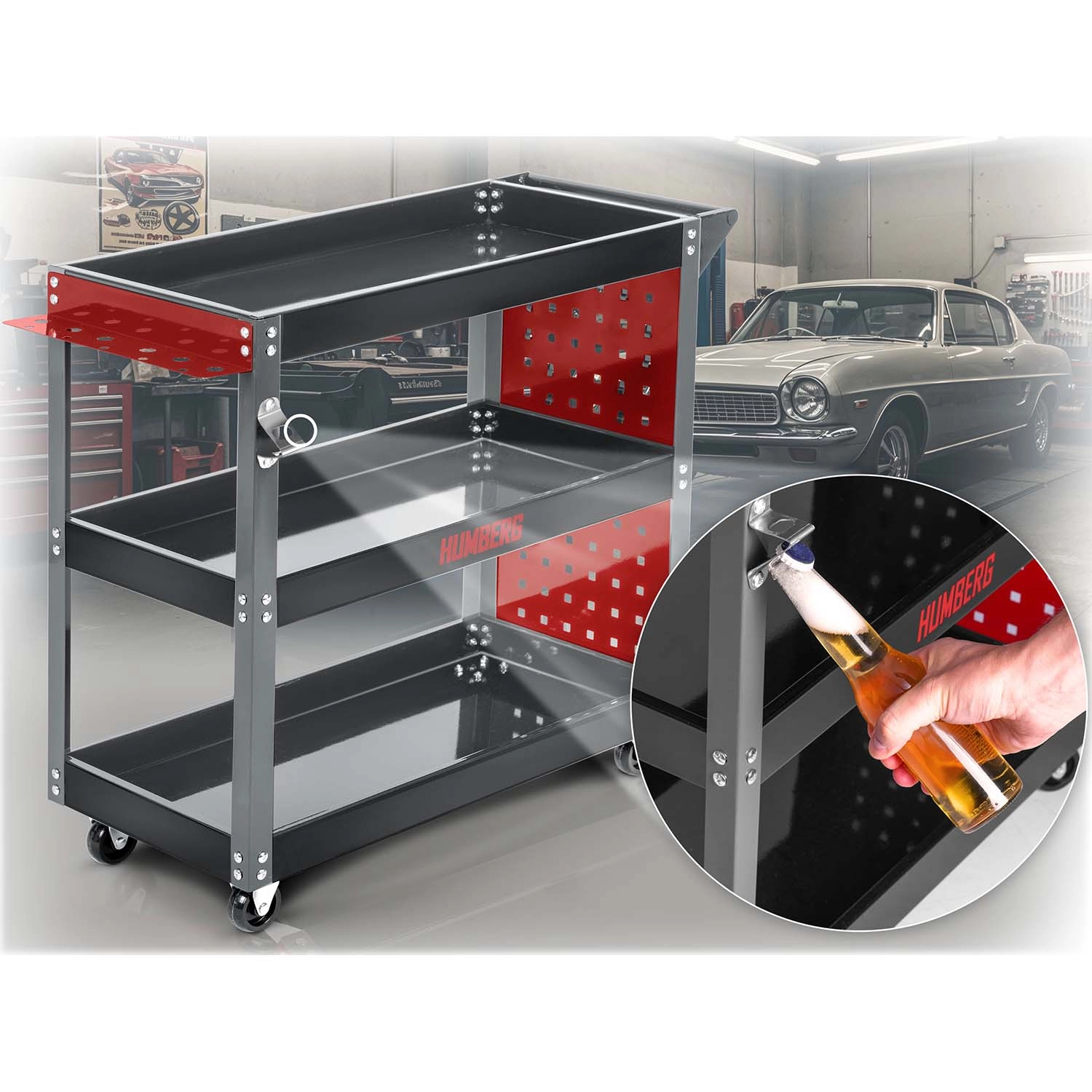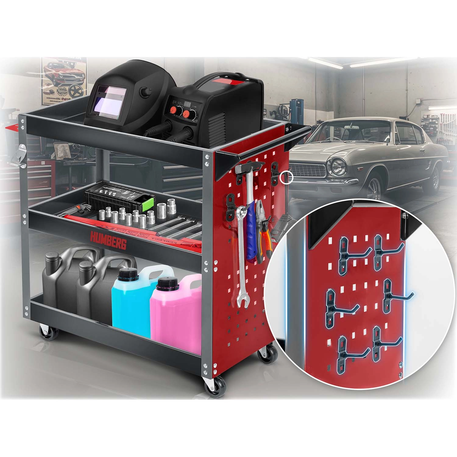 Voziček HUMBERG je zasnovan za zahtevna delavniška okolja. Kombinira nerjavno jeklo in aluminij za visoko odpornost in dolgo življenjsko dobo. Tri globoke police nudijo dovolj prostora za orodje, dele in dodatke, medtem ko perforirani stranski paneli s kljukami poskrbijo, da so pogosto uporabljena orodja vedno pri roki.