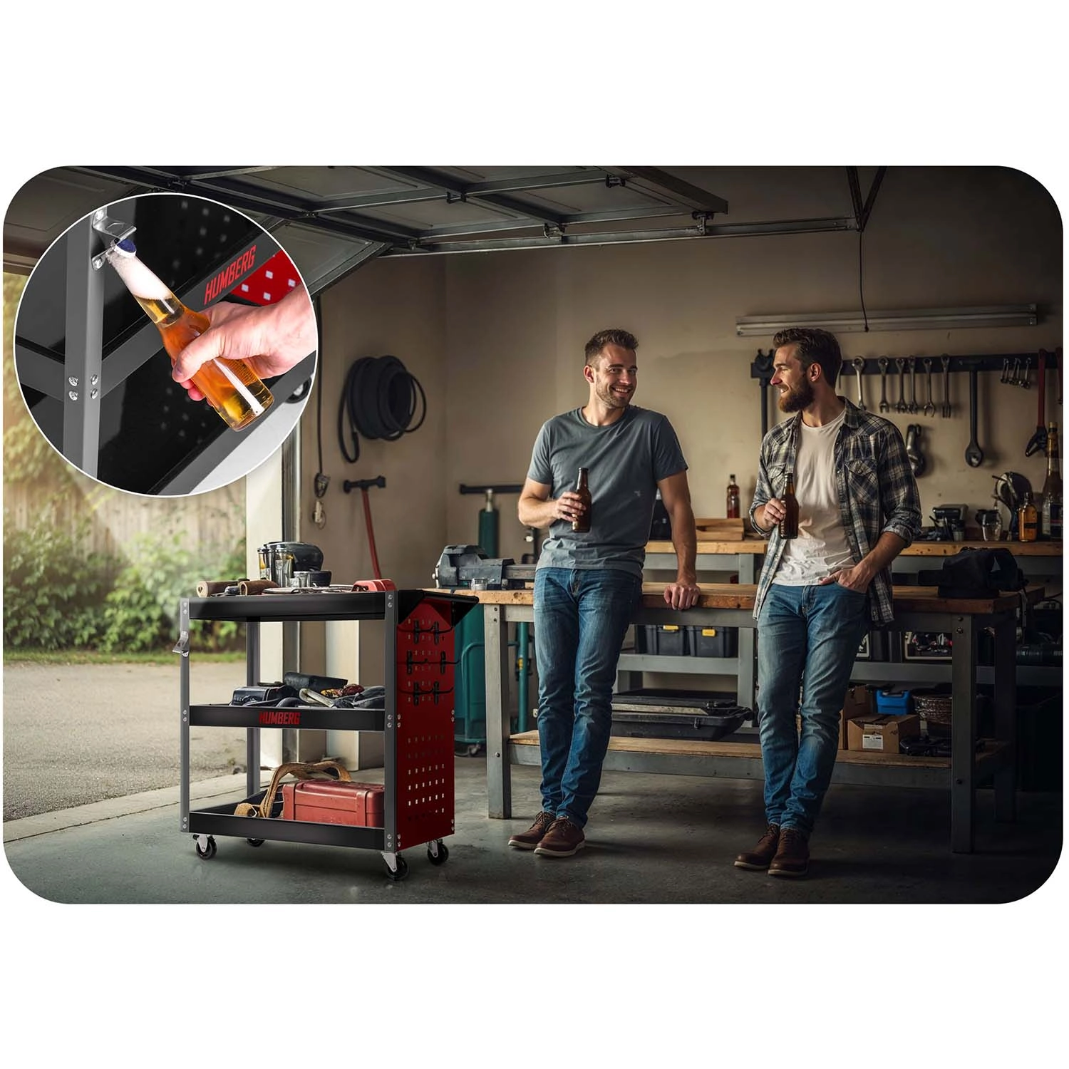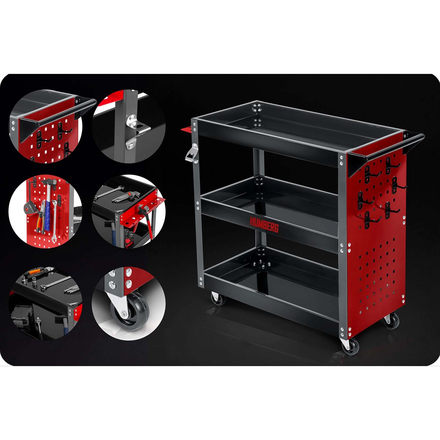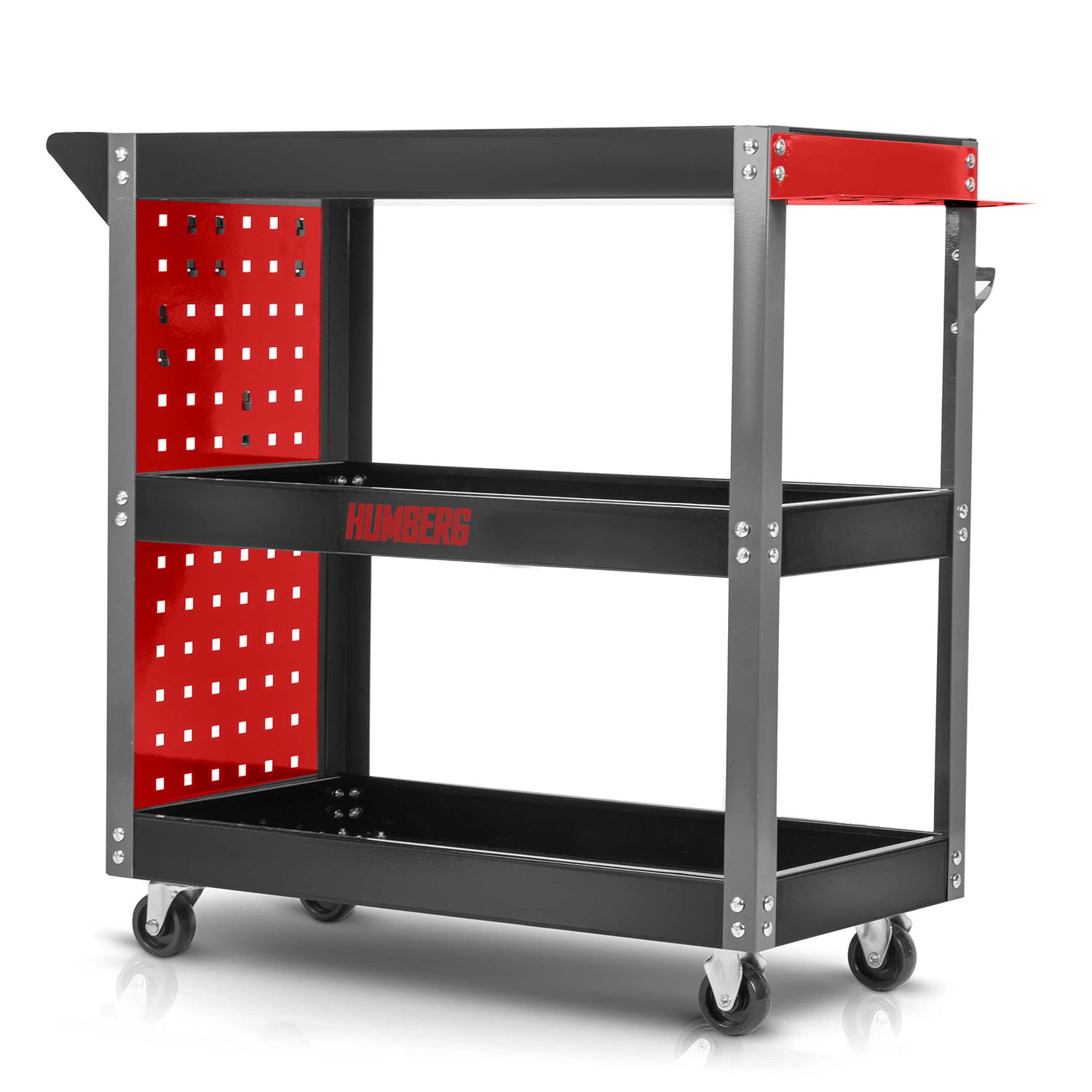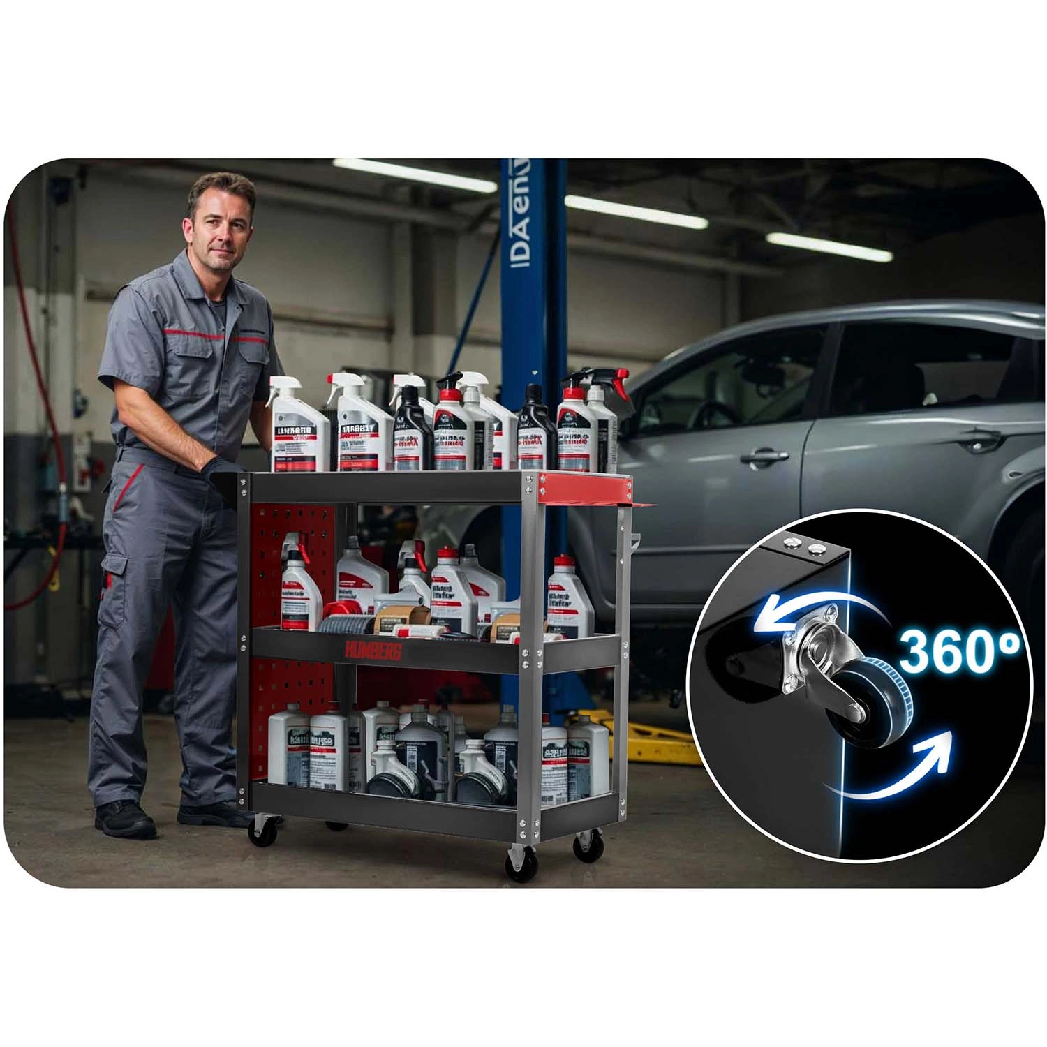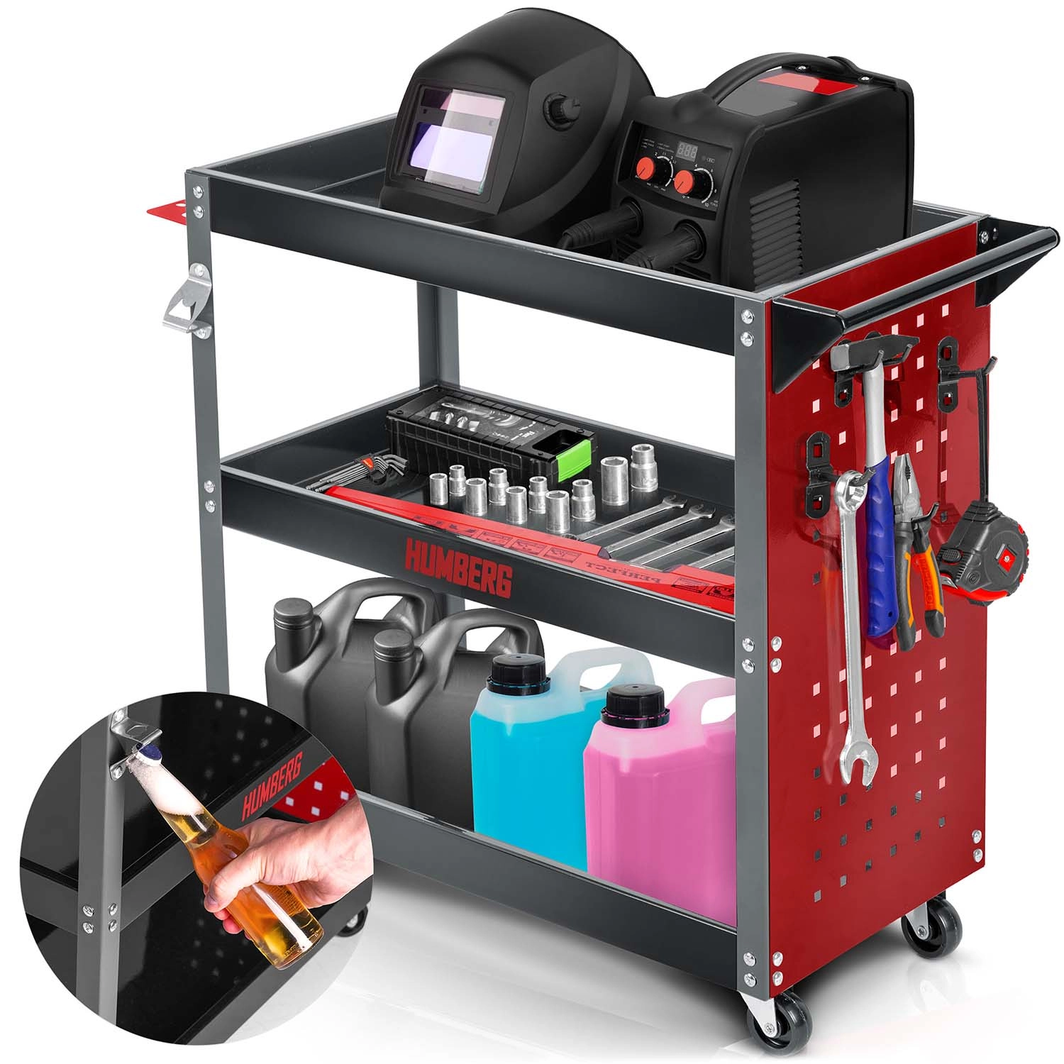 Voziček HUMBERG je zasnovan za zahtevna delavniška okolja. Kombinira nerjavno jeklo in aluminij za visoko odpornost in dolgo življenjsko dobo. Tri globoke police nudijo dovolj prostora za orodje, dele in dodatke, medtem ko perforirani stranski paneli s kljukami poskrbijo, da so pogosto uporabljena orodja vedno pri roki.