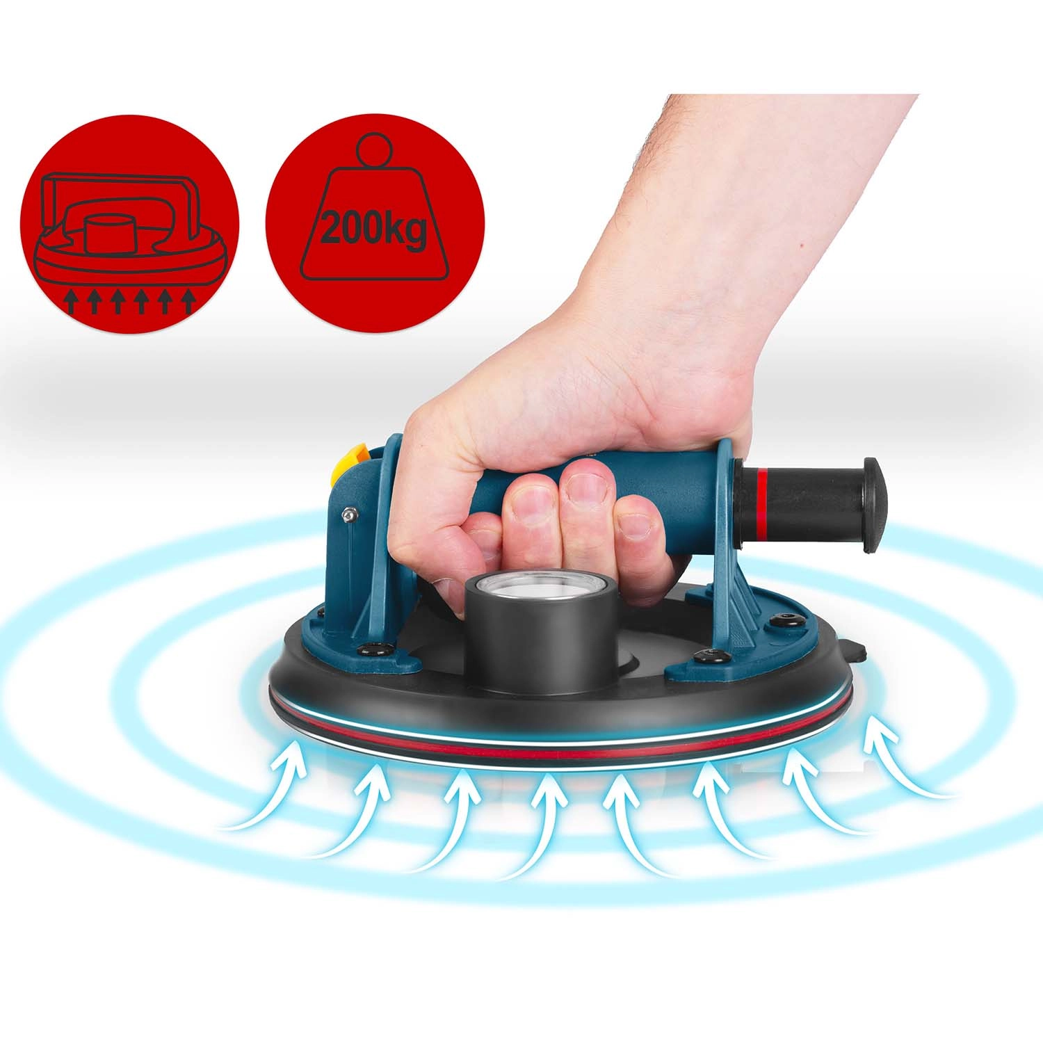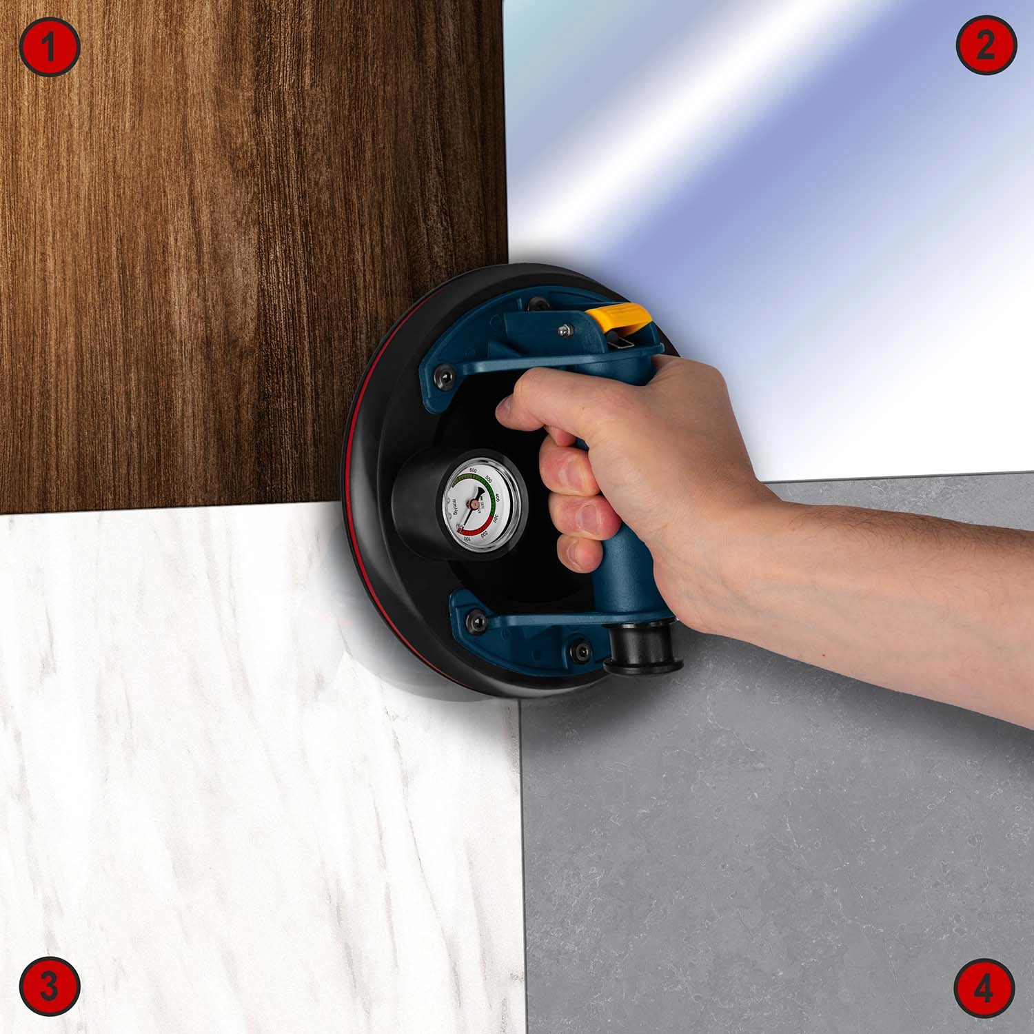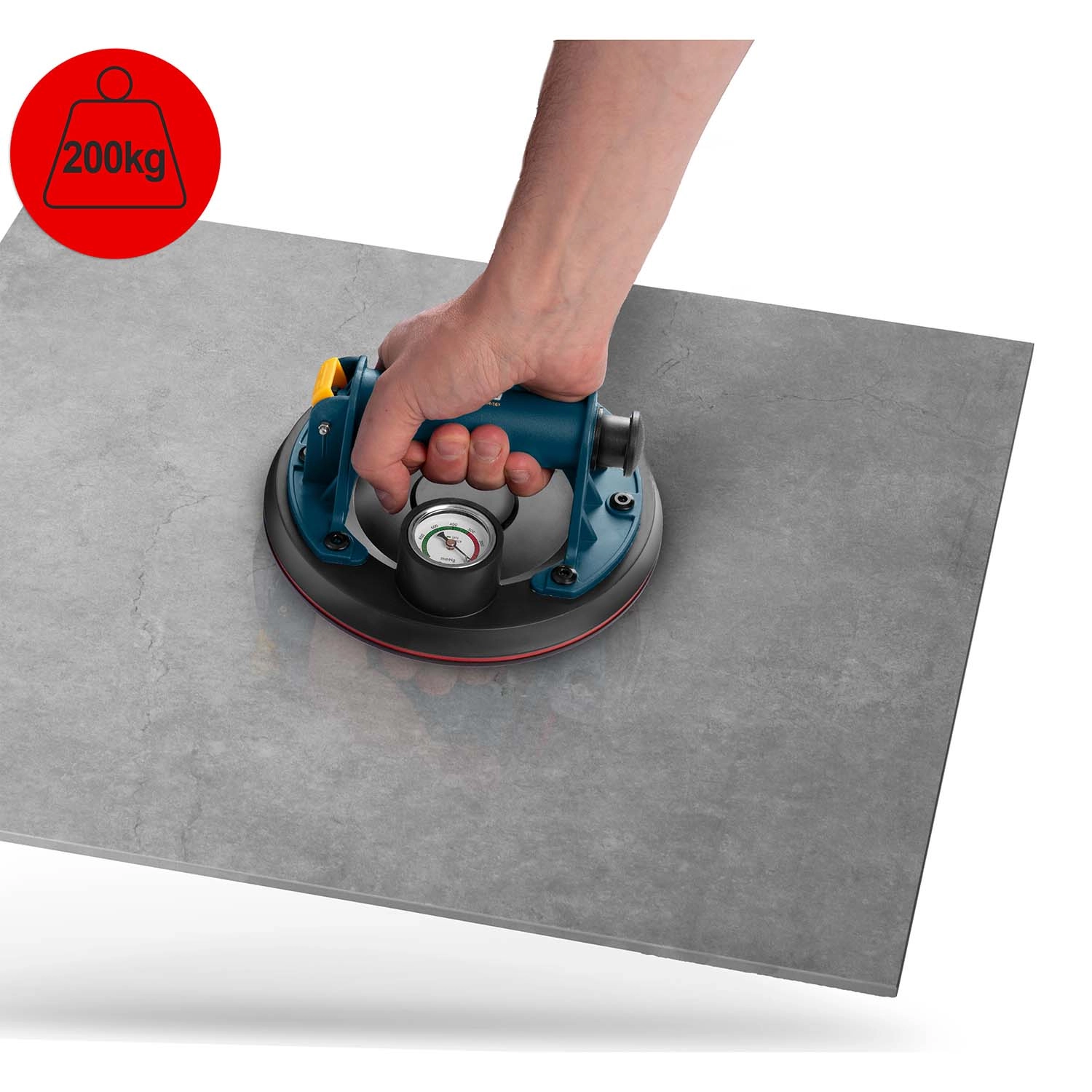 Močna vakuumska črpalka in robustna konstrukcija zagotavljata zanesljiv oprijem tudi pri velikih in težkih materialih, kot so steklo, ploščice ali poliran kamen.