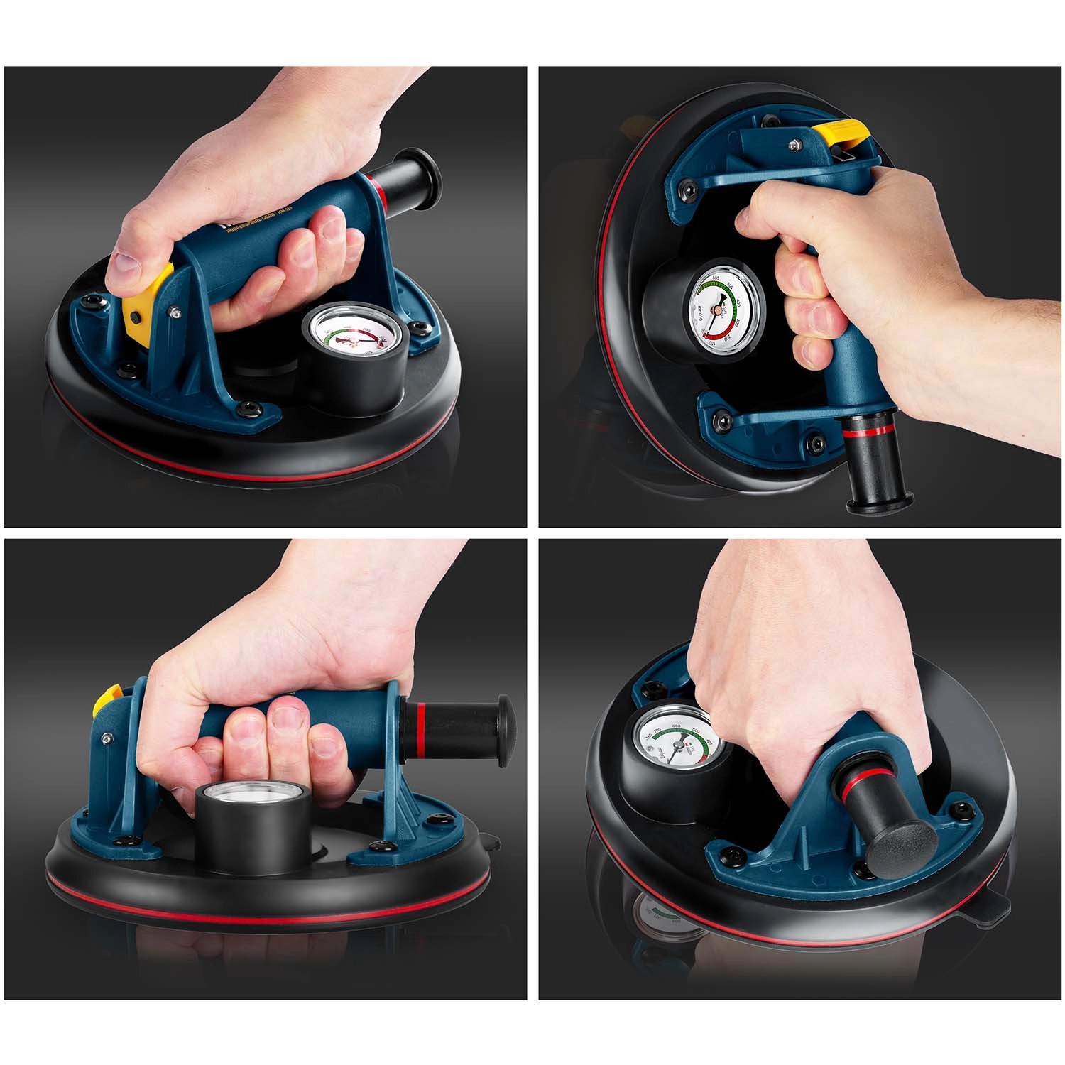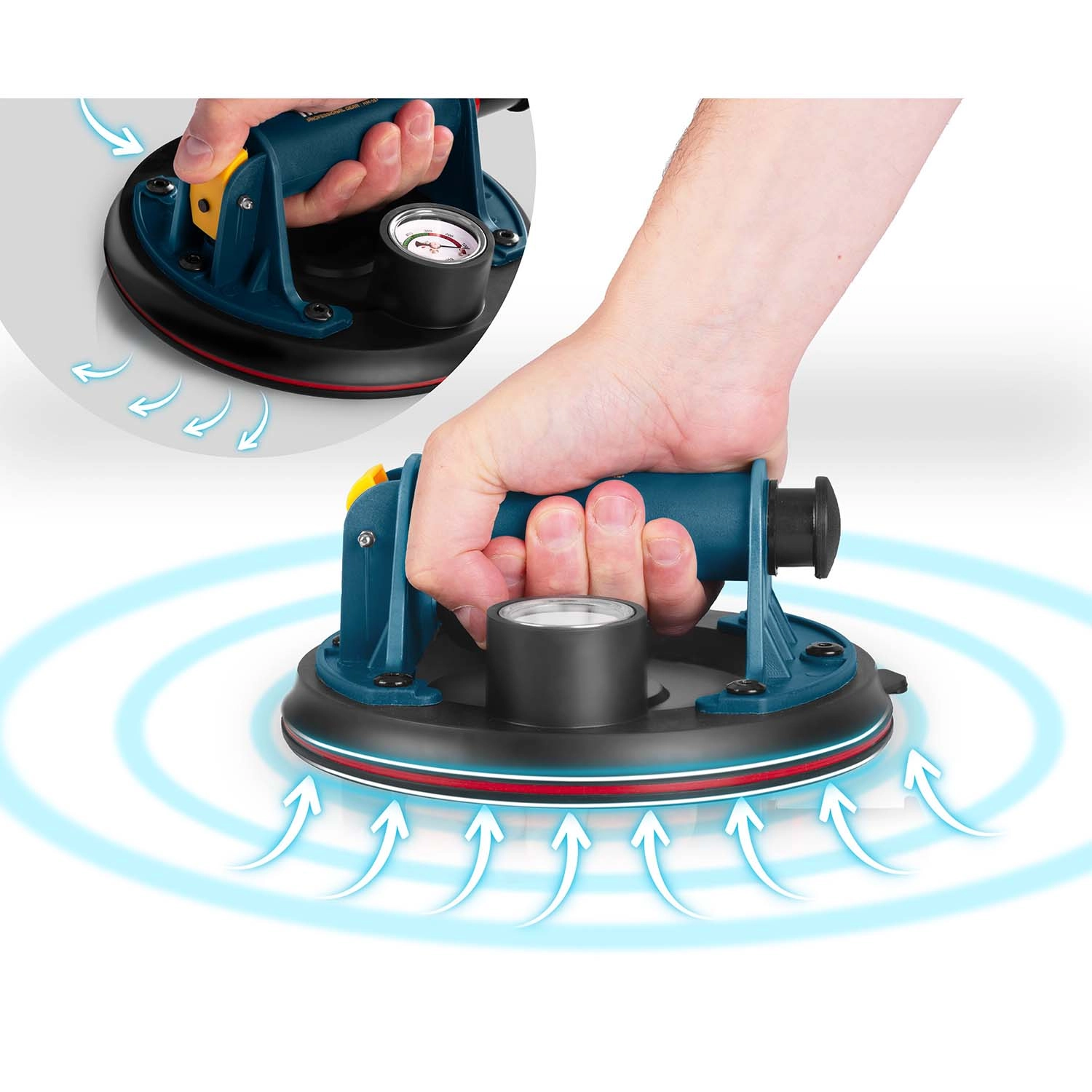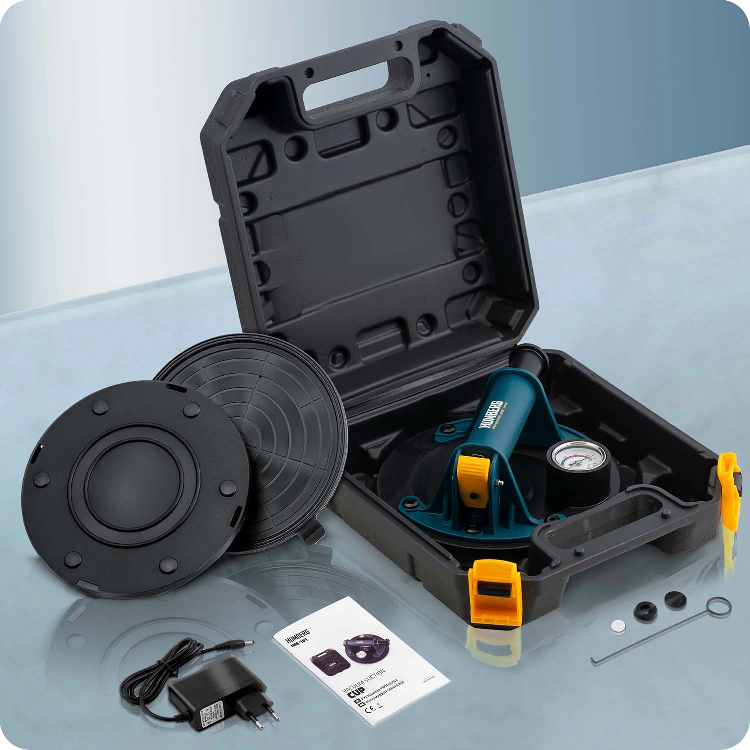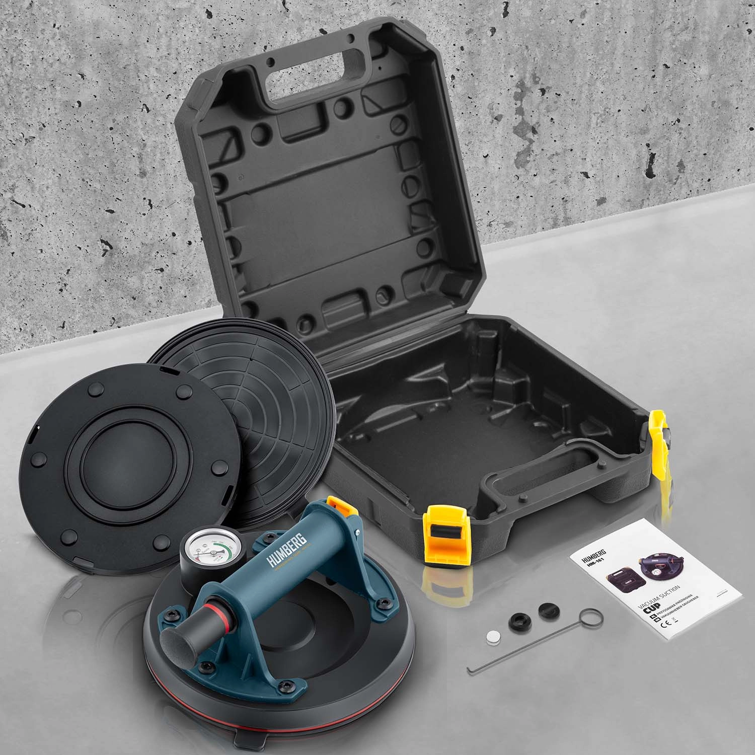 Močan, mobilen in zanesljiv vakuumski prisesek HUMBERG HM-161 je zasnovan za natančne montaže in varen transport težkih ter krhkih elementov, kot so steklo, velikoformatne ploščice, kamen ali lakirani paneli. Ročna črpalka hitro ustvari stabilen podtlak, ki trdno pritrdi prisesek na material.