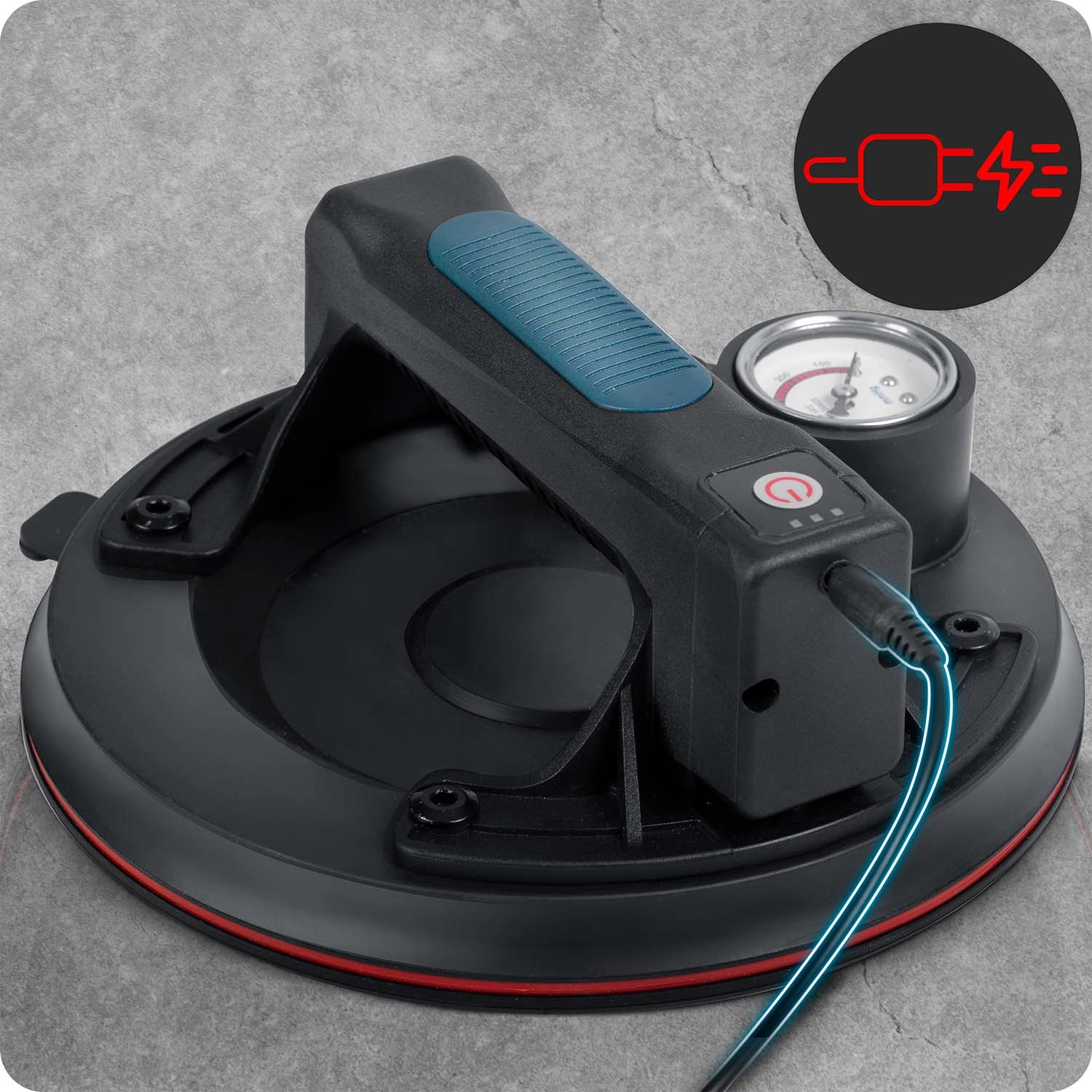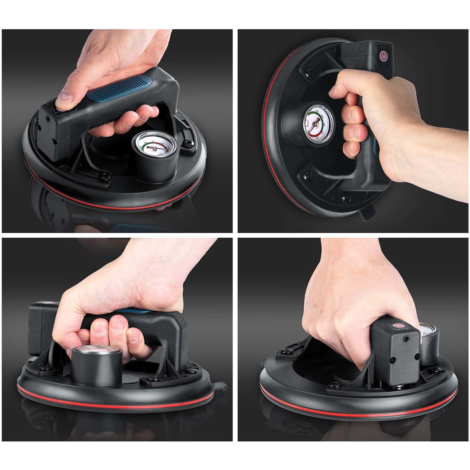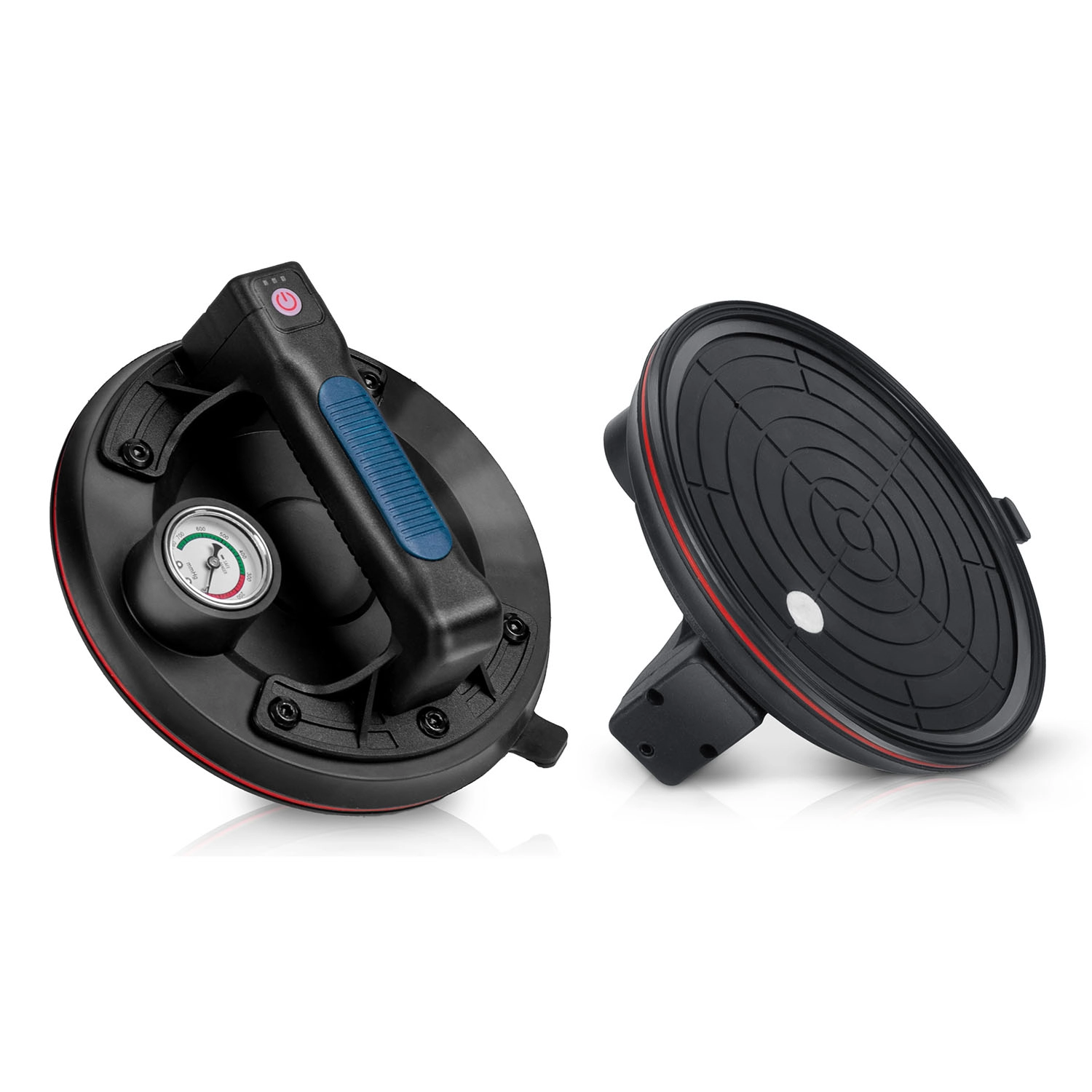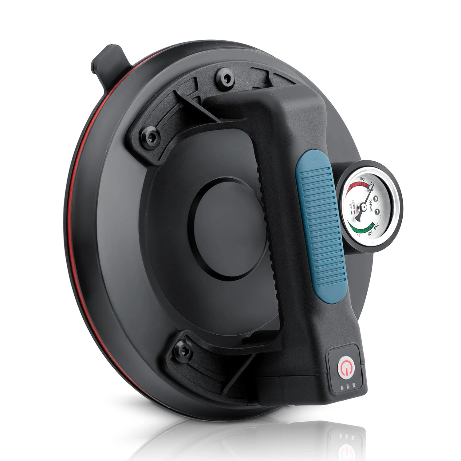 Ta kompaktna električna prisesalka je zasnovana za hitro in varno rokovanje s težkimi paneli, steklom, ploščicami ali poliranim kamnom. Trojna gumijasta tesnilna manšeta zagotavlja odličen oprijem, tesnjenje in dušenje vibracij, medtem ko manometer z barvno lestvico nudi stalen nadzor nad ravnjo podtlaka (optimalno 300–760 mmHg). Ergonomski ročaj z oblikovanim oprijemom povečuje udobje tudi pri daljšem delu.