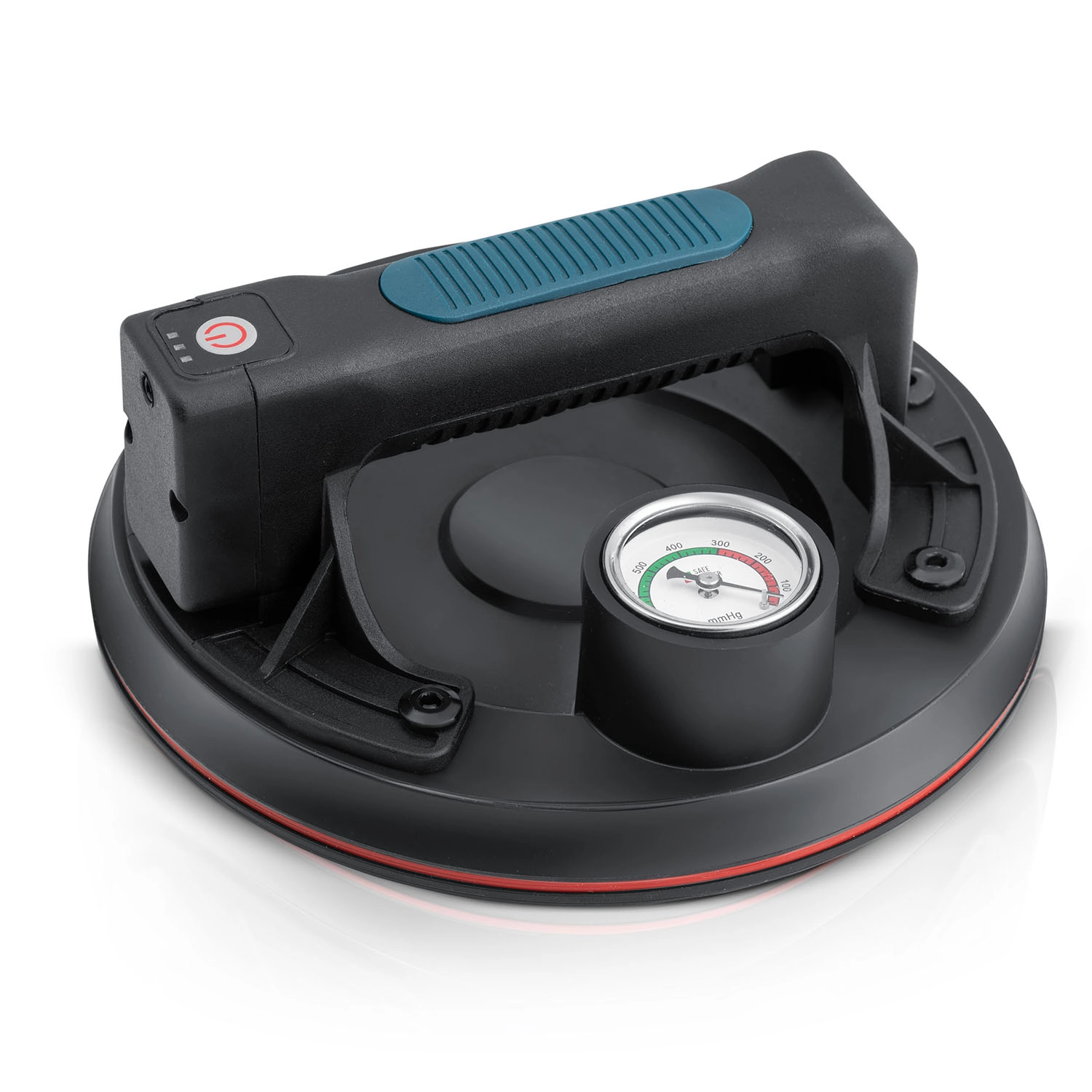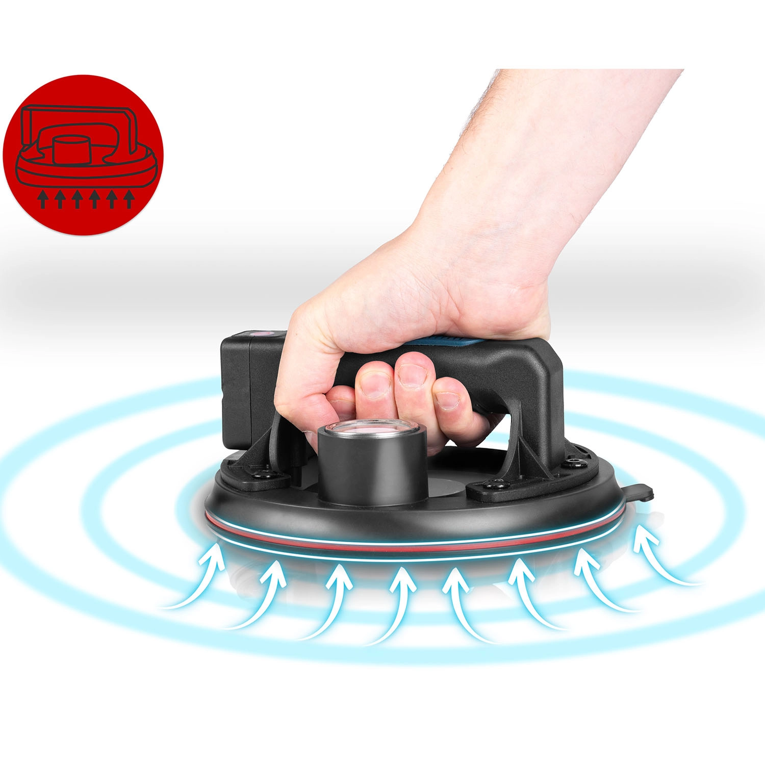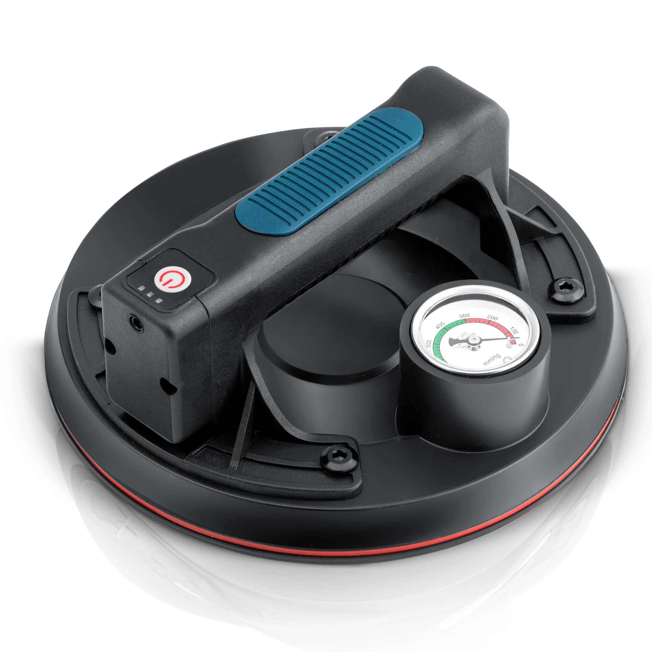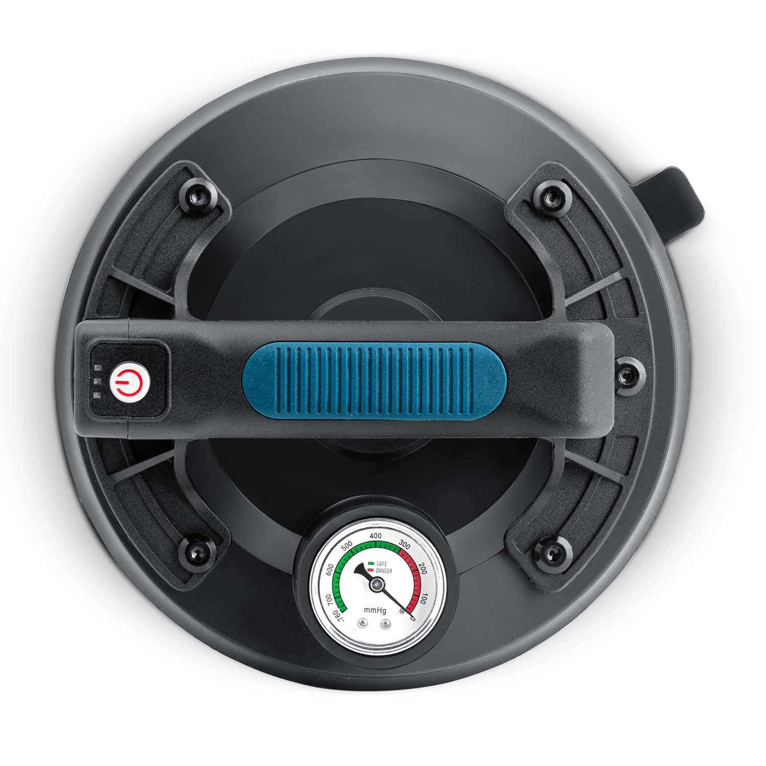 Ta kompaktna električna prisesalka je zasnovana za hitro in varno rokovanje s težkimi paneli, steklom, ploščicami ali poliranim kamnom. Trojna gumijasta tesnilna manšeta zagotavlja odličen oprijem, tesnjenje in dušenje vibracij, medtem ko manometer z barvno lestvico nudi stalen nadzor nad ravnjo podtlaka (optimalno 300–760 mmHg). Ergonomski ročaj z oblikovanim oprijemom povečuje udobje tudi pri daljšem delu.
