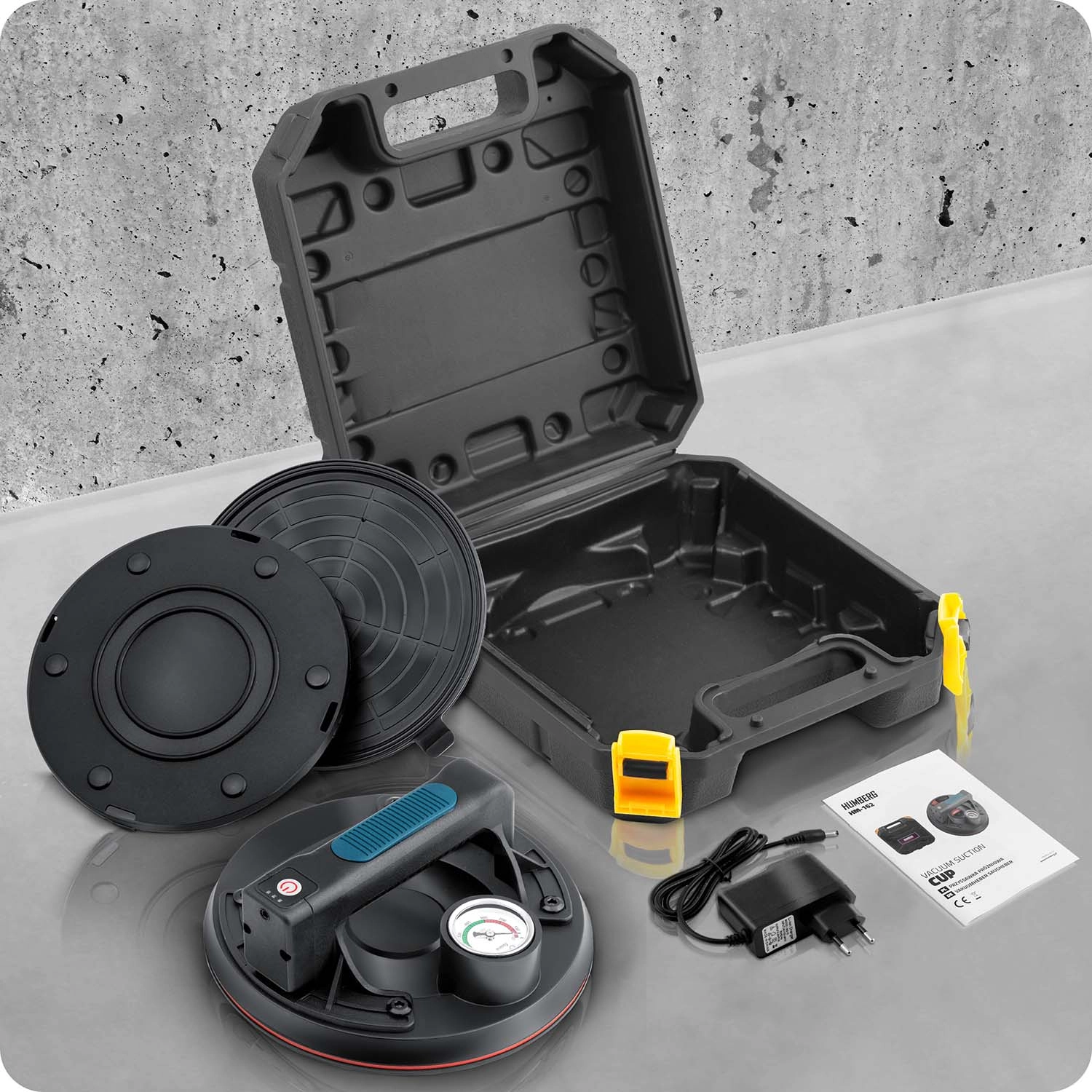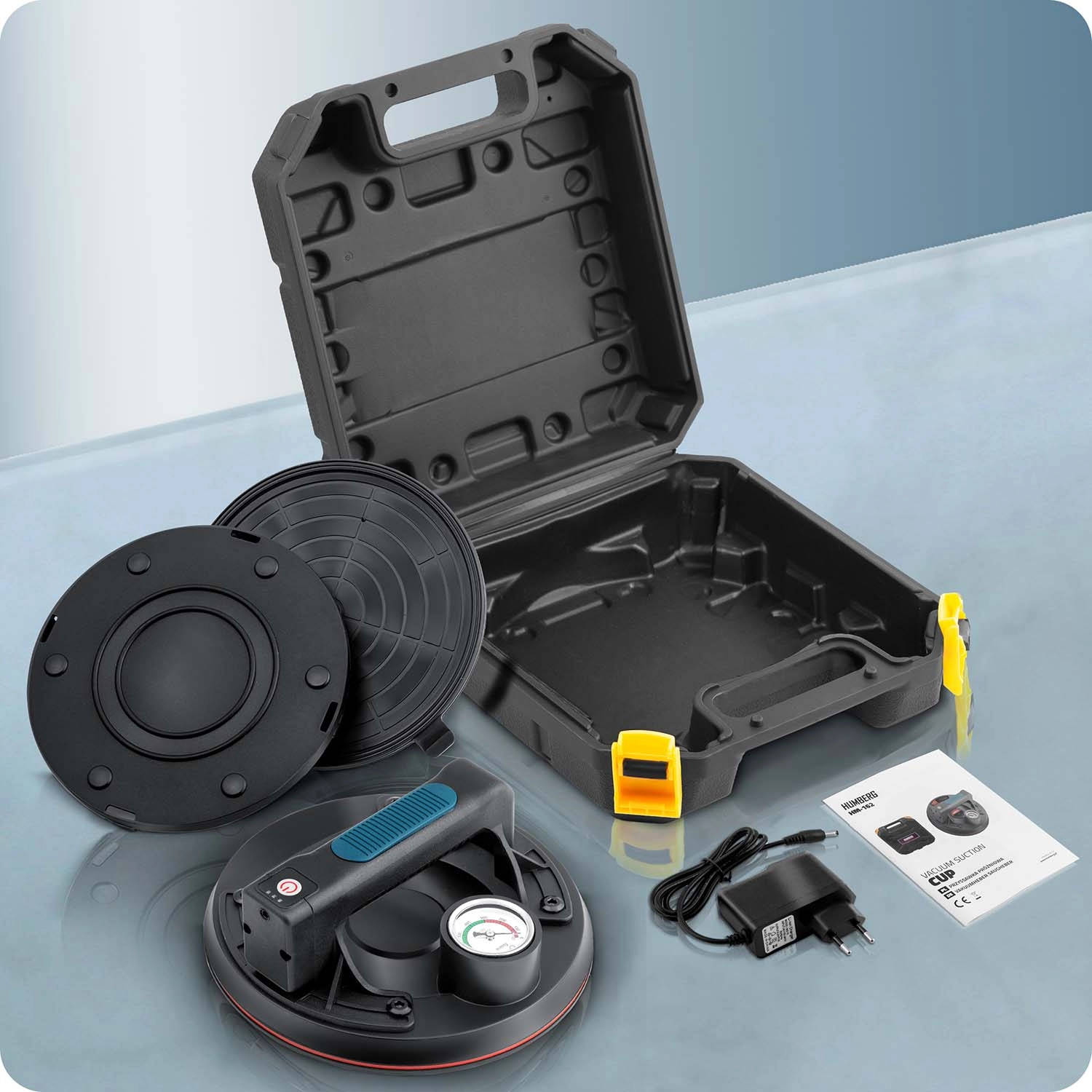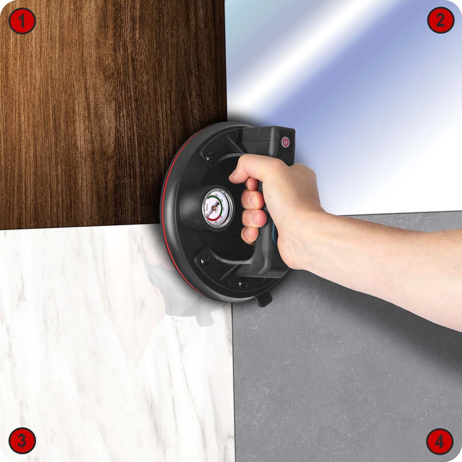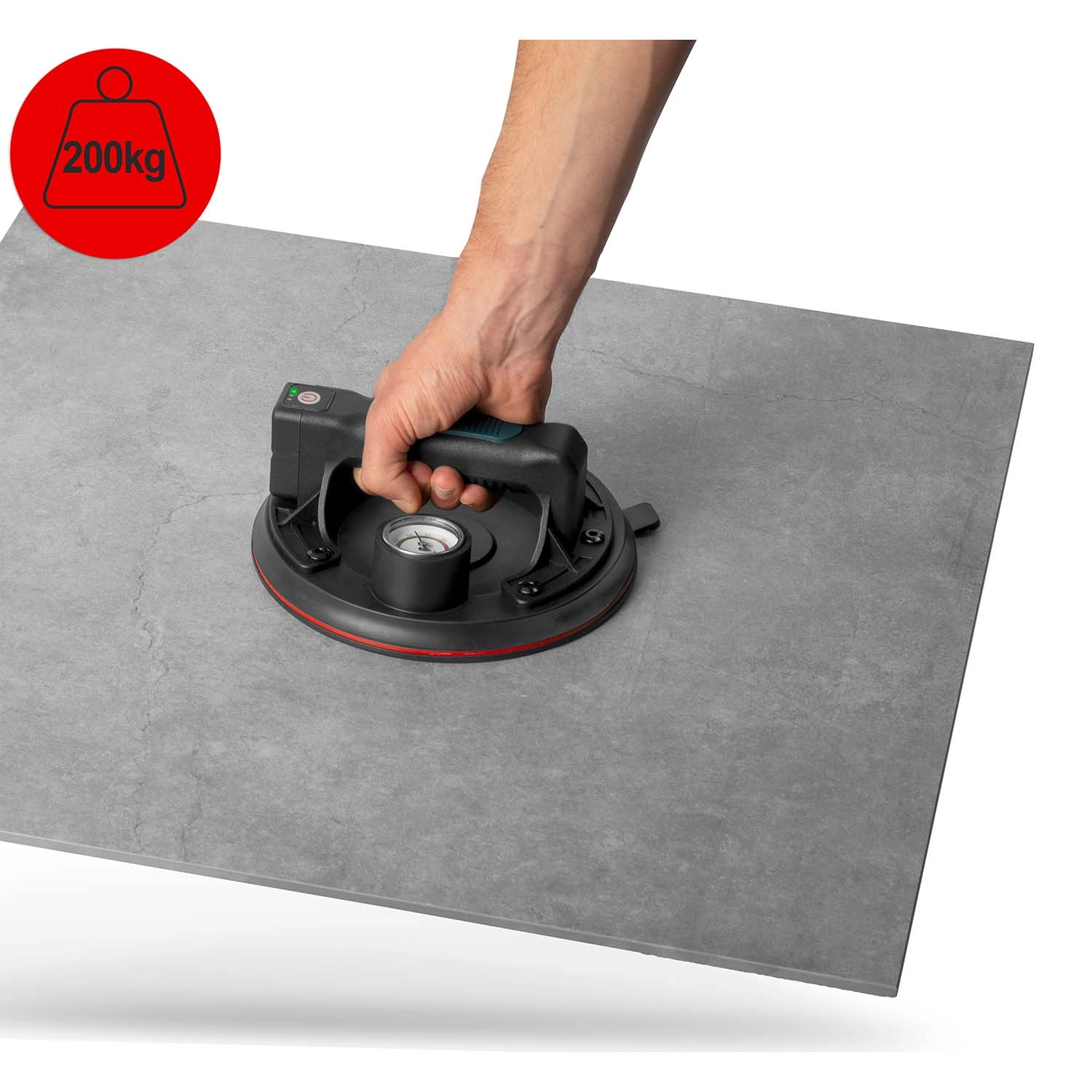 Ta kompaktna električna prisesalka je zasnovana za hitro in varno rokovanje s težkimi paneli, steklom, ploščicami ali poliranim kamnom. Trojna gumijasta tesnilna manšeta zagotavlja odličen oprijem, tesnjenje in dušenje vibracij, medtem ko manometer z barvno lestvico nudi stalen nadzor nad ravnjo podtlaka (optimalno 300–760 mmHg). Ergonomski ročaj z oblikovanim oprijemom povečuje udobje tudi pri daljšem delu.