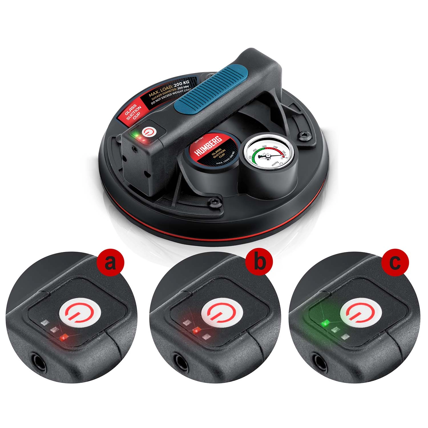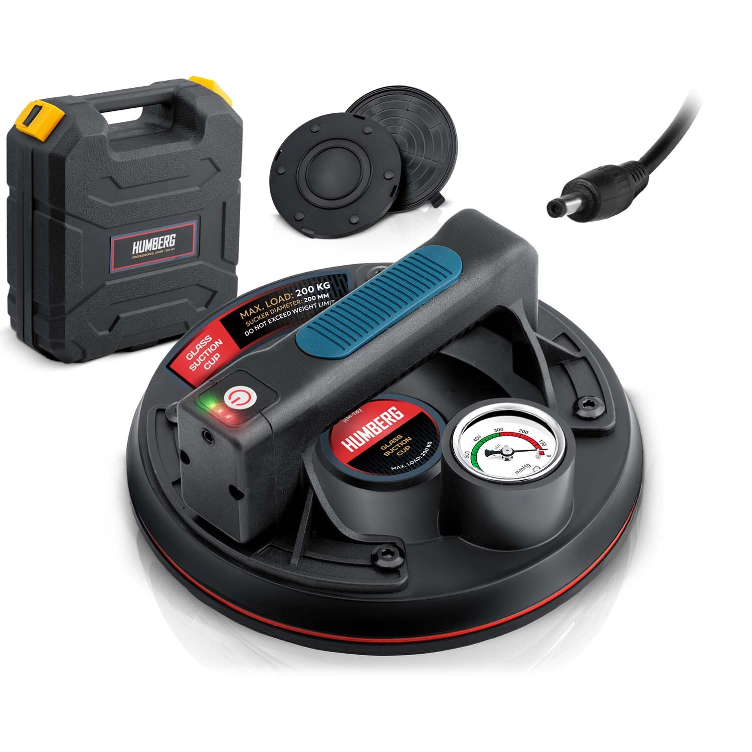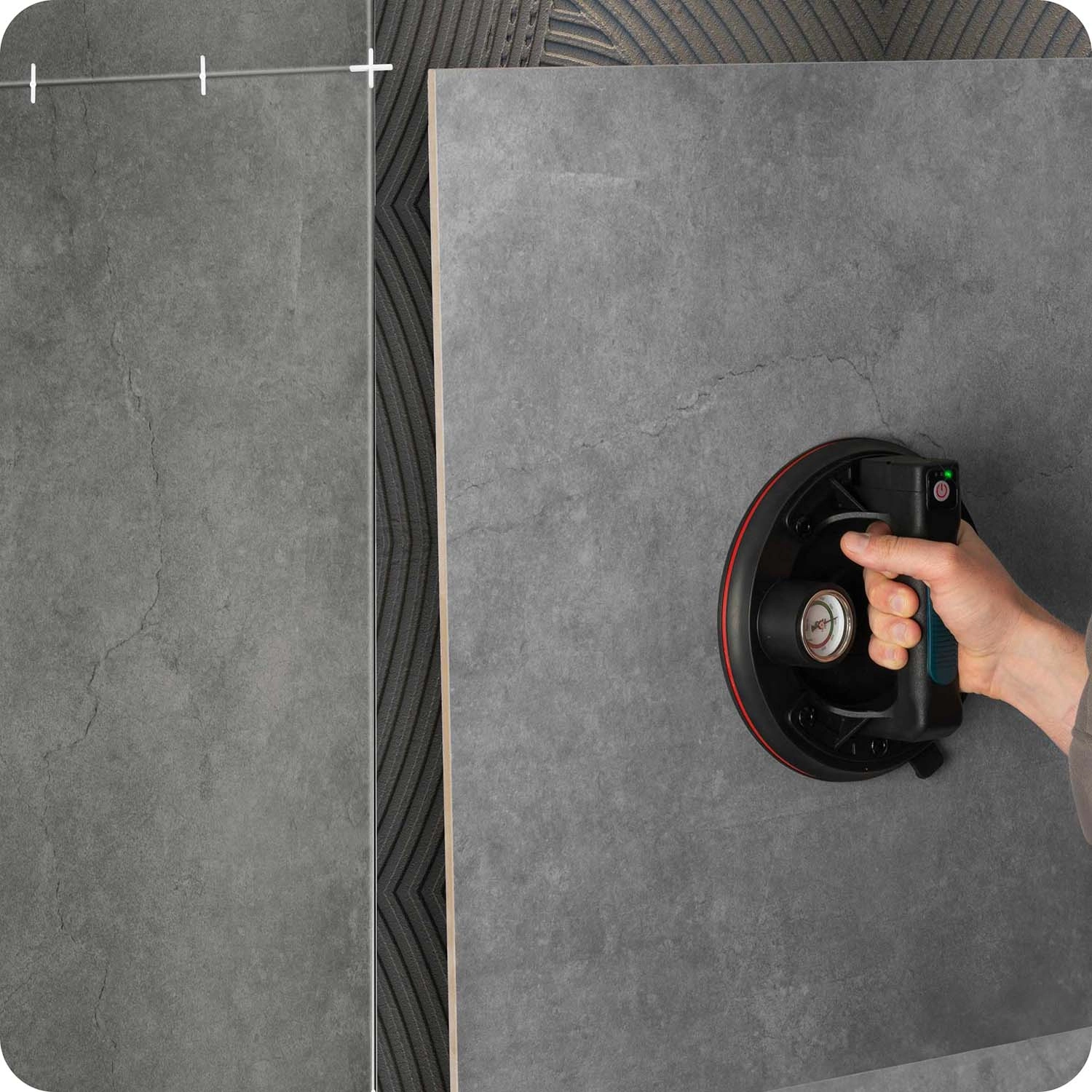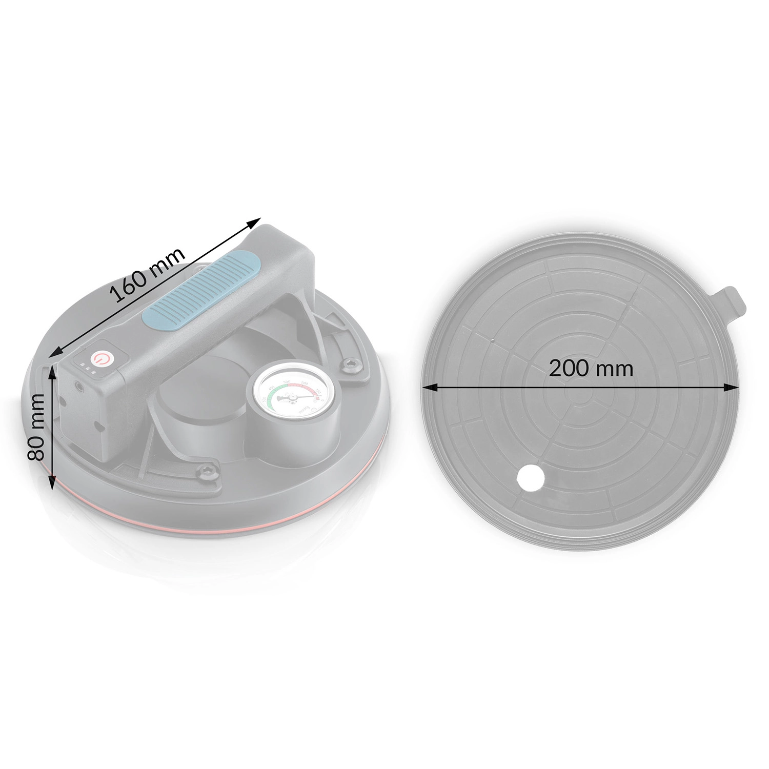 Ta kompaktna električna prisesalka je zasnovana za hitro in varno rokovanje s težkimi paneli, steklom, ploščicami ali poliranim kamnom. Trojna gumijasta tesnilna manšeta zagotavlja odličen oprijem, tesnjenje in dušenje vibracij, medtem ko manometer z barvno lestvico nudi stalen nadzor nad ravnjo podtlaka (optimalno 300–760 mmHg). Ergonomski ročaj z oblikovanim oprijemom povečuje udobje tudi pri daljšem delu.
