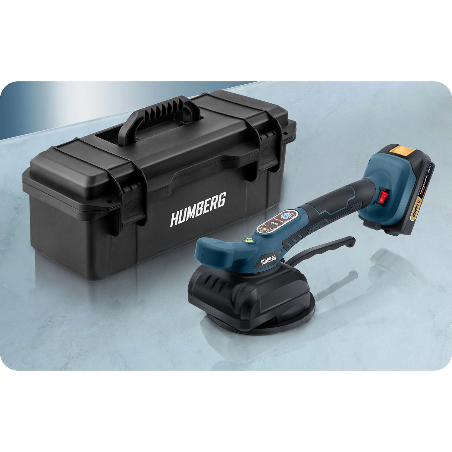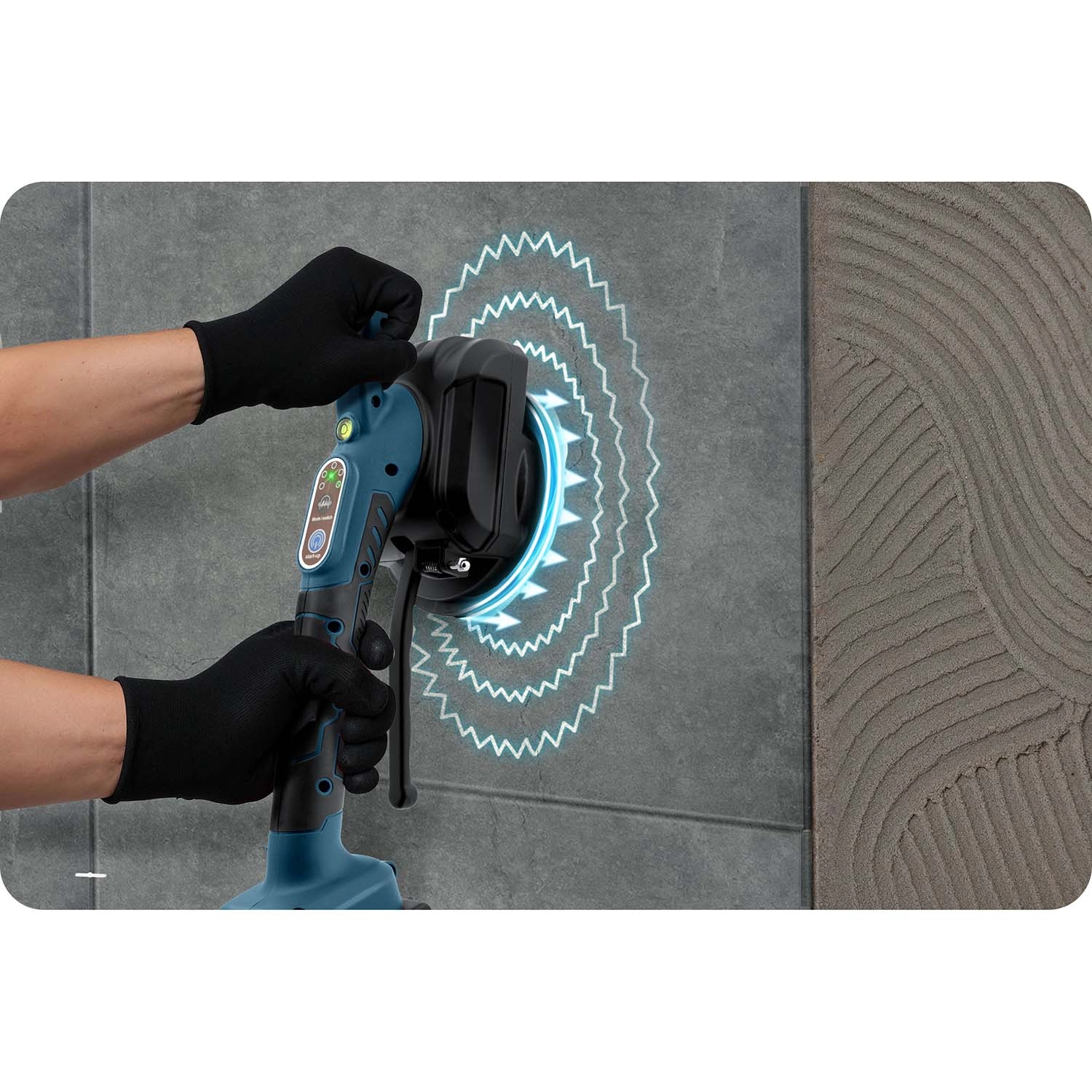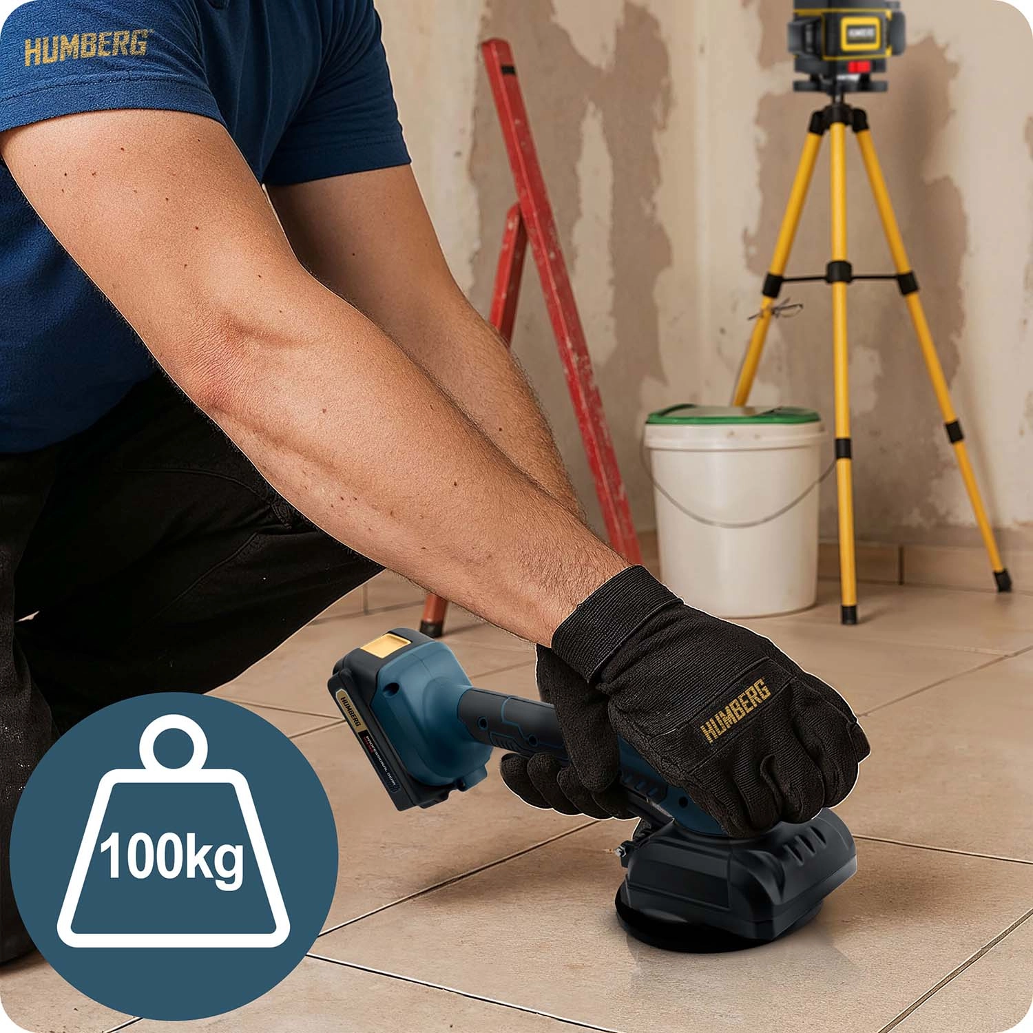 Profesionalna električna vibracijska prisesalka za ploščice HUMBERG z nosilnostjo do 100 kg pospeši montažo in prenos tako velikih formatov kot standardnih oblog. Ponuja 5 stopenj vibracij za natančno namestitev, dolgo avtonomijo do 240 minut z dvema akumulatorjema in hitro polnjenje 4–5 h. Zahvaljujoč močnemu podtlaku, vgrajeni libeli in naprednim varnostnim zaščitam boste delali hitreje, natančneje in brez tveganja poškodbe materiala.