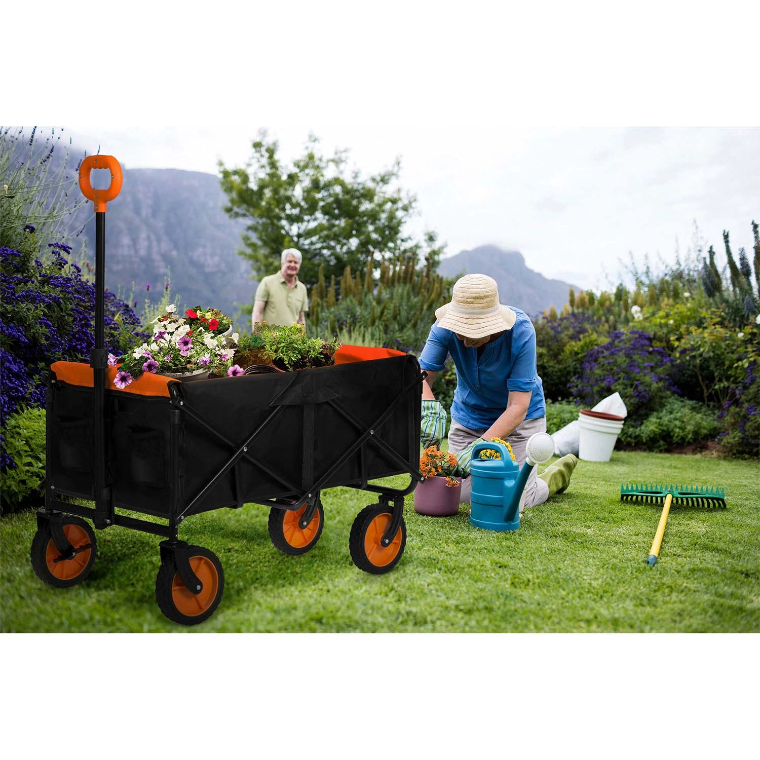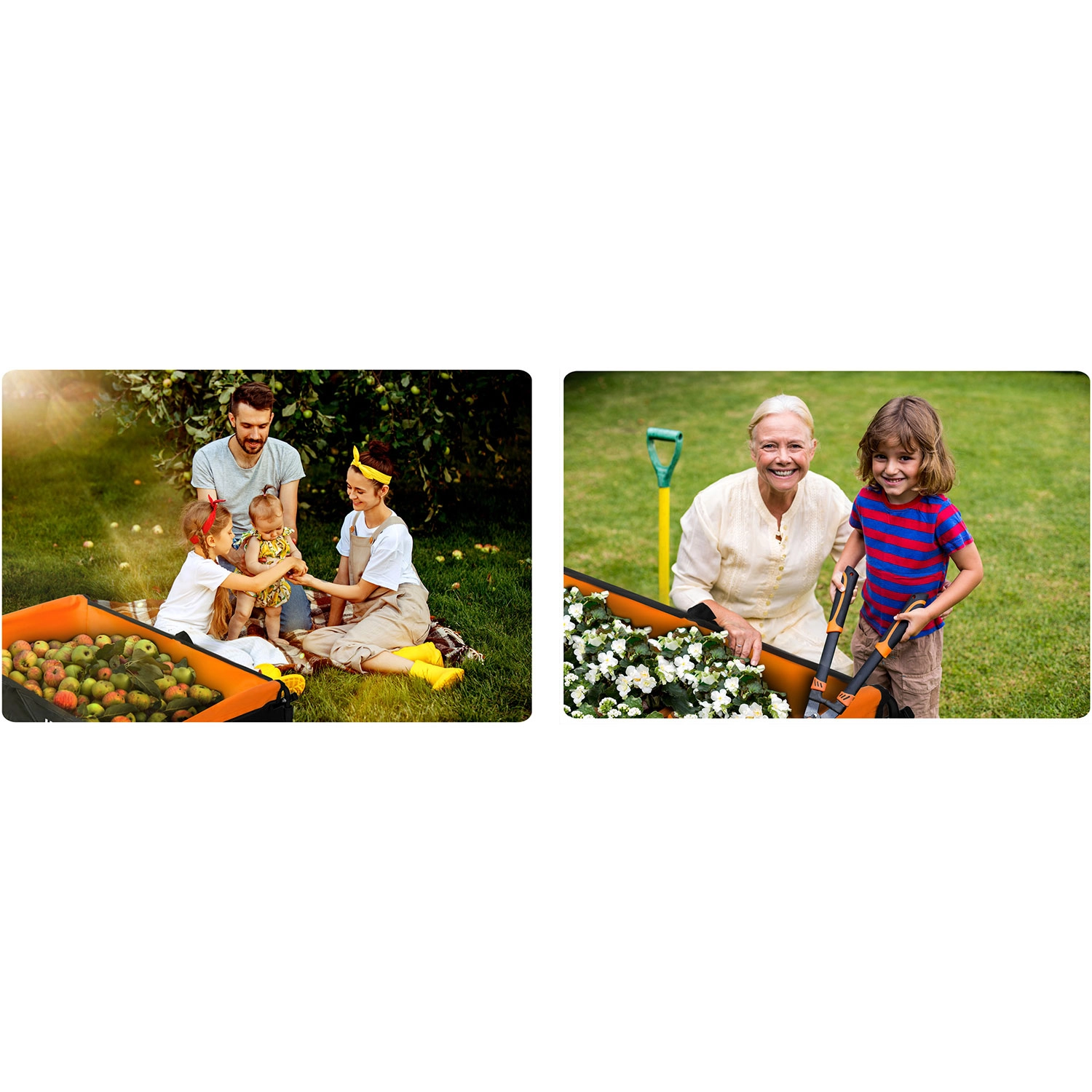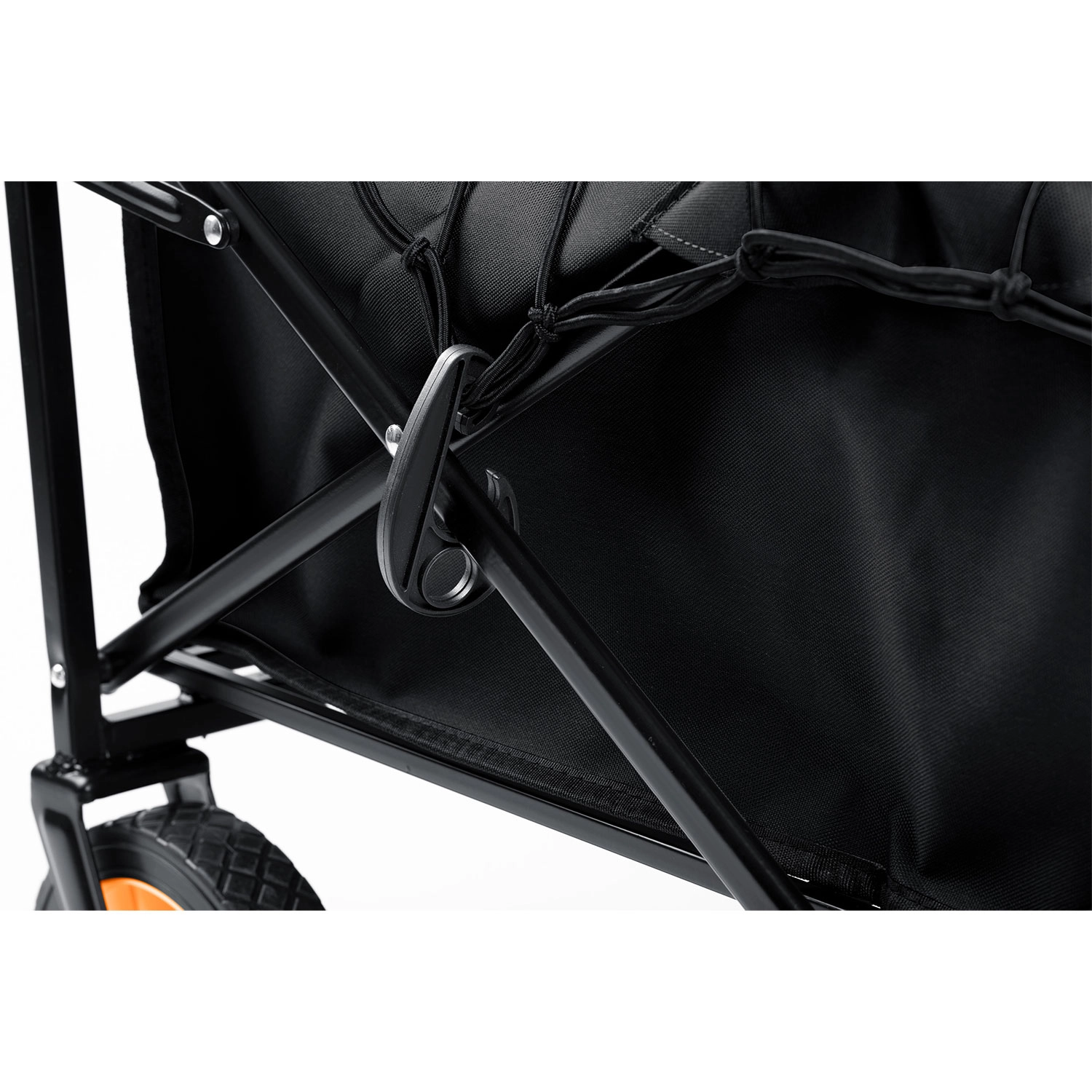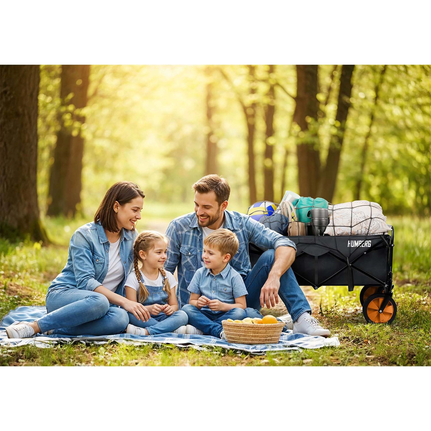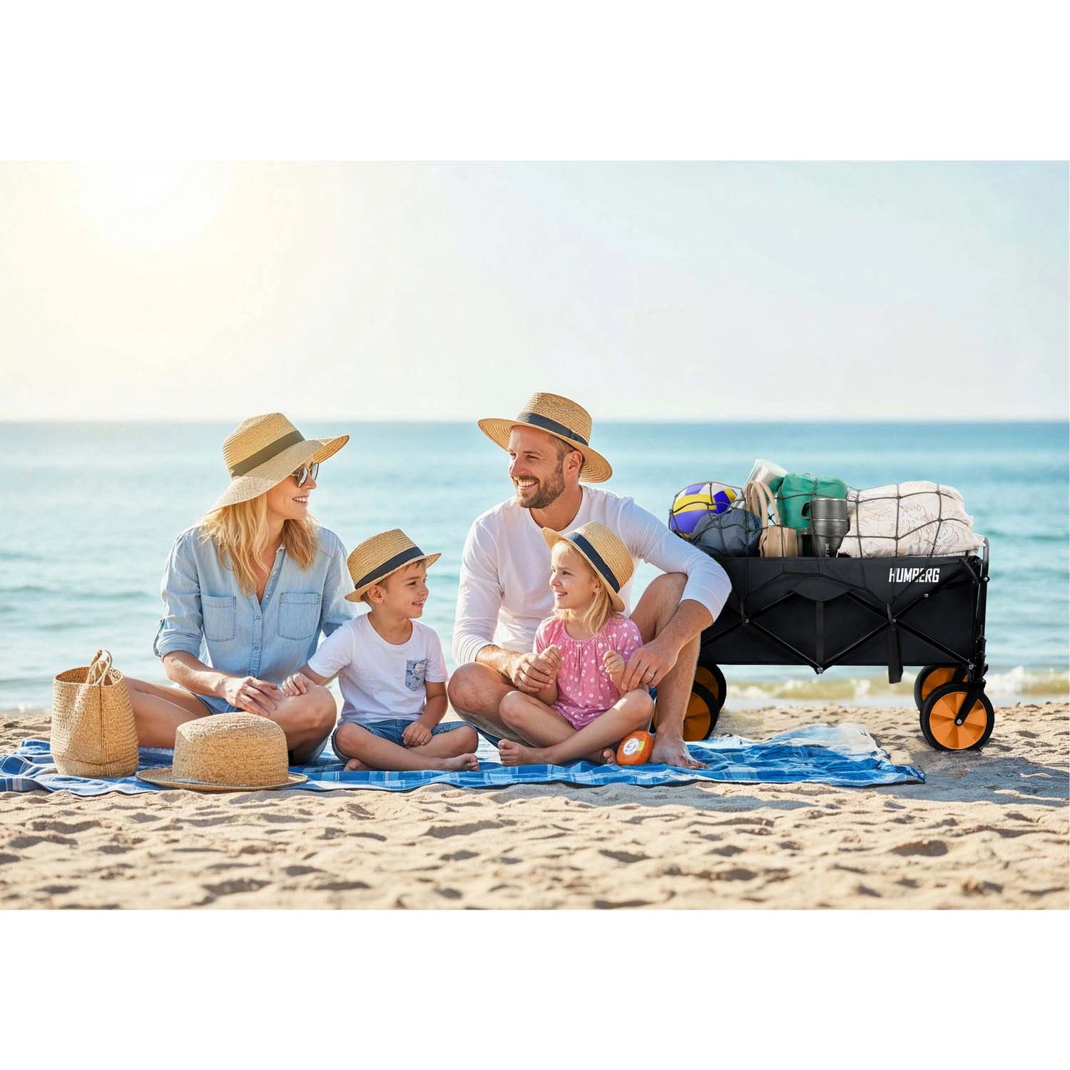 Praktičen zložljiv voziček HUMBERG s prostornino 100 l je idealen za vrt, kampiranje in izlete. Ima vzdržljiv jeklen okvir s prašnim lakiranjem, udoben ergonomski ročaj in samo sprednja vrtljiva kolesa za boljše manevriranje. Del paketa je elastična varovalna mreža proti izpadanju tovora.