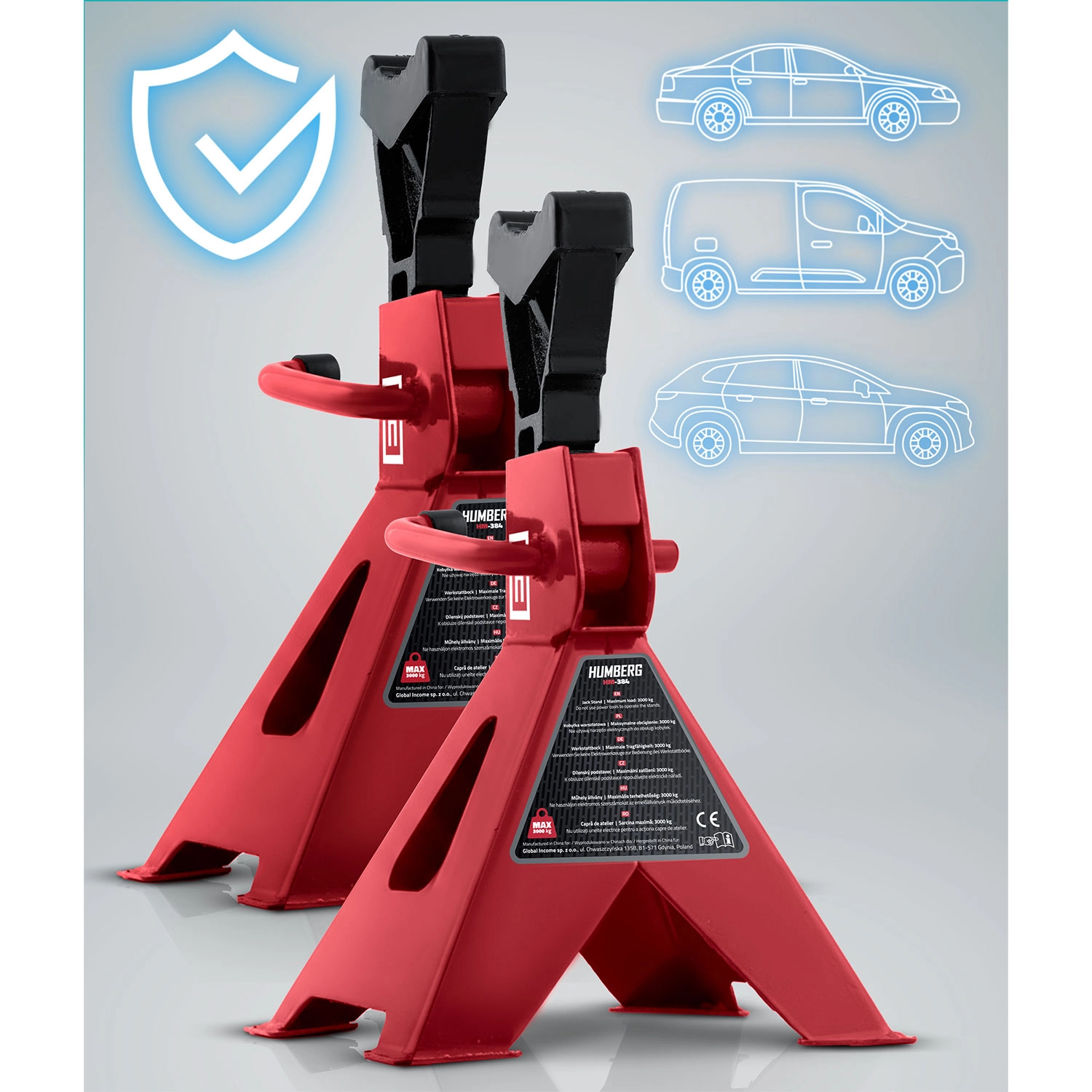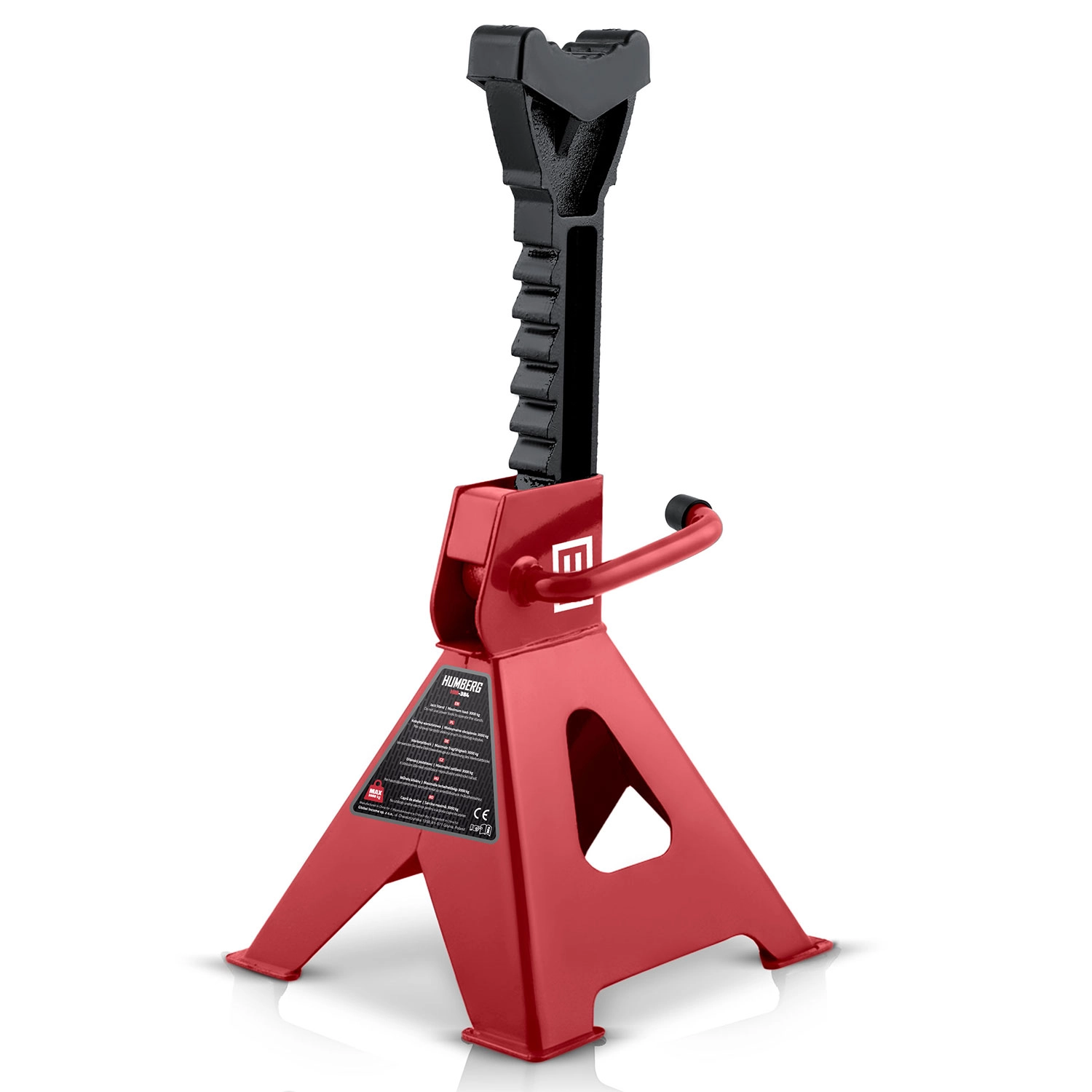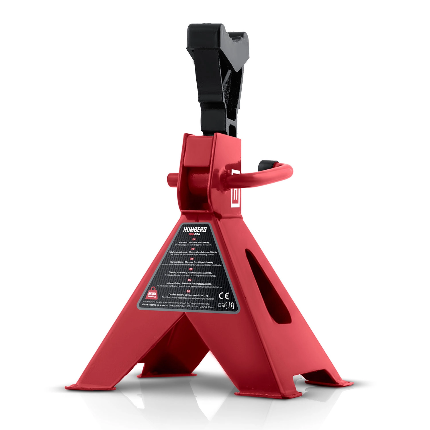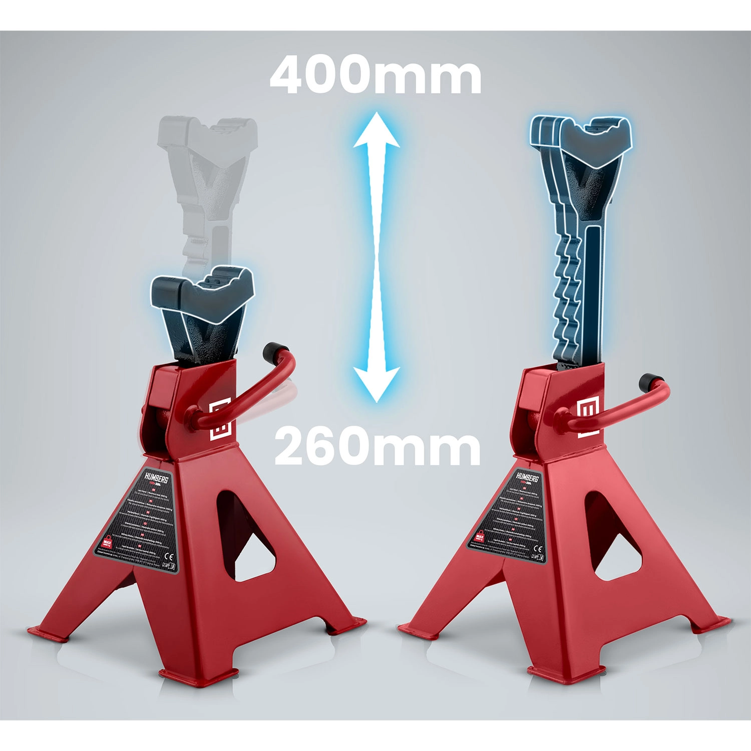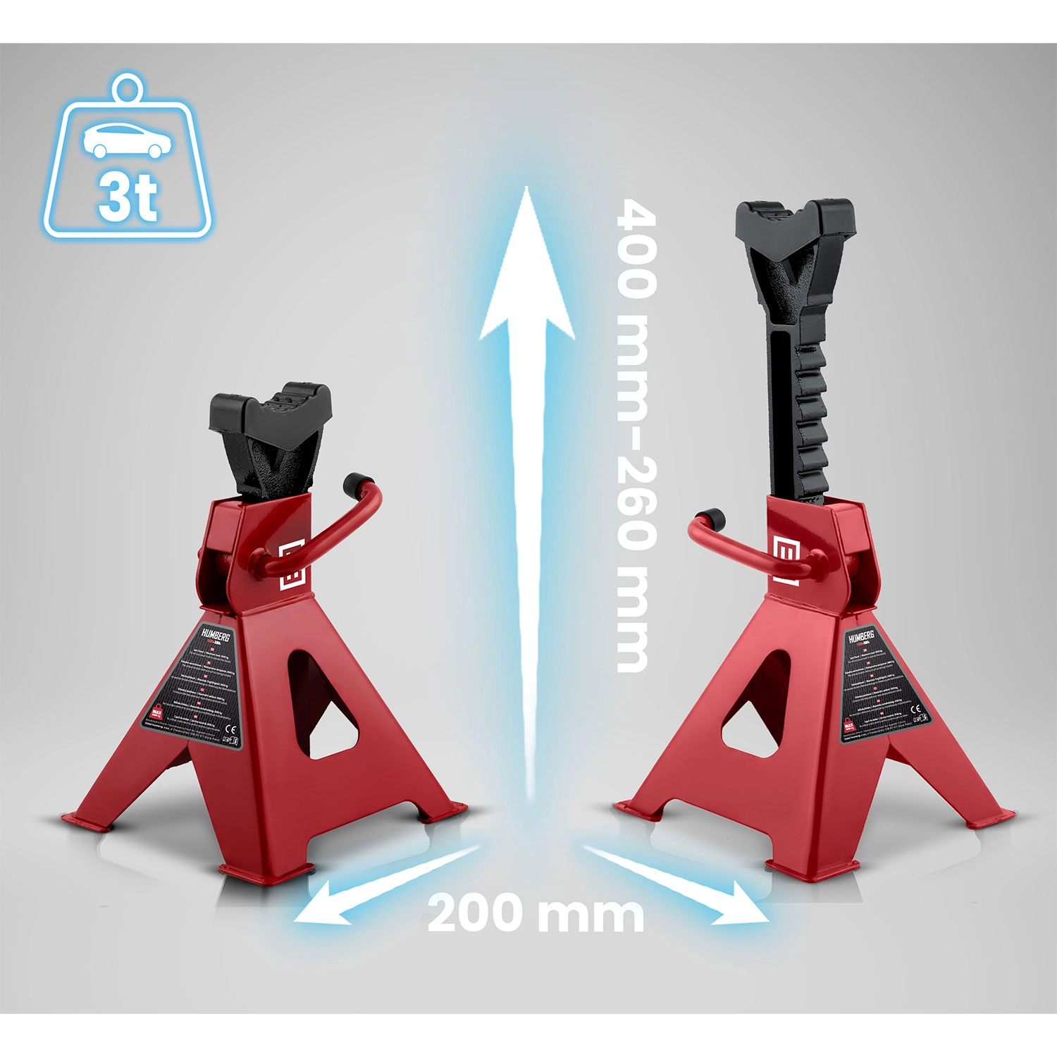 Robusten komplet dveh avtomobilskih opor z nosilnostjo do 3 tone za varno zavarovanje vozila med vzdrževanjem. Zahvaljujoč ragljičnemu mehanizmu preprosto nastavite višino v razponu 260–400 mm. Zaščitni gumijasti nastavki ščitijo podvozje pred poškodbami, stabilna jeklena konstrukcija s široko osnovo pa zagotavlja varnost tudi pri največji obremenitvi.