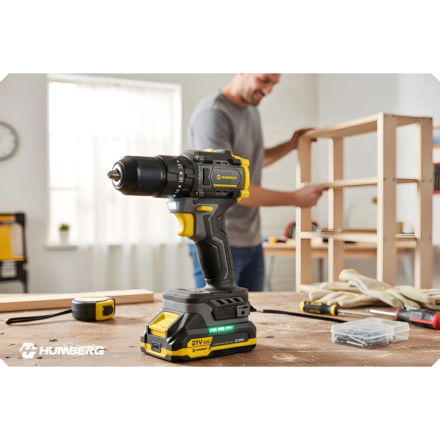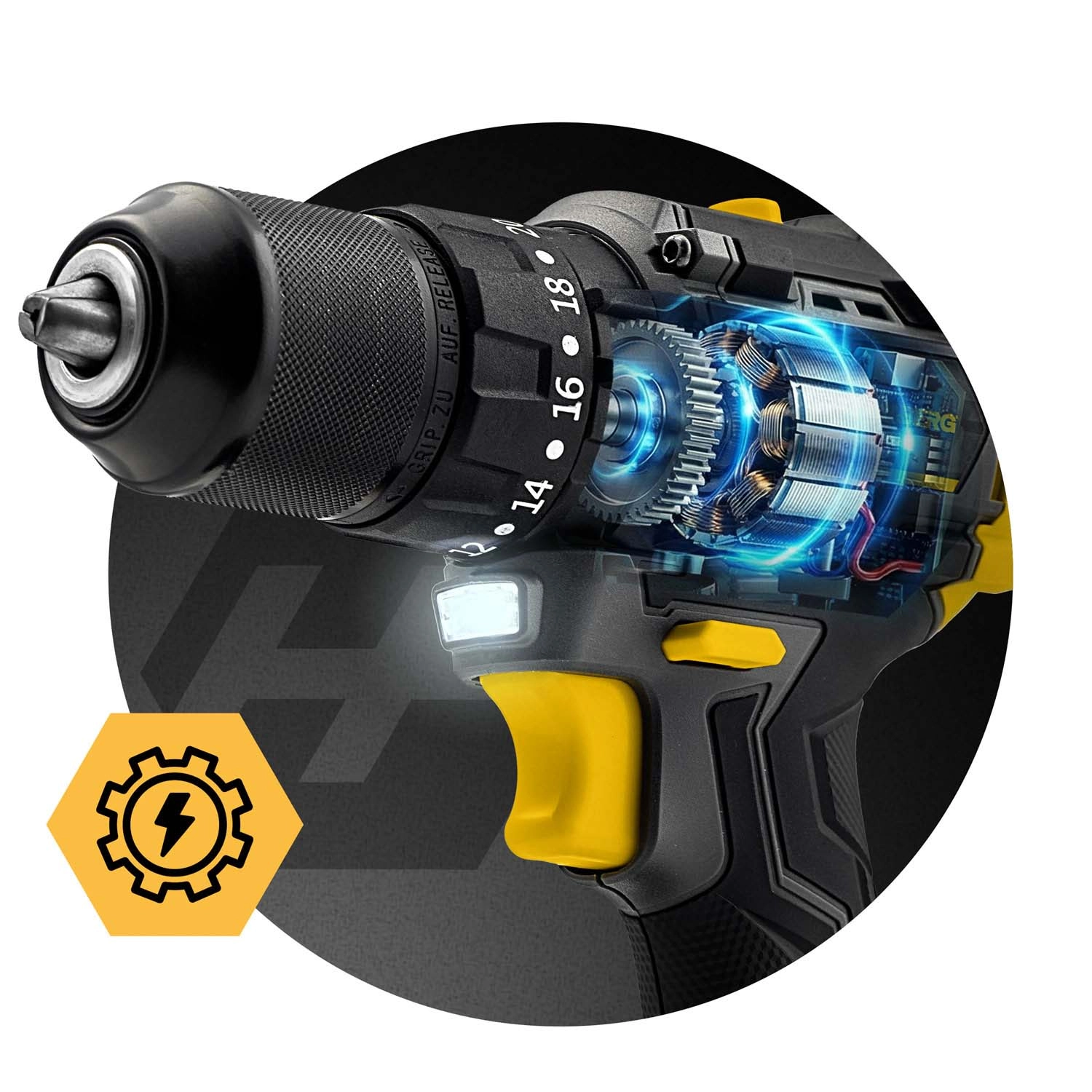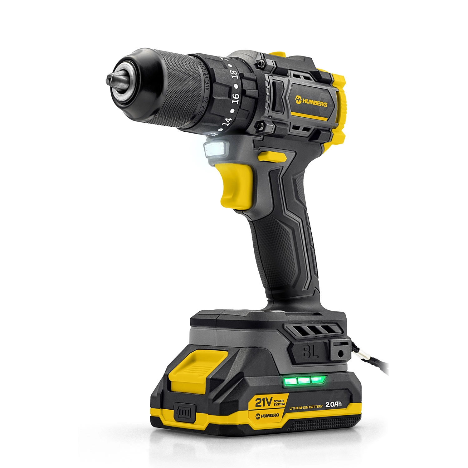 Ergonomska zasnova z mehkim, protizdrsnim oprijemom nudi zanesljivost in udobje tudi pri daljšem delu. 20‑stopenjska nastavitev sklopke ščiti material in vijake, dve hitrosti omogočata preklop med natančnim vijačenjem (0–400 obr./min) in hitrim vrtanjem (0–1400 obr./min). LED luč osvetli delovno mesto v temnih kotih, omarah ali spuščenih stropih.