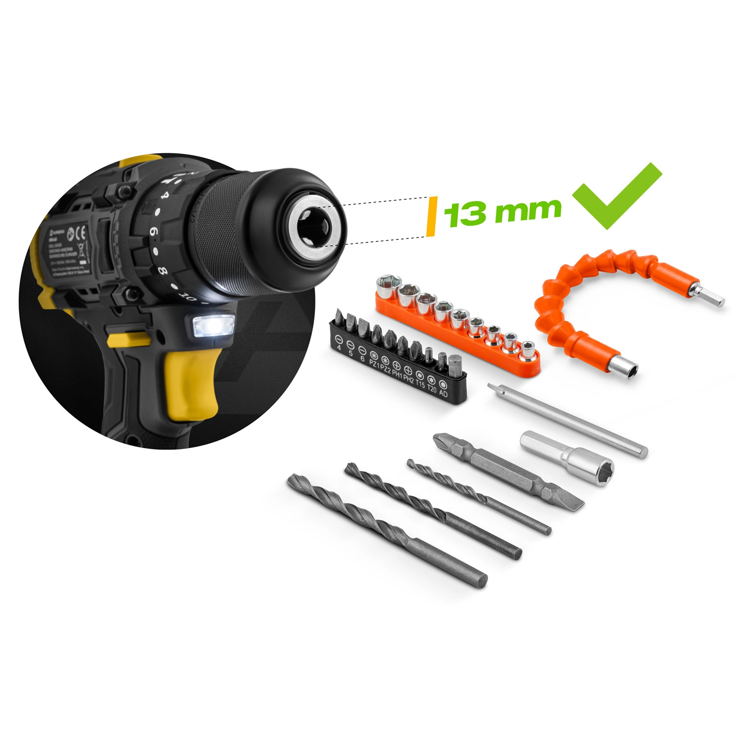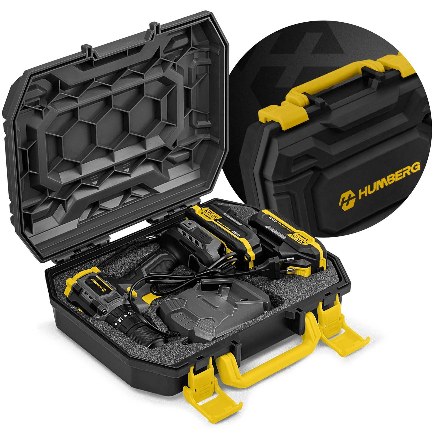 Vse potrebno imate pri roki: set svedrov (kovina, les, plastika), biti in nastavki, elastični podaljšek, adapter, dvojni bit ter sveder za steklo. Vse to v odpornem transportnem kovčku s pregledno razporeditvijo in ojačanimi zaponkami za varen prenos.