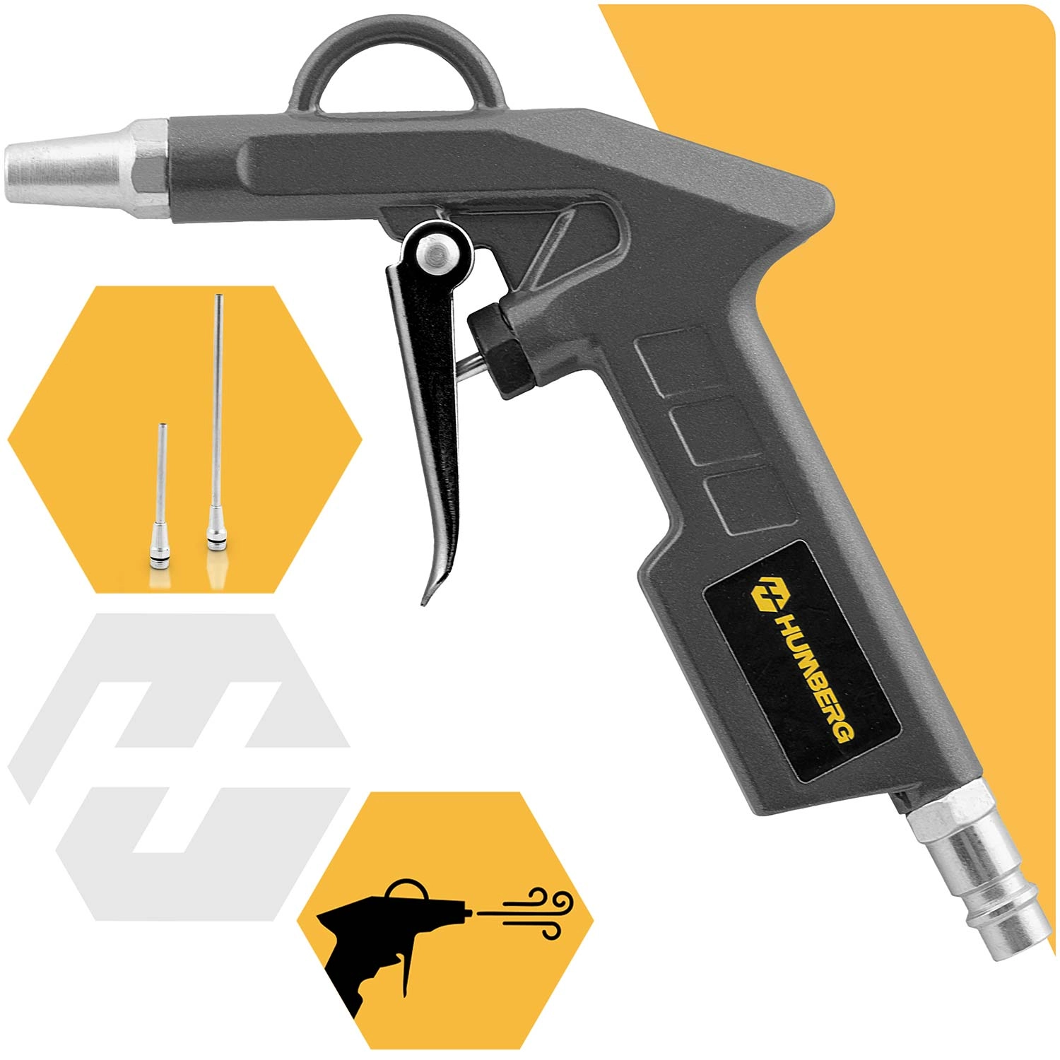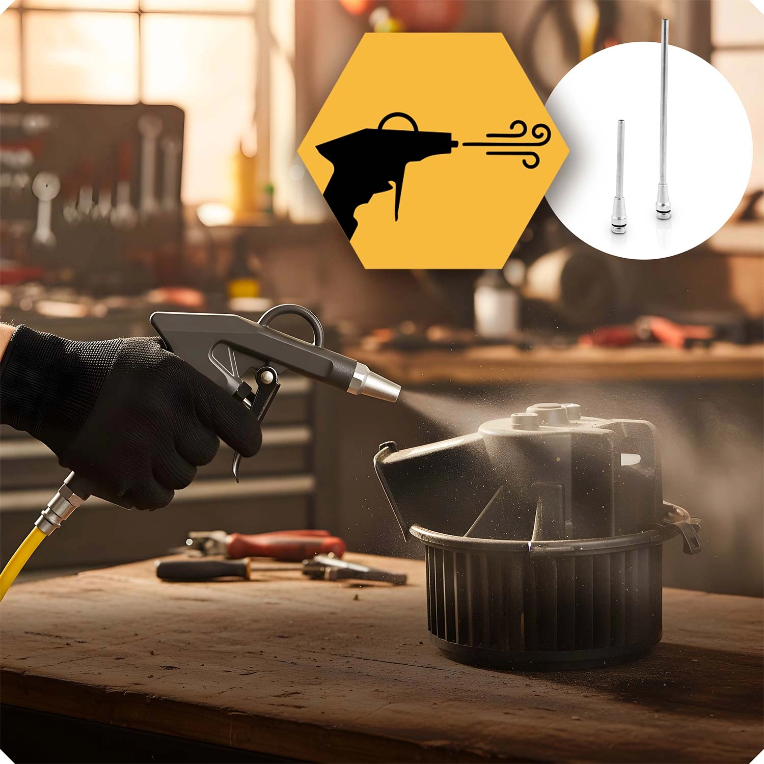 Ergonomska pihalna pištola z ozko šobo in dvema zamenljivima nastavkoma natančno usmeri zračni tok za odstranjevanje prahu, oblancev in kovinskih opilkov tudi iz težko dostopnih mest.