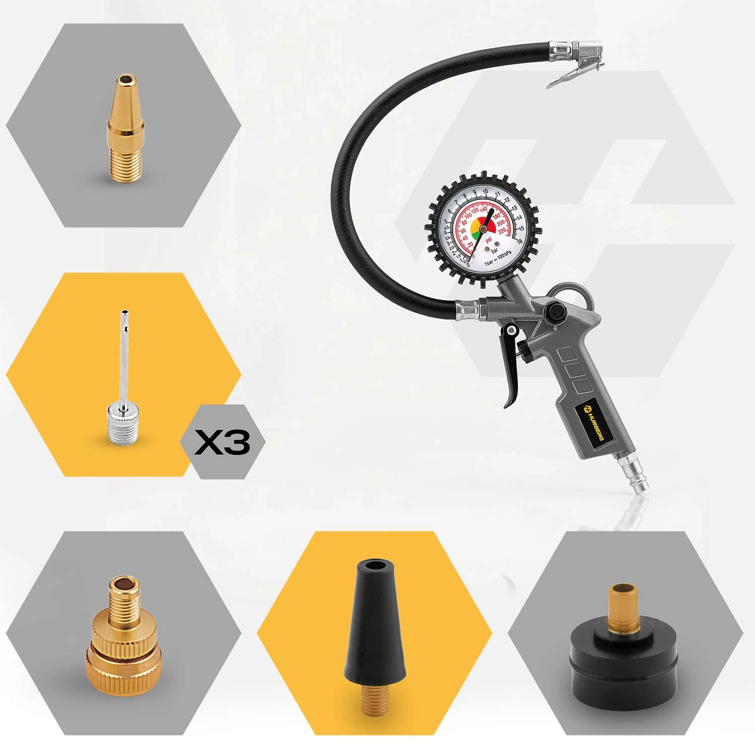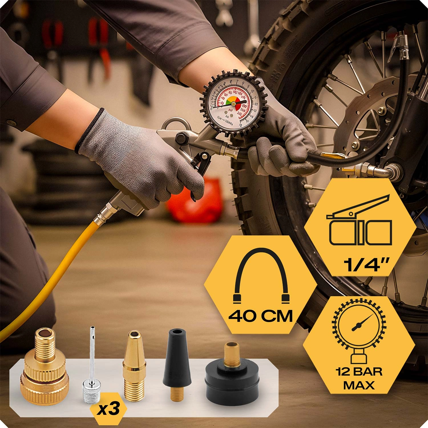 Pištola za polnjenje z vgrajenim analognim manometrom, 40 cm prilagodljivo cevjo in standardnim priklopom 1/4" omogoča varno in natančno dopolnjevanje pnevmatik koles in avtomobilov. Vključuje več adapterjev za univerzalno uporabo.
