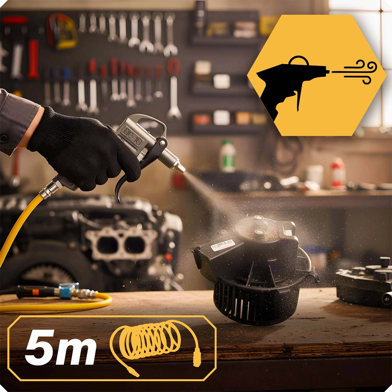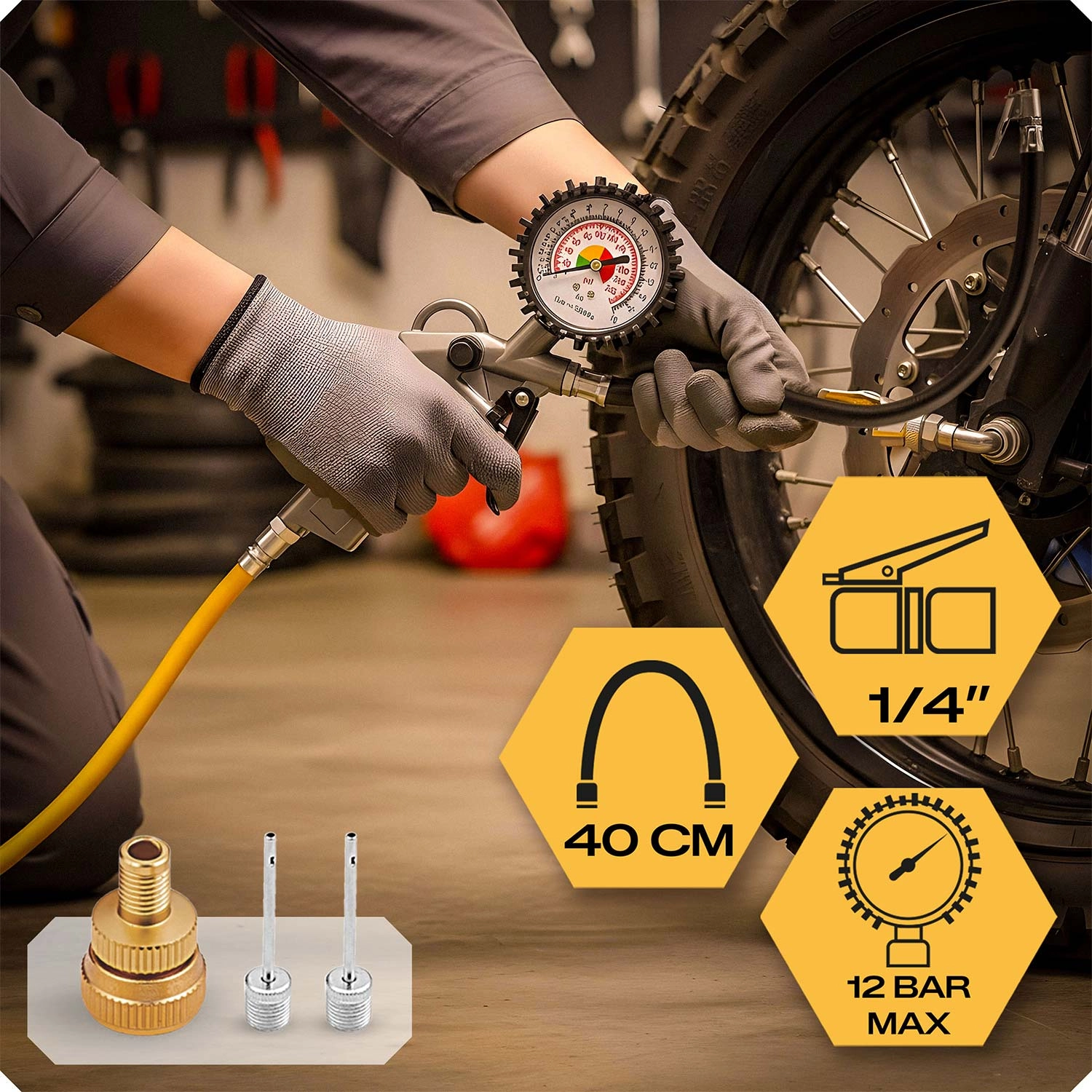 Ta bogato opremljen komplet ponuja profesionalne rezultate doma in v delavnici. Pištola za polnjenje z manometrom omogoča natančen nadzor tlaka, elastična cev dolžine 40 cm olajša dostop do težje dosegljivih mest, standardni priklop 1/4" pa zagotavlja združljivost z večino kompresorjev. Priložene so tudi konice za športne žoge in hitrospojka za hitro in tesno priključitev.
