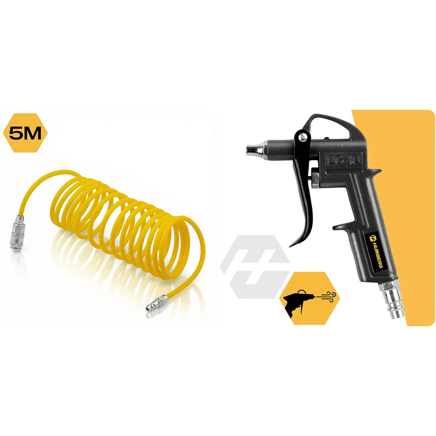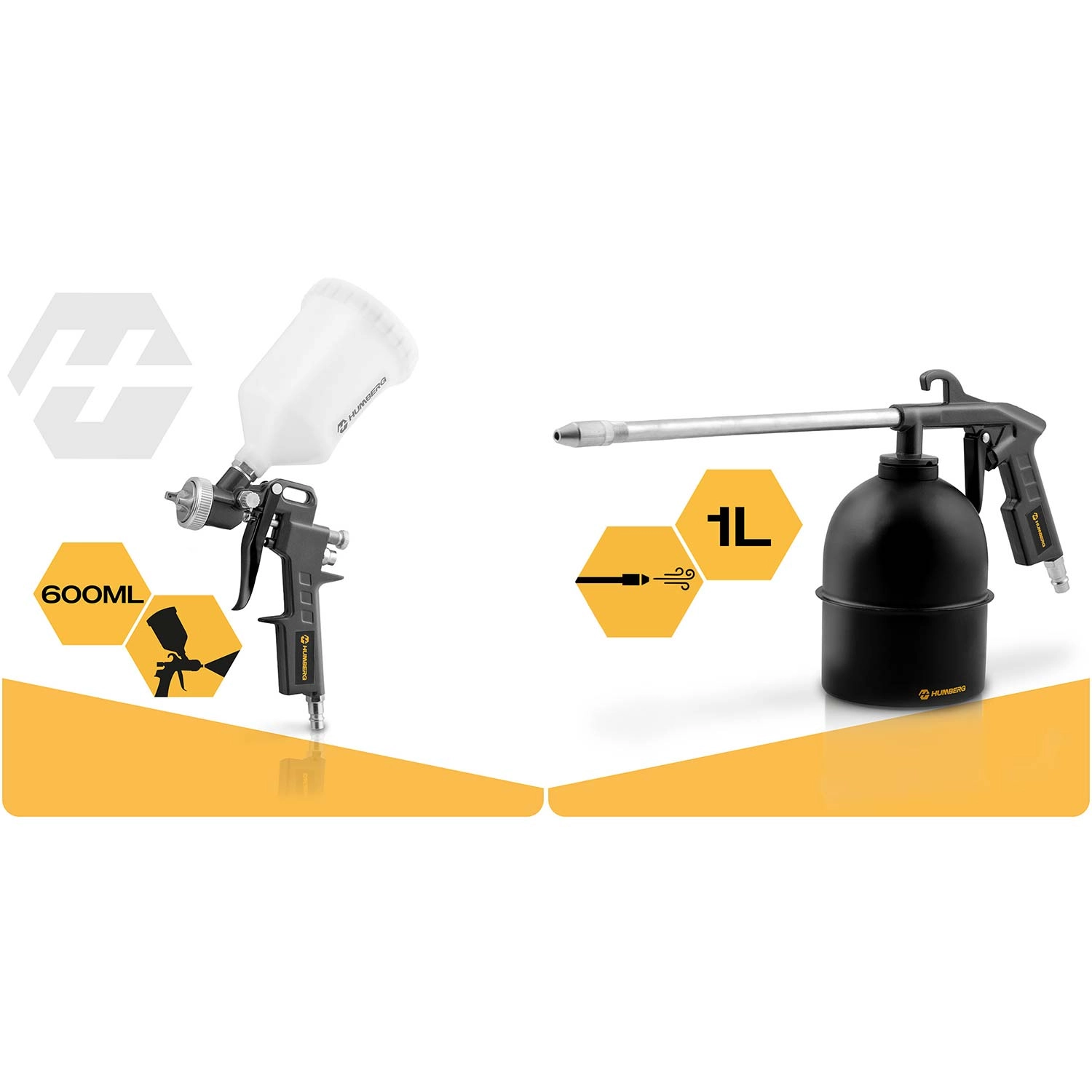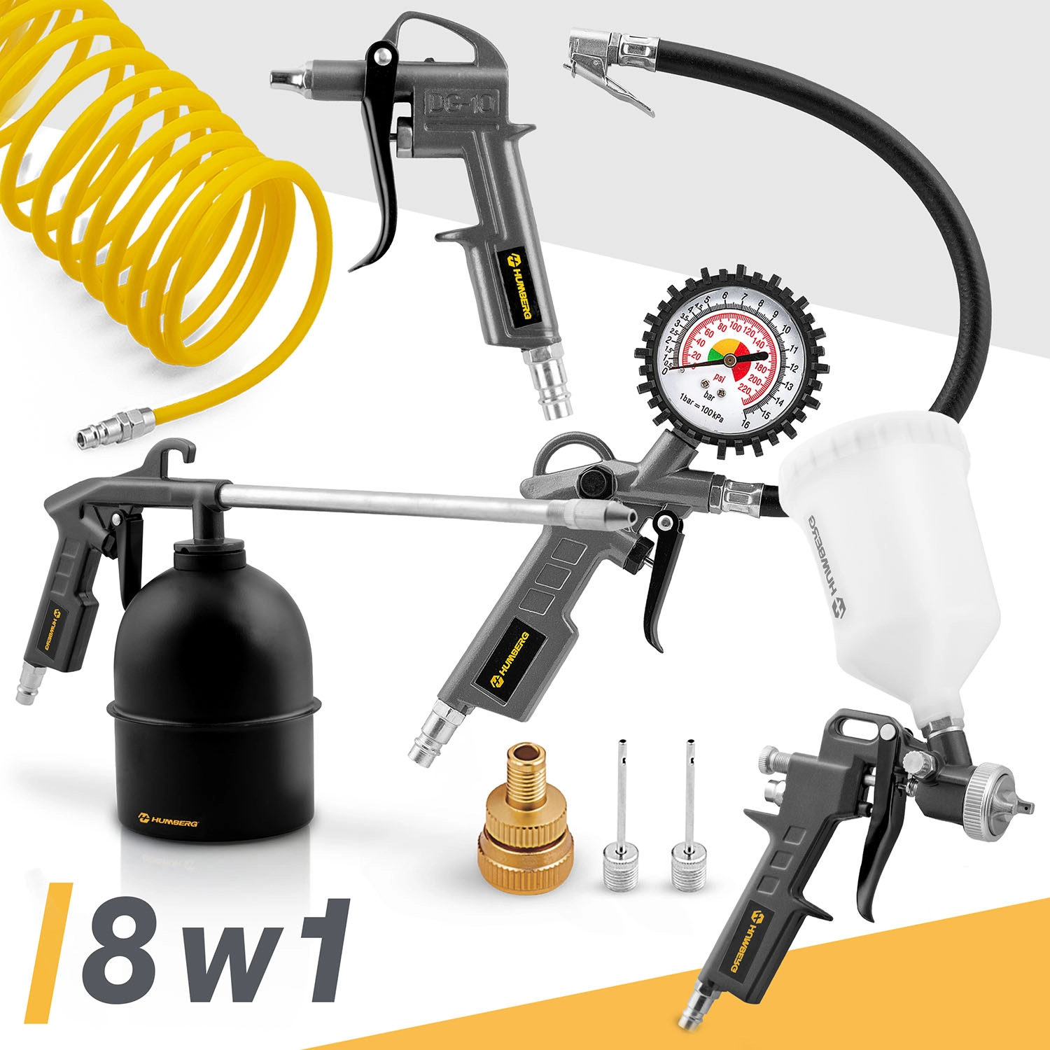 Univerzalni komplet pnevmatskega orodja 8 v 1 za kompresorje HUMBERG obvlada polnjenje pnevmatik, barvanje, odpihovanje, čiščenje in visokotlačno pranje. Vsebuje pištolo za polnjenje z manometrom, lakirno in konzervacijsko pištolo, odpihovalno pištolo, spiralno cev 5 m, hitrospojko in nastavke – vse za hitro in natančno delo v delavnici in garaži.