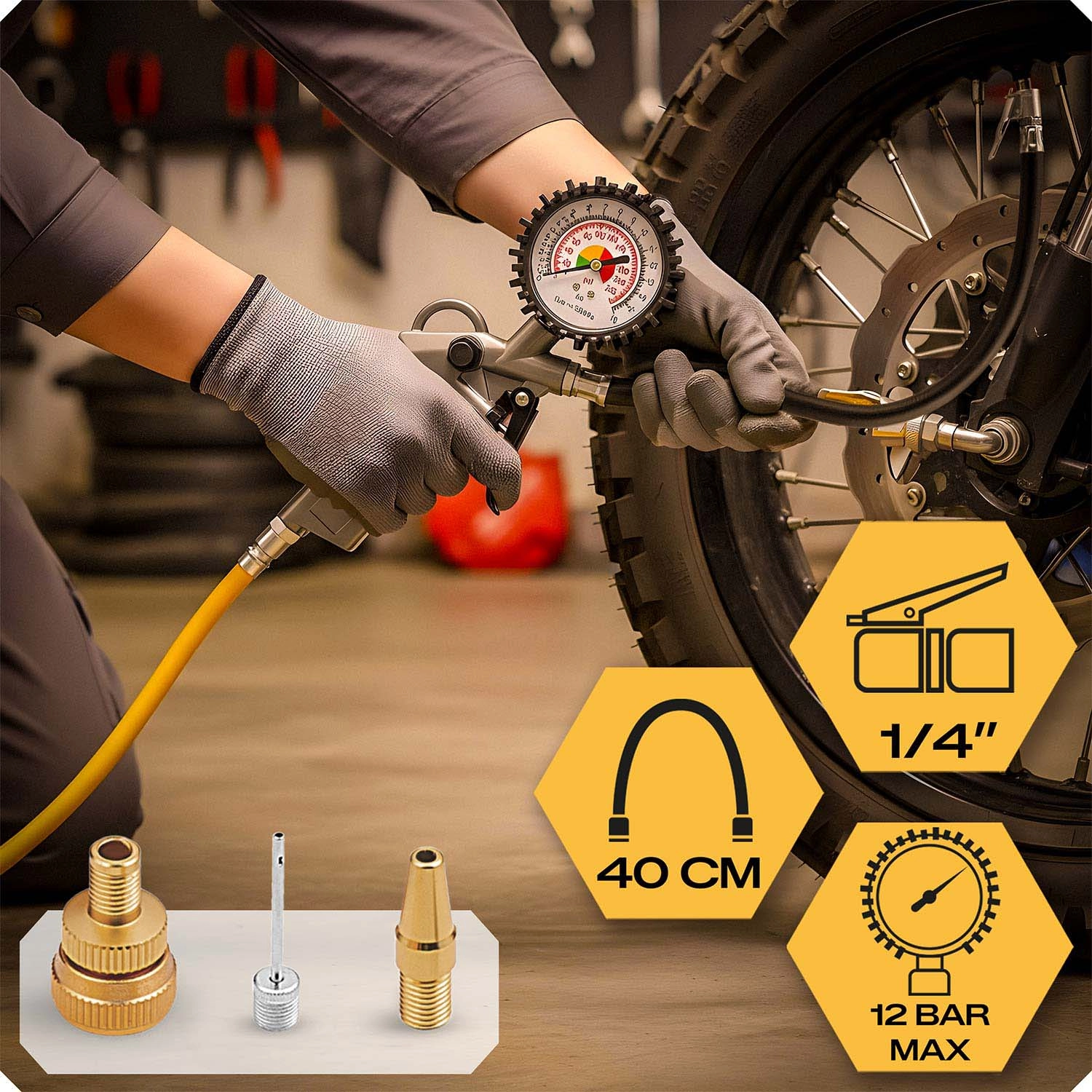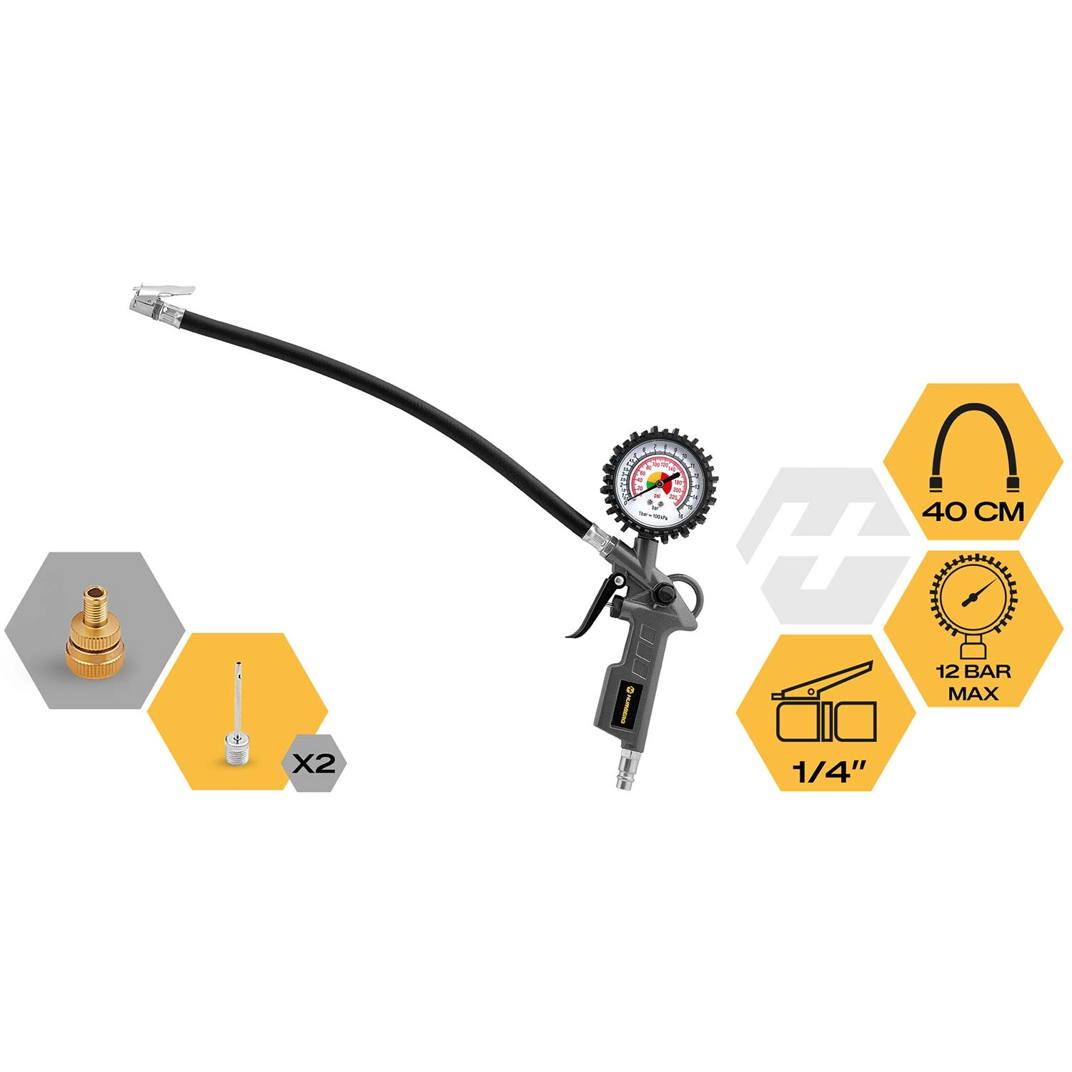 Pištola z okroglim analognim manometrom omogoča udobno polnjenje pnevmatik z neposrednim nadzorom tlaka. Prilagodljiva cev in zanesljiv nastavek zagotavljata varno priključitev na ventil.