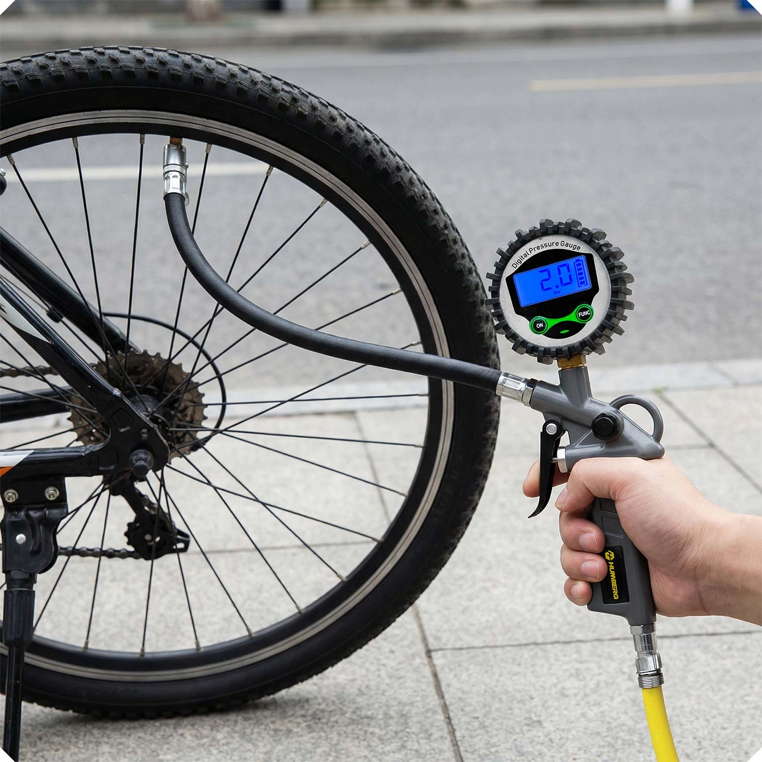 Digitalni polnilnik HUMBERG HM-260 je zanesljiv pomočnik za avtomobil, motor in kolo. Velik osvetljen LCD-zaslon omogoča hiter in natančen odčitek tlaka, preklapljanje enot pokrije vse običajne standarde, ergonomski sprožilec pa zagotovi gladko dopolnjevanje tlaka natančno na želeno vrednost.