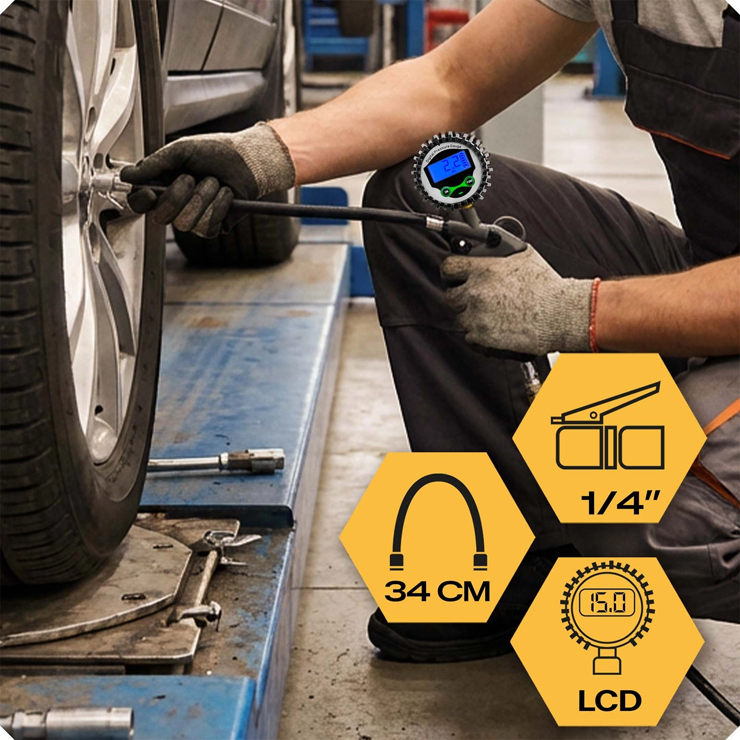 Gibljiva cev dolžine 34 cm povečuje udobje pri delu, standardni priključek 1/4" pa zagotavlja široko združljivost z delavniškimi in domačimi kompresorji. Trpežen gumijast obroč okoli manometra ščiti napravo pred udarci, zato je idealna za garažo, servis in na potovanja.