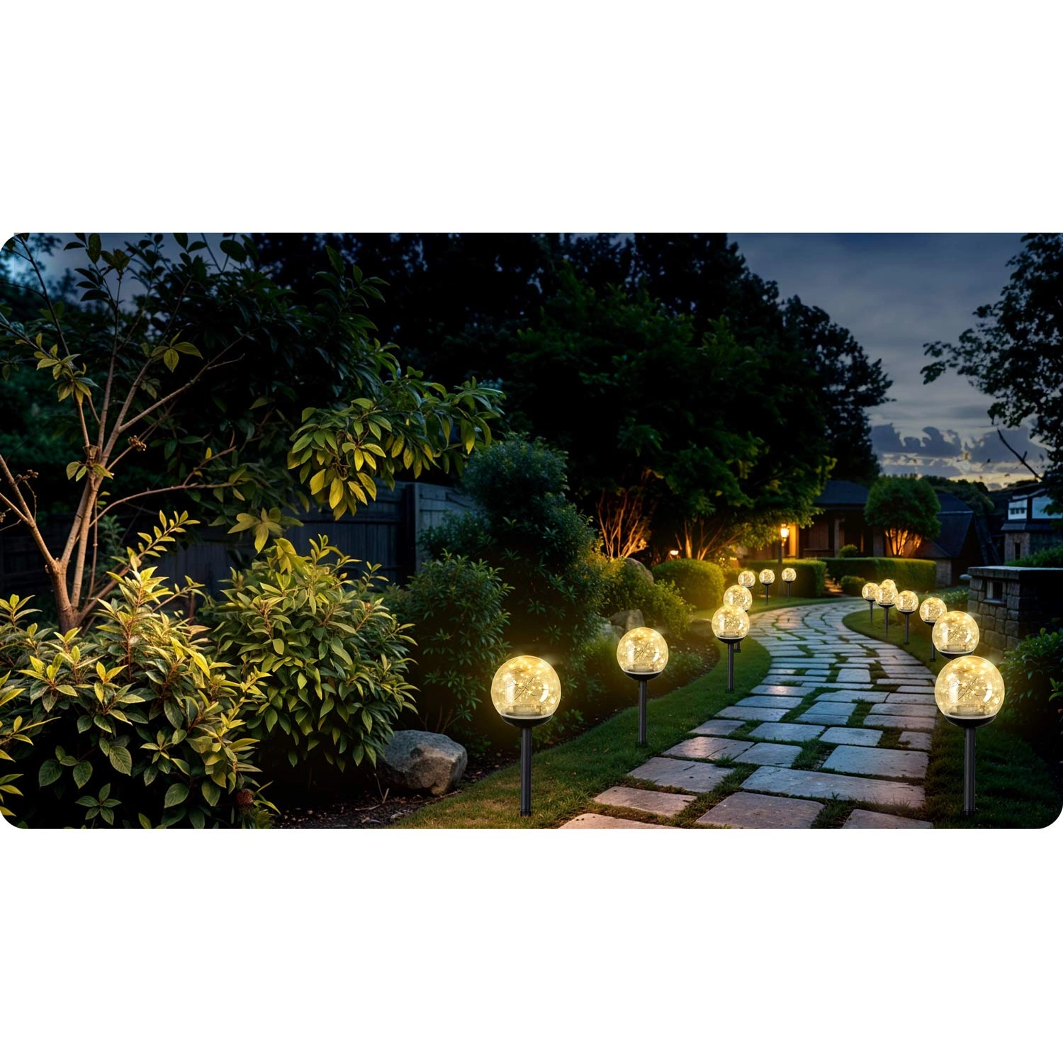Prosojne krogle s toplimi LED točkami lepo razpršijo svetlobo in poudarijo linije poti ali gred. Idealne za orientacijo in prijetno vzdušje ob mraku.