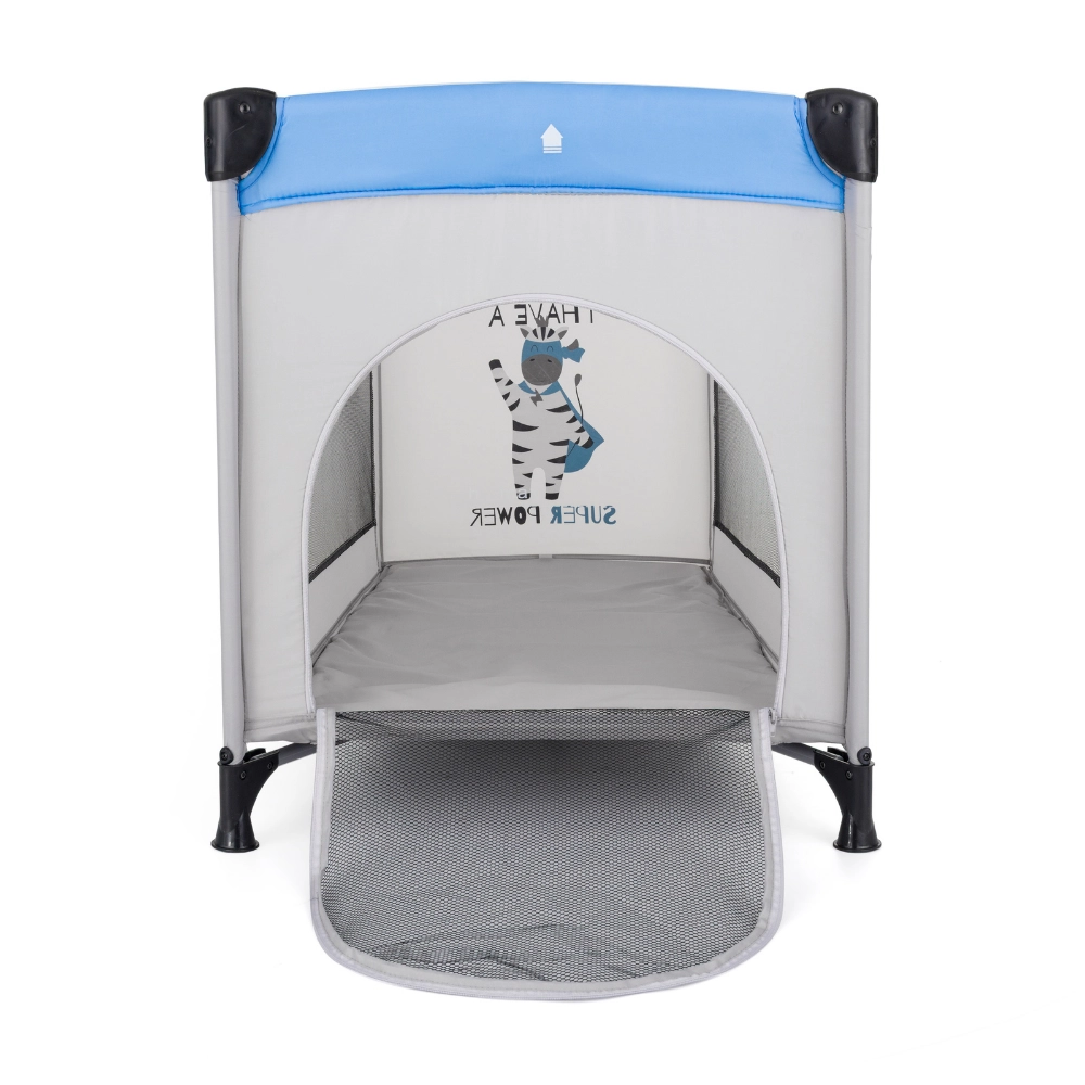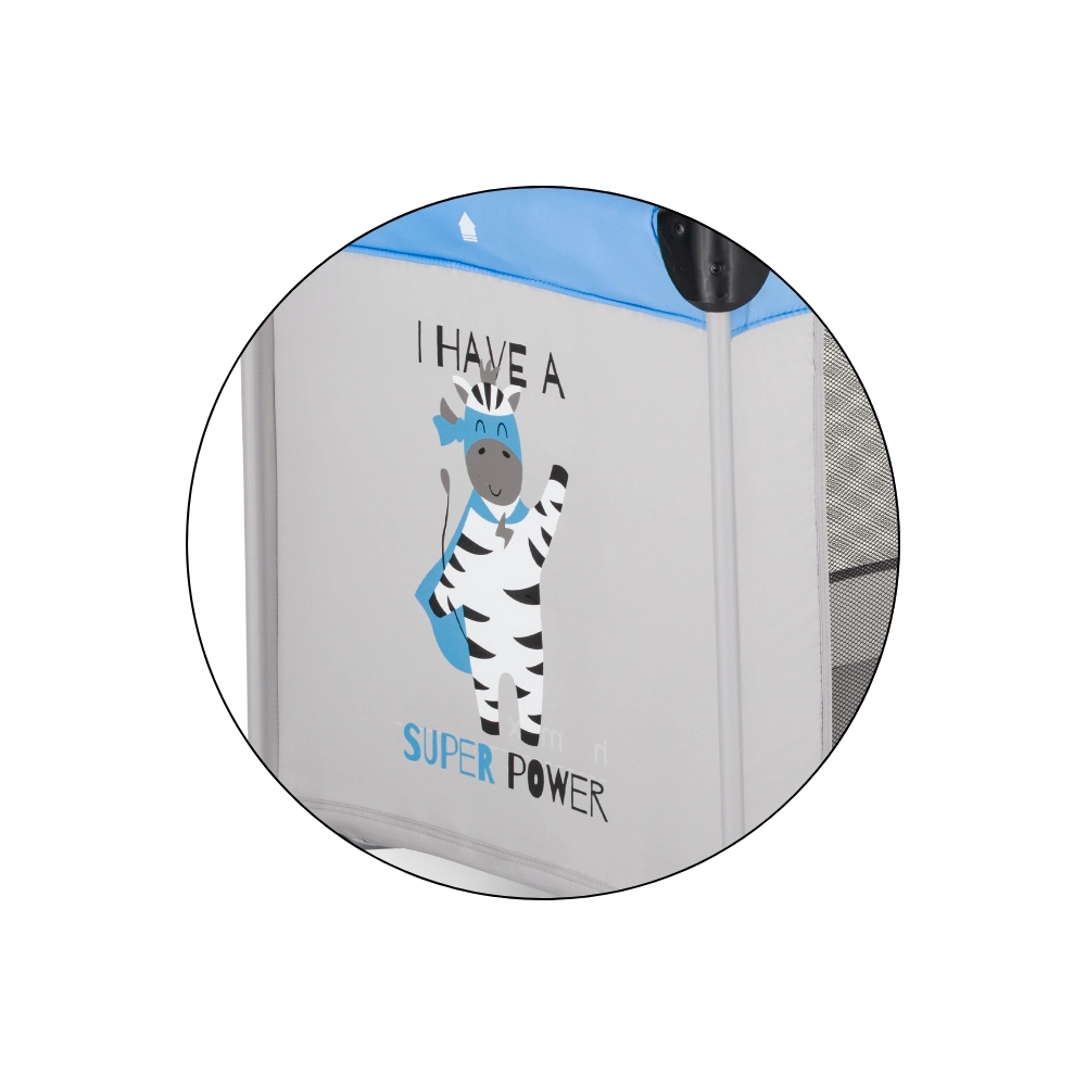 Potovalna posteljica PETITE&MARS Koot v igrivem dizajnu Zebra Super Power ponuja varno in udobno mesto za spanje in igro. Stabilna kovinska konstrukcija s trpežno tkanino zagotavlja dolgo življenjsko dobo, medtem ko zračne mrežaste stranice omogočajo odličen nadzor nad otrokom in optimalno kroženje zraka. Edinstveni Double Lock preprečuje nenamerno zlaganje in povečuje varnost pri uporabi.
