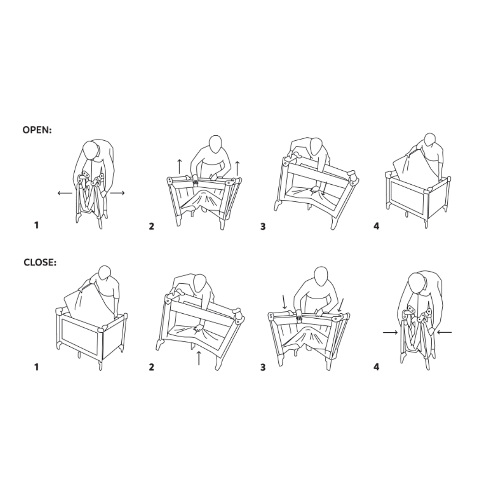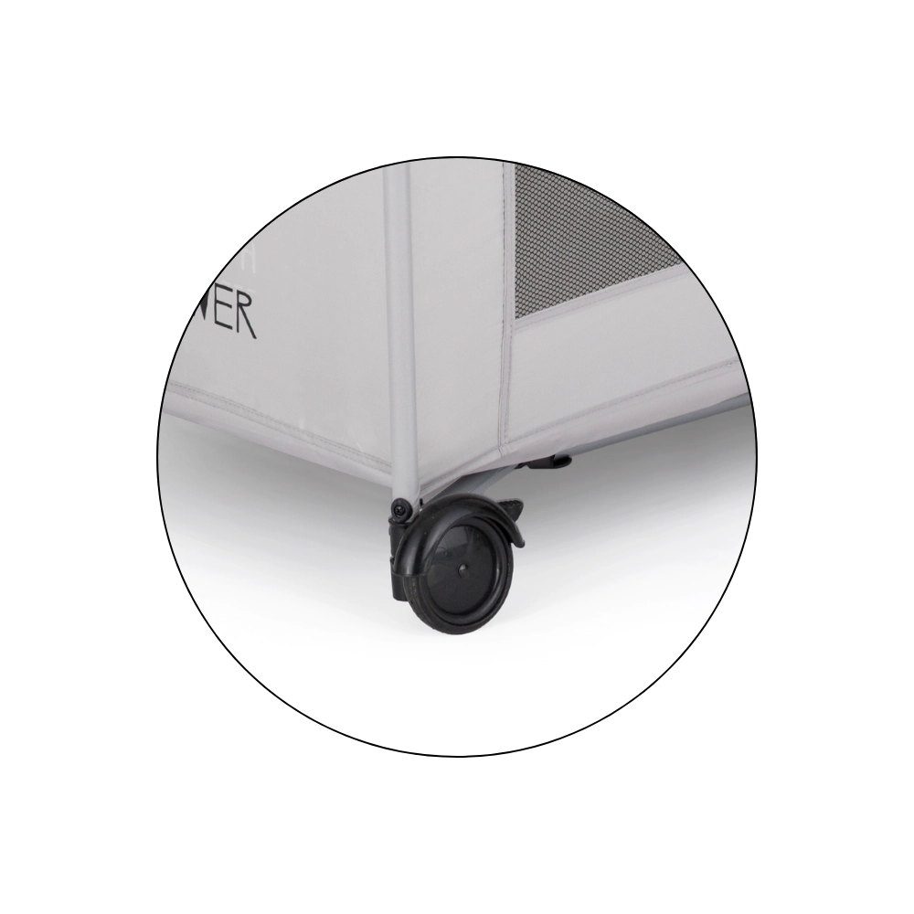 Posteljica se hitro in enostavno zloži na kompaktno velikost. Dve kolesci olajšata premikanje po prostoru, čelna zadrga pa omogoča starejšim otrokom varen vstop in izstop. V paketu prejmete zložljivo ležalno površino in prenosno torbo za udobno potovanje. Za novorojenčke je možno dokupiti dodatno nadstropje za višji položaj ležišča.