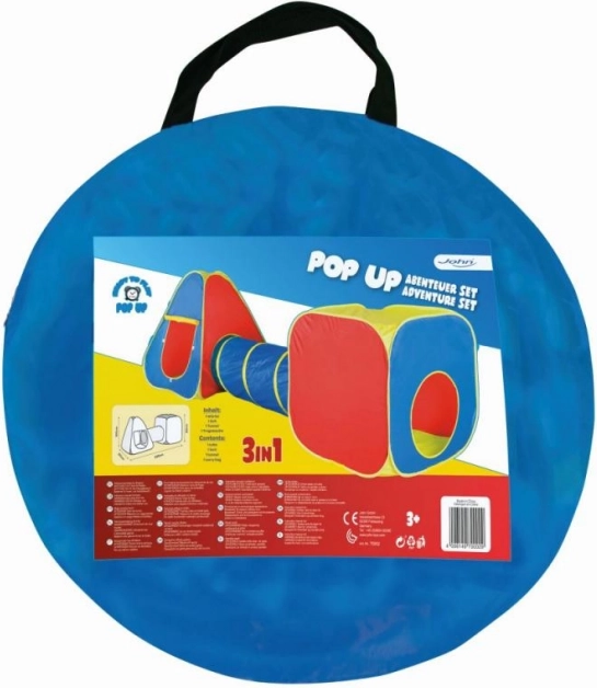 Zabavni pop-up komplet šotorov 3 v 1 spremeni sobo ali vrt v otroško igrišče. Vključuje kockasti šotor, tunel in pop-up šotor, ki jih lahko uporabljate skupaj ali posamezno. Hitro postavljanje brez truda, lahka konstrukcija in enostavno shranjevanje zagotavljajo udobno igro doma in na prostem.