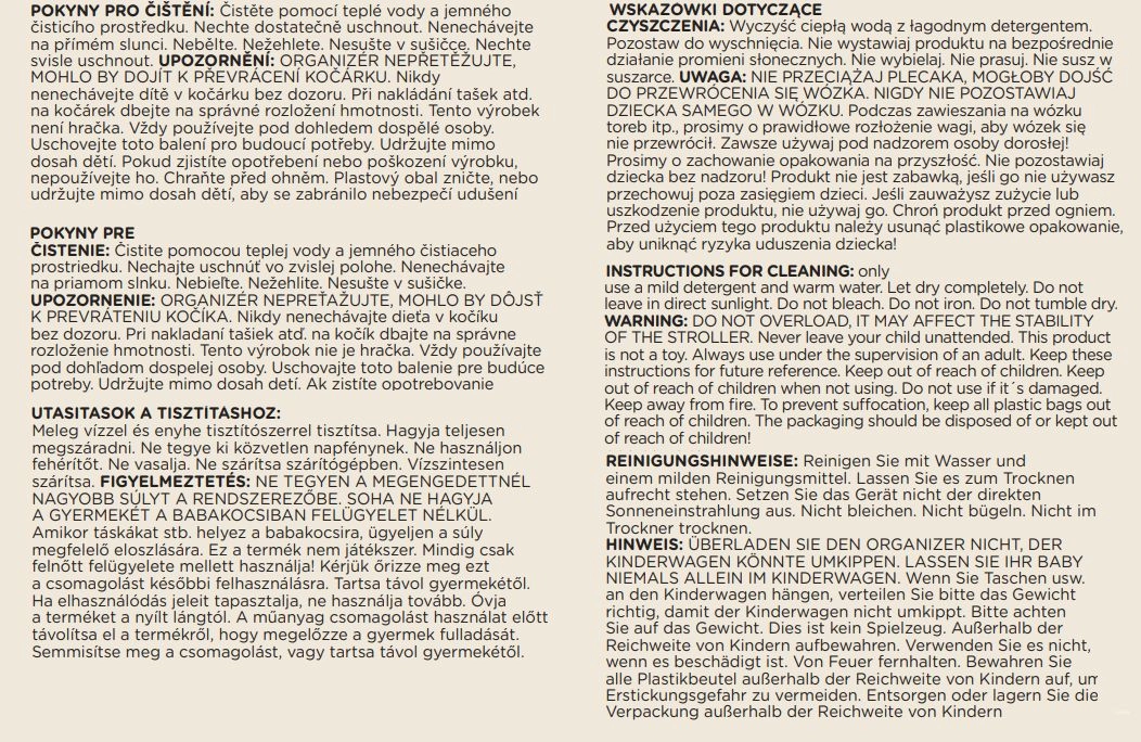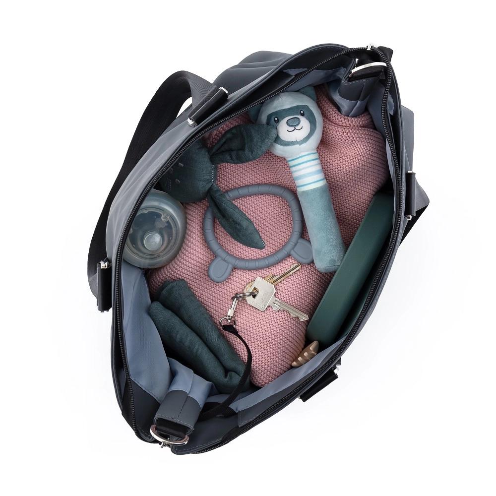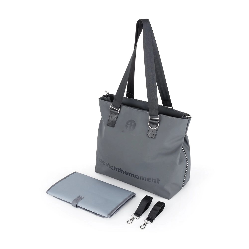 Torba je izdelana iz trpežnega poliestra, odpornega na vlago, ima termo žep za ohranjanje temperature stekleničke, vodotesni žep za mokra oblačila, predal za tablico in vrvico za ključe. Del paketa je zložljiva previjalna podloga. Odstranljivi trakovi omogočajo varno pritrditev na voziček, medtem ko bodo udobni ramenski trakovi prav prišli pri nošenju čez ramo.
