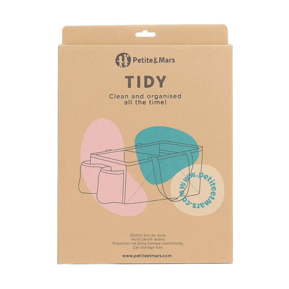 Praktični organizator za avto Petite&Mars Tidy pomaga imeti vse potrebno pri roki in brez neredа. Idealen je za družine z otroki – prilega se med dva avtosedeža, zlahka se pritrdi z varnostnim pasom in prav tako dobro deluje v prtljažniku. Zahvaljujoč čvrstim stranicam in premišljeni razporeditvi pregledno shrani igrače, pleničke, prigrizke, robčke in drobnarije.