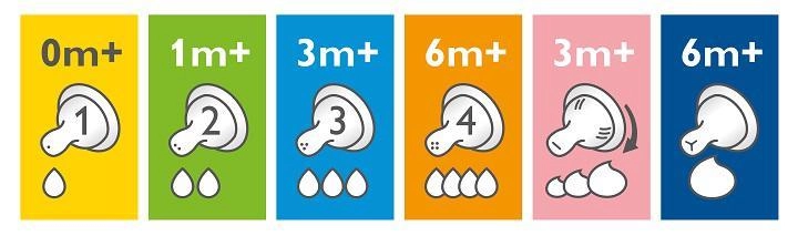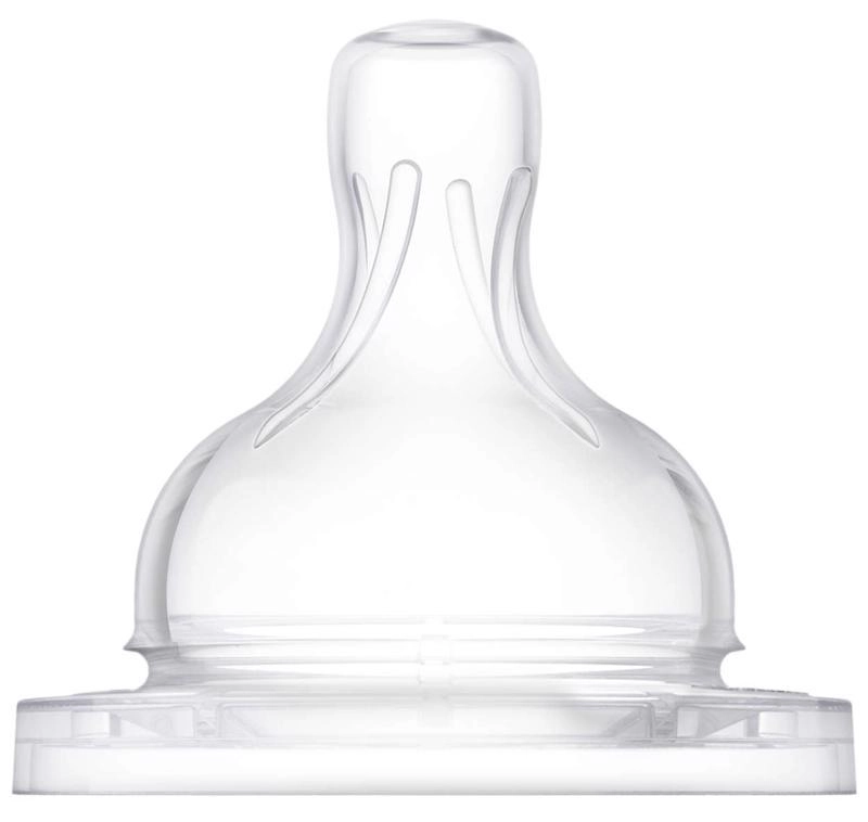 Izjemno mehak in tanek silikon z razširjenim rebrastim ojačanjem zagotavlja stabilnost oblike in vzdržljivost, medtem ko znižan tesnilni rob prispeva k udobnemu sesanju. Novorojenčni pretok (0 m+) omogoča dojenčku, da samos to uravnava pretok mleka, podobno kot pri dojenju, in tako podpira naravni ritem hranjenja.