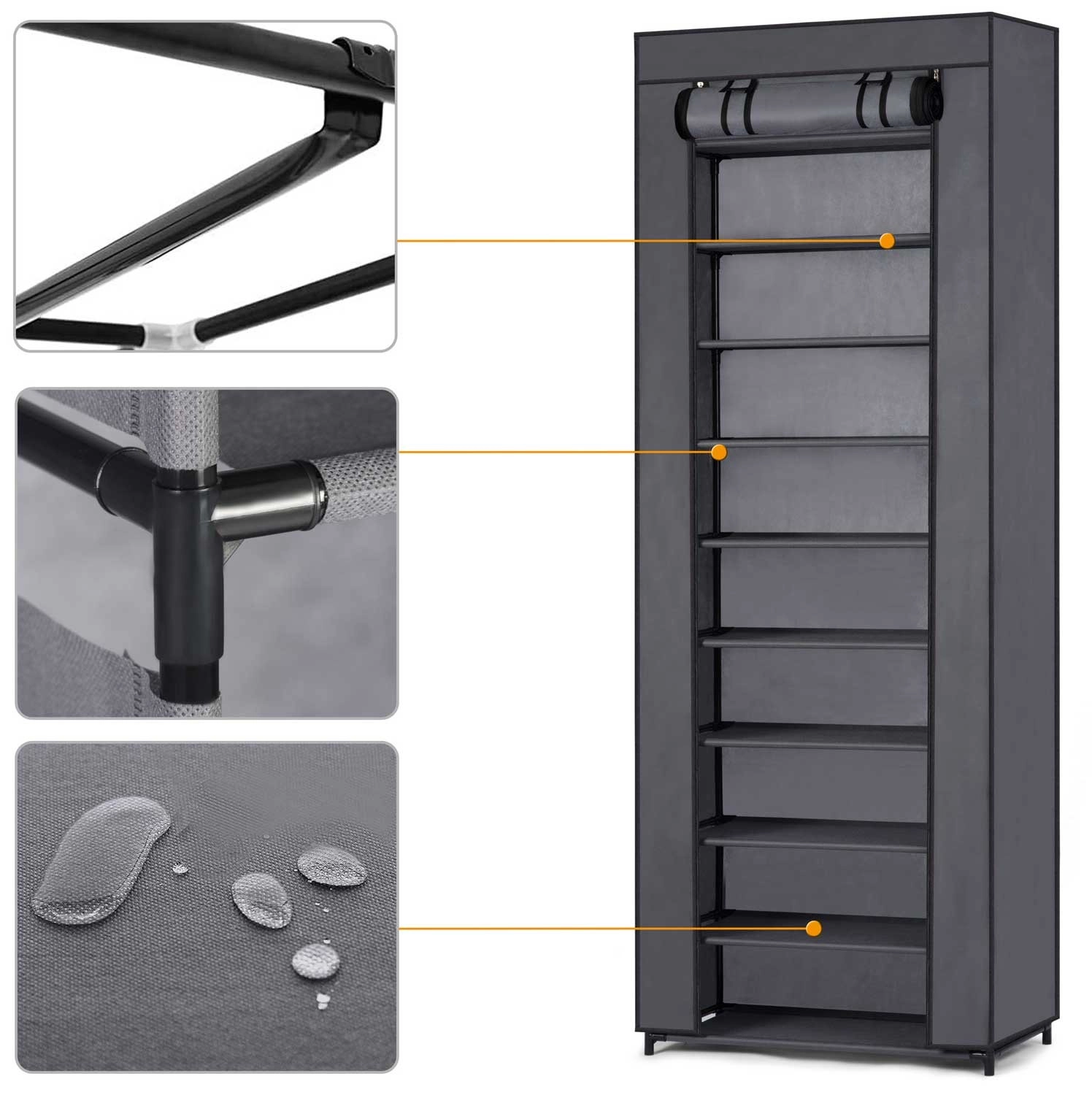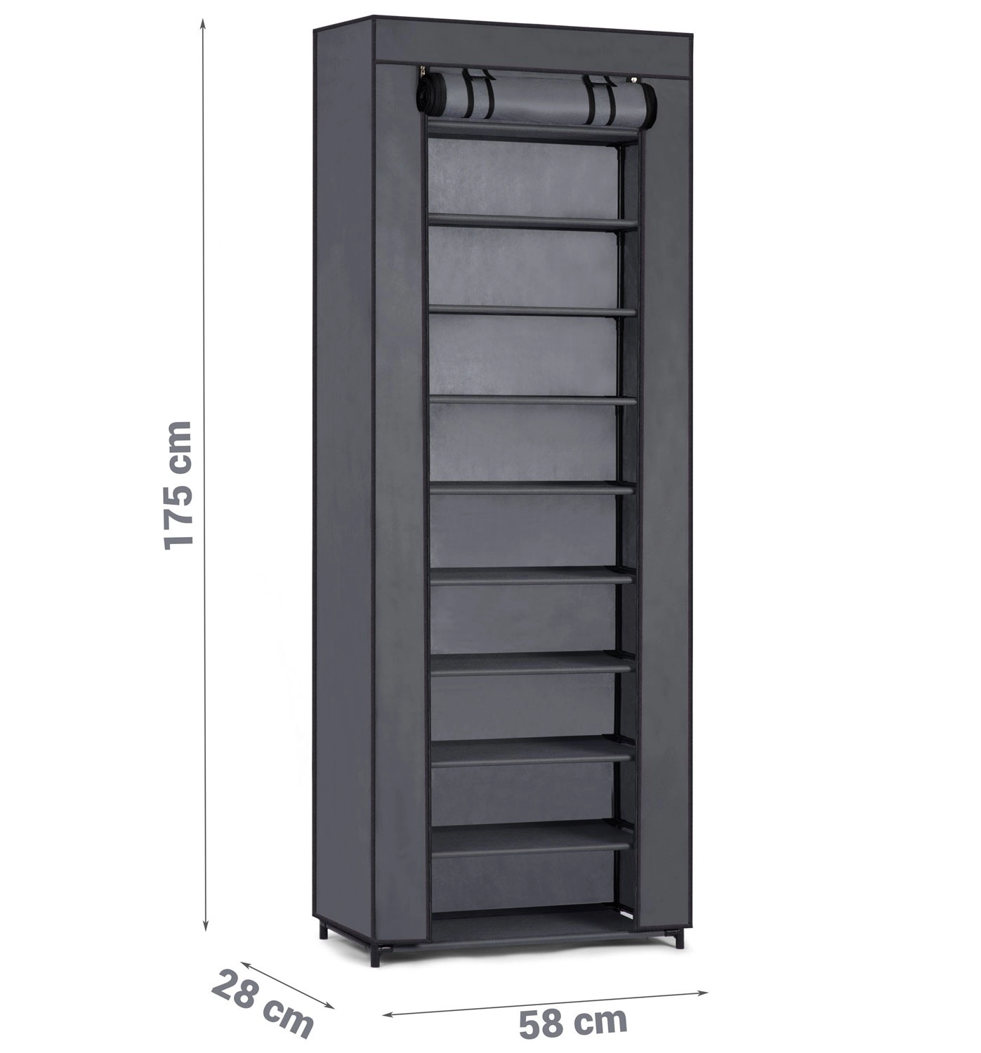 Tekstilna omarica za čevlje Massido je idealna rešitev za vsakodnevno shranjevanje obutve. Kompaktne mere 28 × 58 × 175 cm prihranijo prostor, medtem ko se grafitna izvedba zlahka poda k modernemu interierju. Vse ščiti zapiralna prevleka z zadrgo, ki ohranja čevlje čiste.