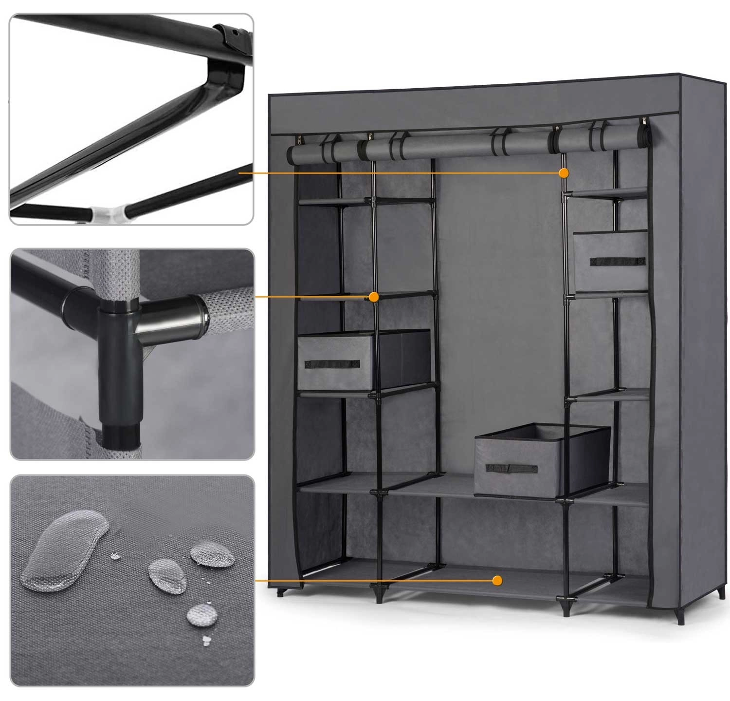 Premišljena notranja razporeditev z 12 policami, 3 predali in palico za obešalnike nudi dovolj prostora za puloverje, majice, spodnje perilo in plašče. Sprednji pokrov s štirimi zadrgami omogoča udoben dostop in hkrati ščiti shranjene stvari pred prahom. Montaža poteka brez orodja in je hitra ter intuitivna.