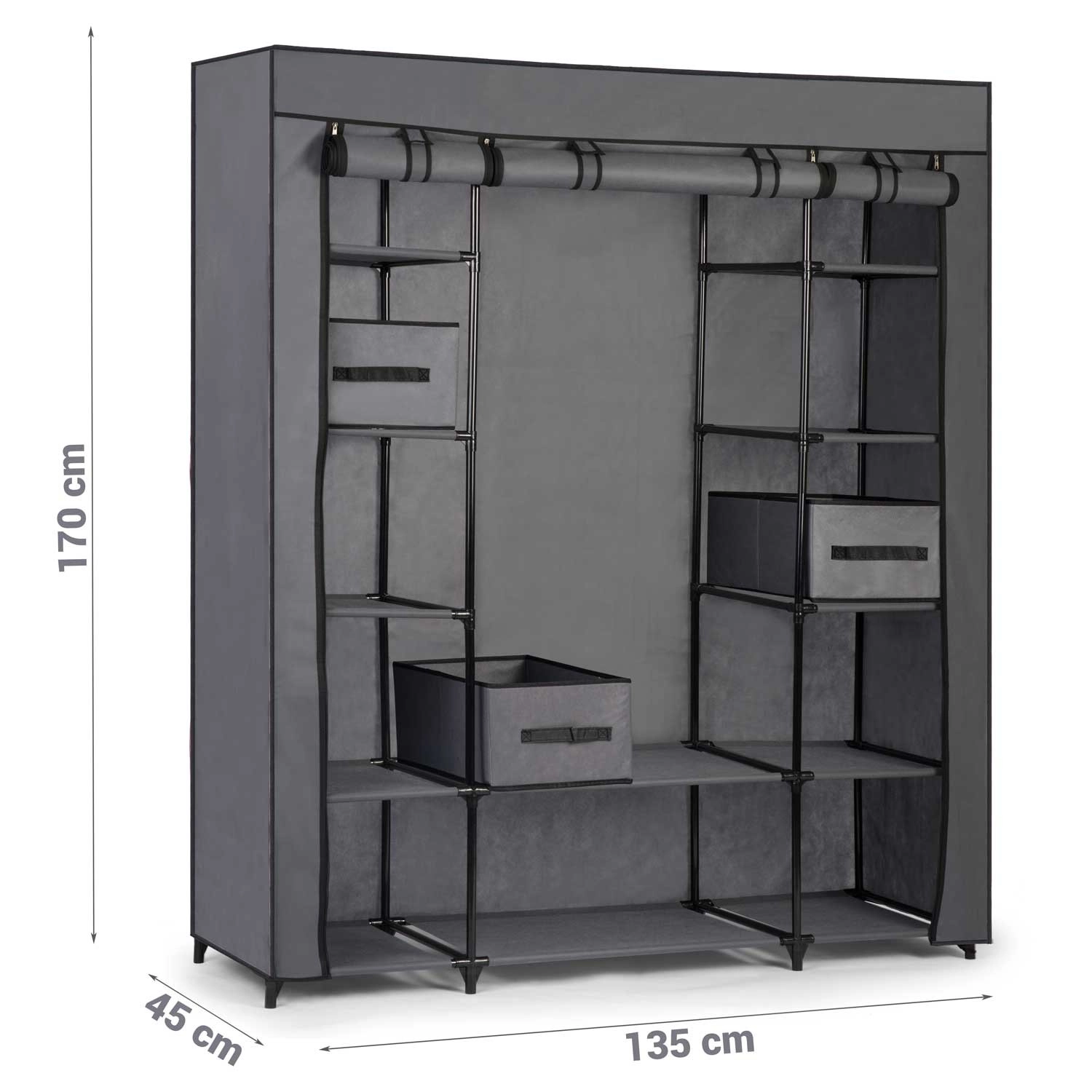 Praktična in trpežna tekstilna omara Massido v elegantni grafitni barvi ponuja premišljeno shranjevanje oblačil in dodatkov. Ima 12 polic z višjo nosilnostjo, 3 prostorne predale in palico za obešalnike. Jeklena konstrukcija in vodoodporen material zagotavljata dolgo življenjsko dobo. Tri ločene cone z lastnimi vrati in štirimi zadrgami olajšajo vsakodnevno uporabo in organizacijo. Montaža je hitra in intuitivna.