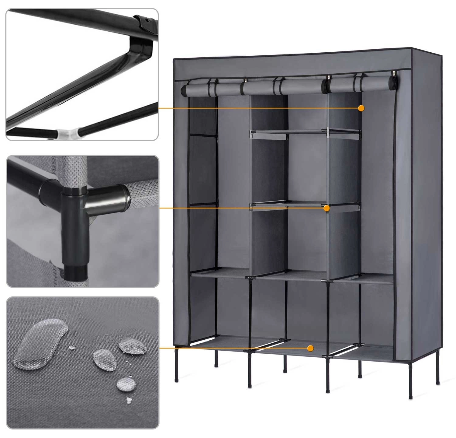 Praktična tekstilna garderobna omara Massido v elegantni grafitni barvi ponuja 8 trdnih polic, 2 obešalni palici in jeklen okvir za stabilnost. Tri ločene cone z lastnimi zadrsnimi vratci ščitijo oblačila pred prahom. Enostavna in intuitivna montaža prihrani čas, vodoodporen material pa zagotavlja dolgo življenjsko dobo.