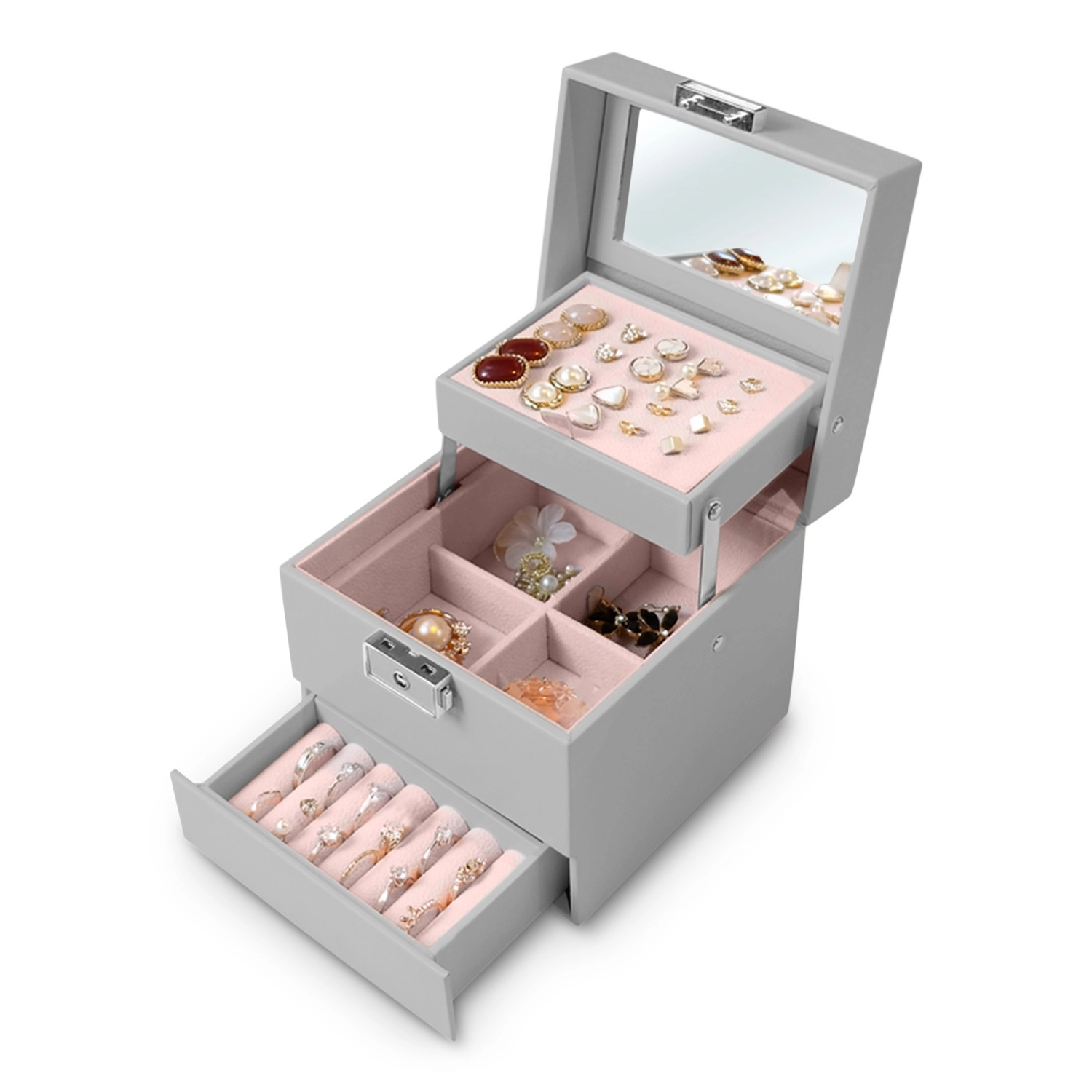 Slogovna in funkcionalna škatla za nakit v moderni sivi barvi združuje vrhunske materiale s pametno notranjo razporeditvijo. Ogledalce v pokrovu, odstranljiva plošča za uhane, razdeljeni predelki za verižice in zapestnice ter samostojen predal z valji za prstane ohranjajo vsako zbirko popolno urejeno.