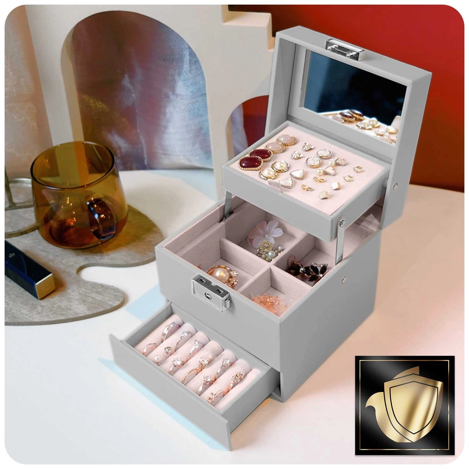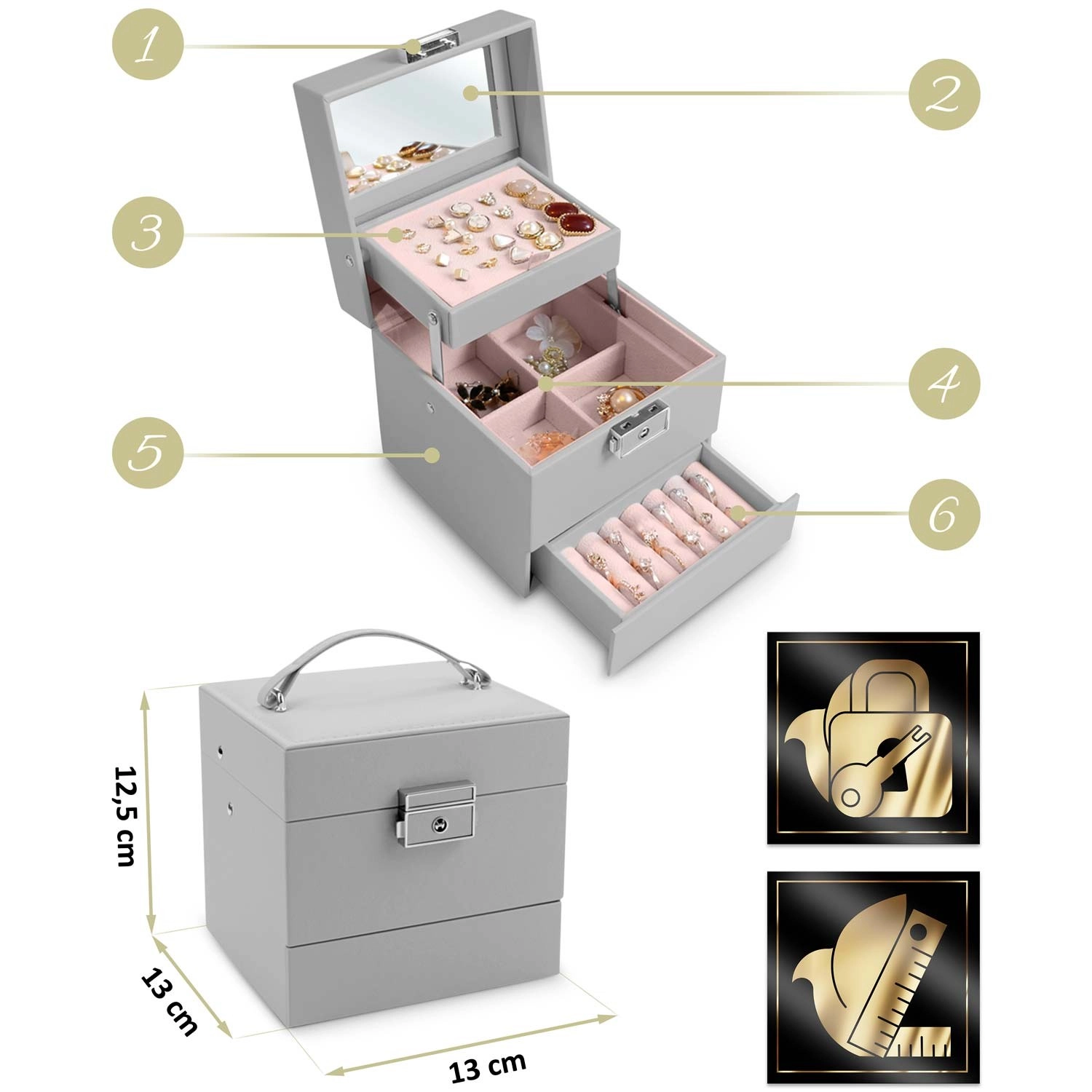 Vgrajeno ogledalce in ključavnica s ključem ščitita nakit ter omogočata hitro preverjanje videza kadarkoli in kjerkoli.