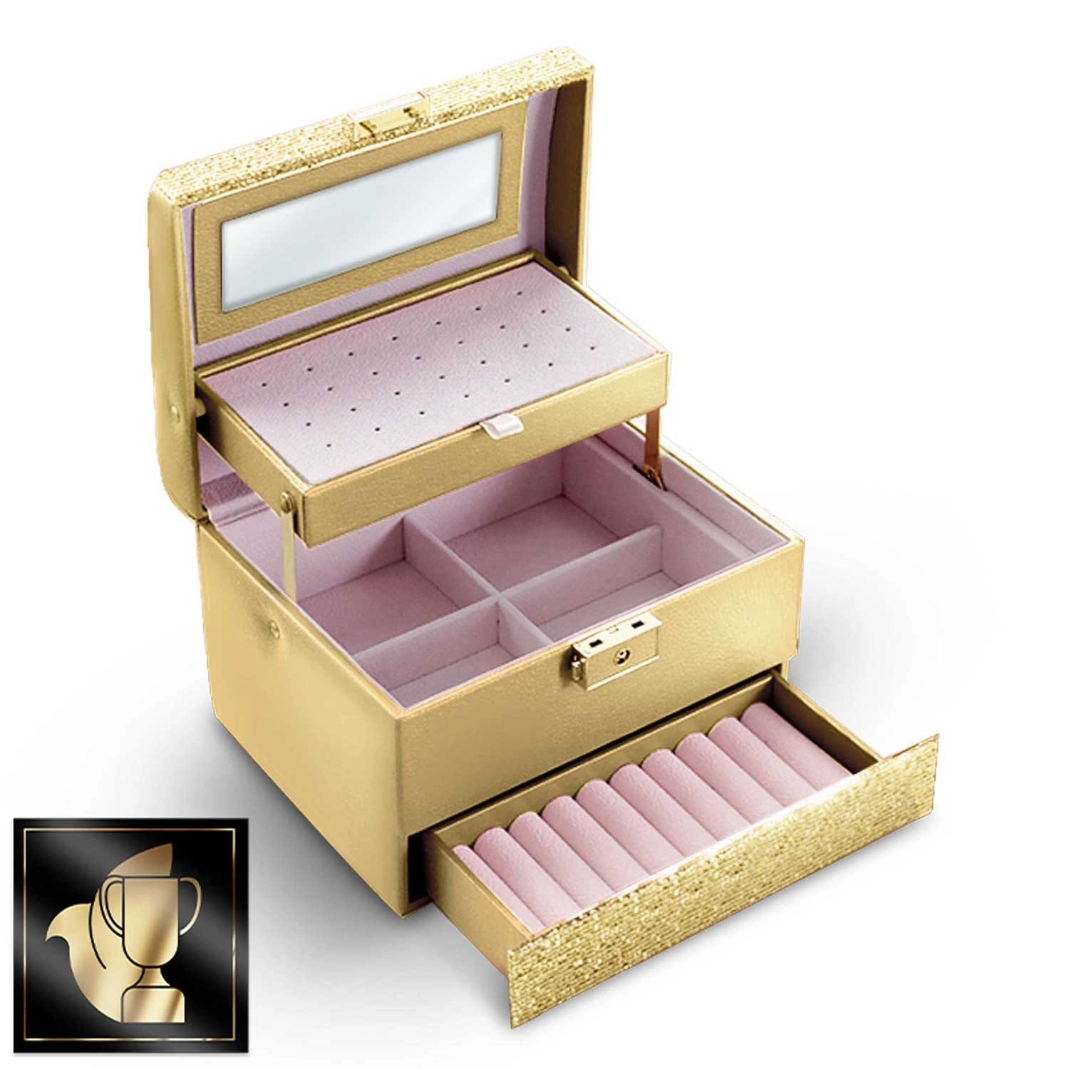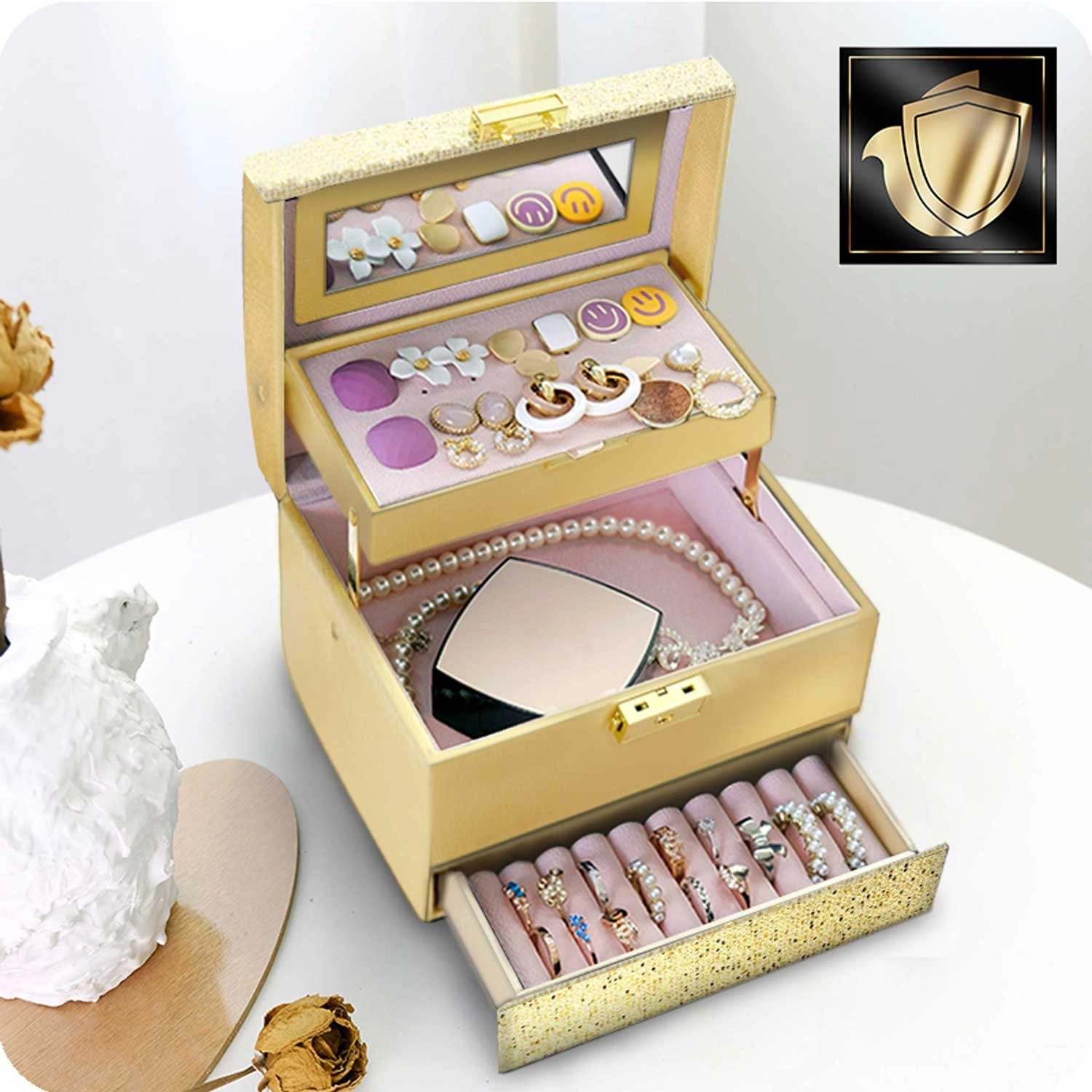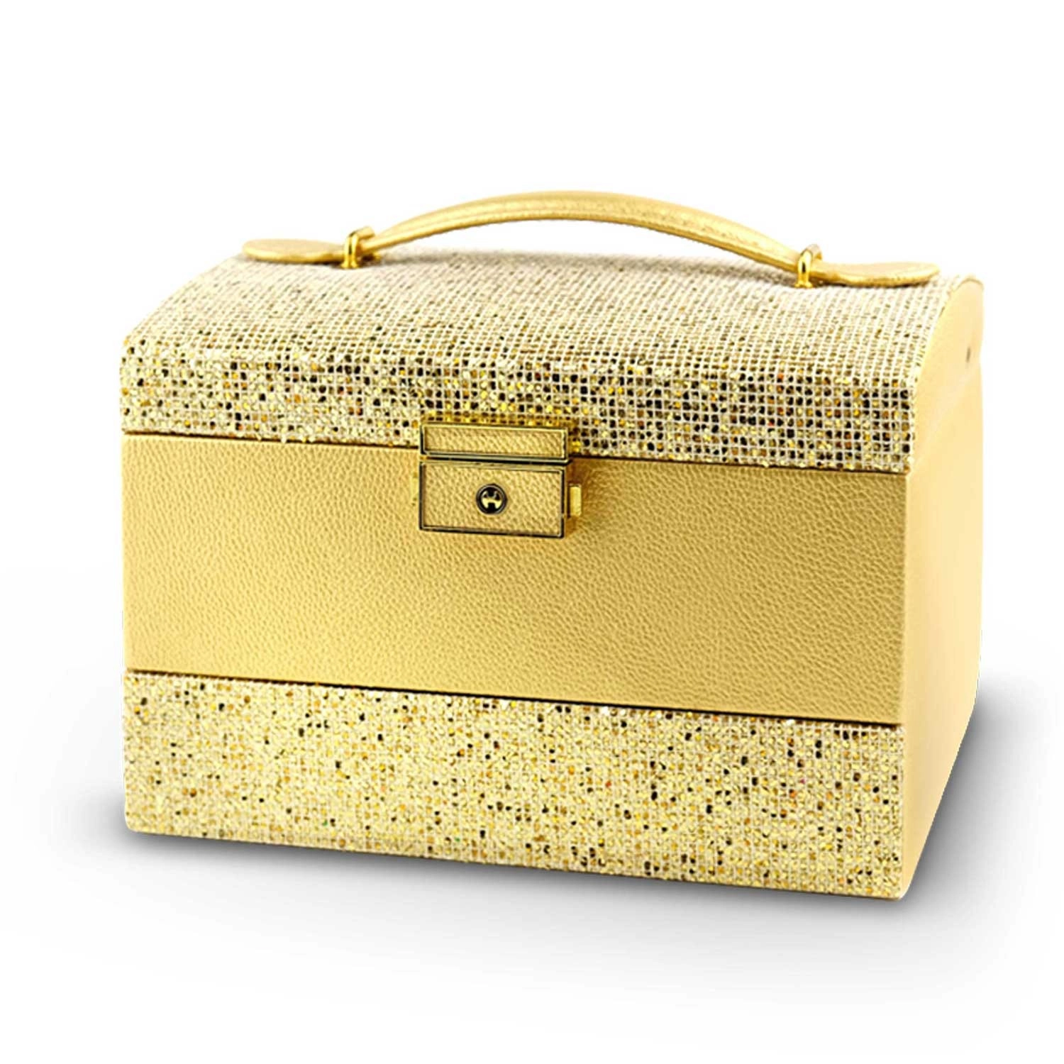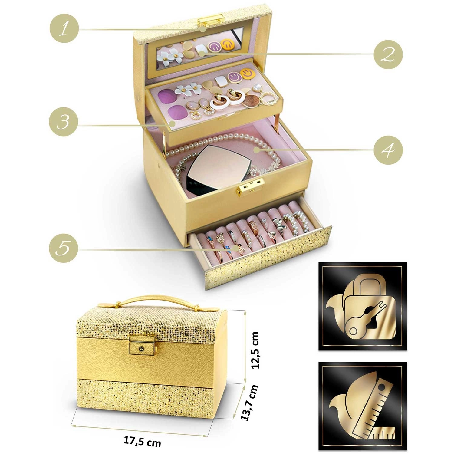 Elegantna škatla za nakit v razkošni zlati barvi združuje slog, funkcionalnost in varno shranjevanje nakita. Je lahka, kompaktna in zahvaljujoč čvrstemu ročaju enostavno prenosna. Zaklepna ključavnica ščiti vsebino pred nenamernim odpiranjem, notranje ogledalo in razdeljeni predelki s prostorom za prstane, uhane in drobne dodatke zagotavljajo popoln pregled. Idealna za ženske in najstnice.