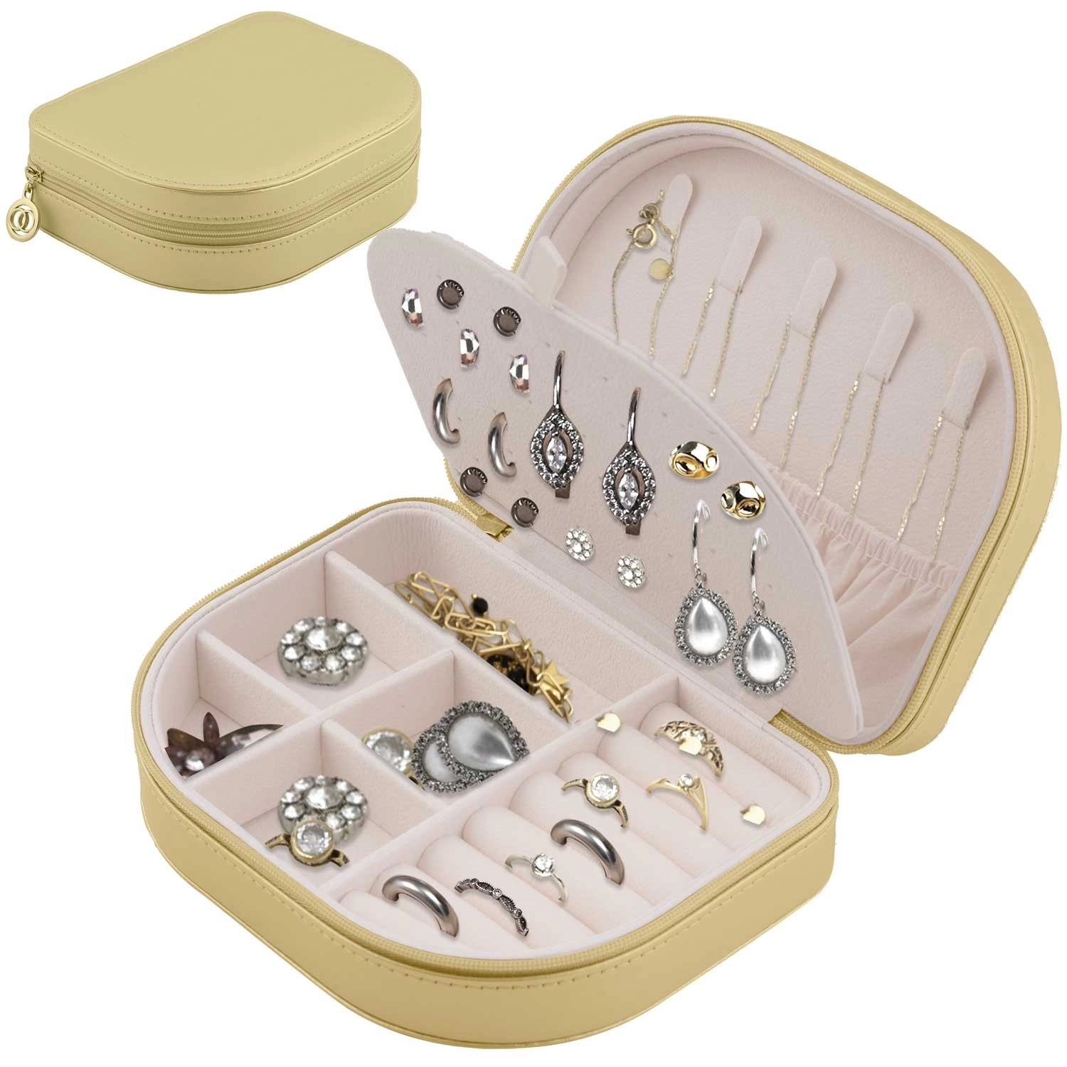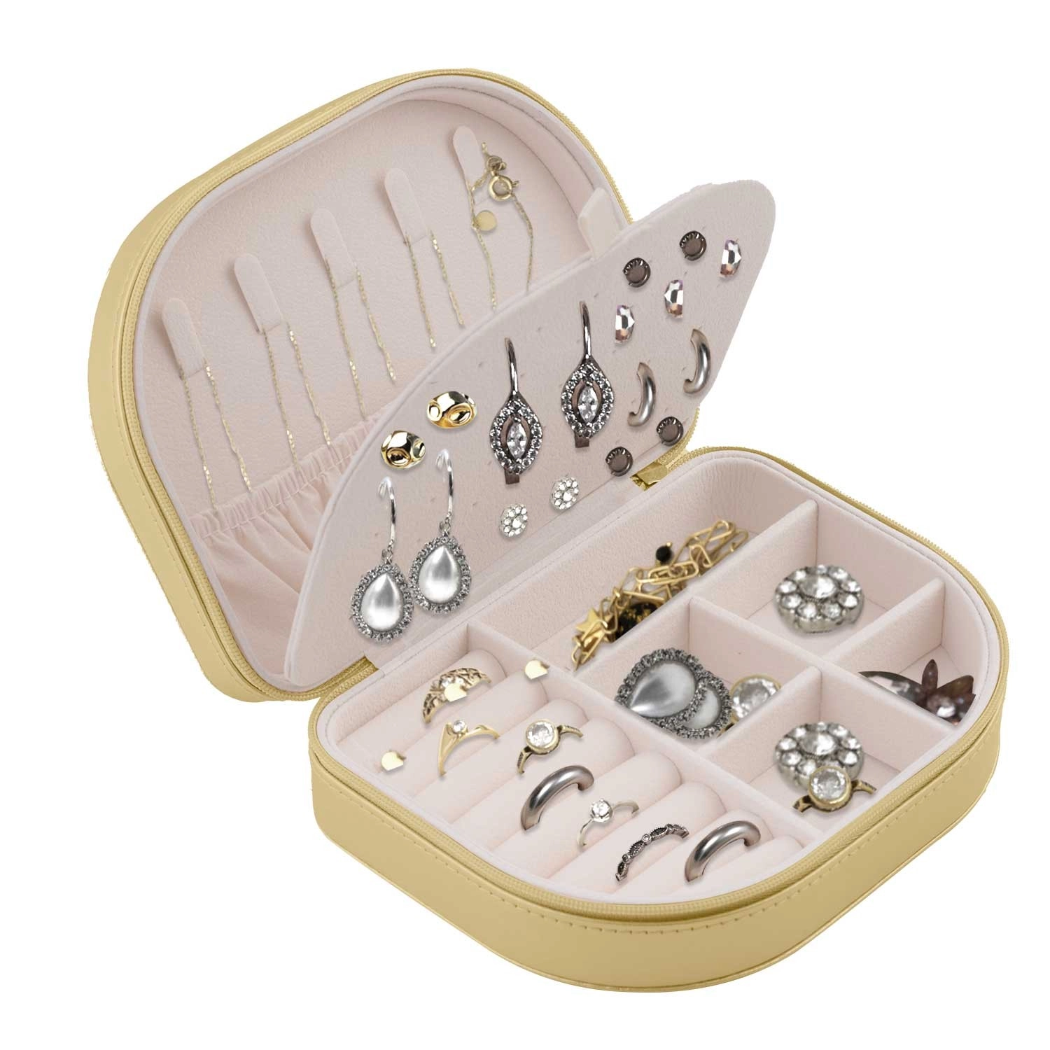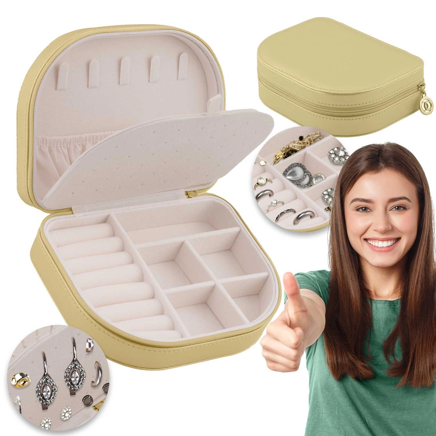 Kljuke za ogrlice, valjčki za prstane, deljeni predalčki za uhane in dodatke ter elastični žep poskrbijo, da vsak kos ostane na svojem mestu.