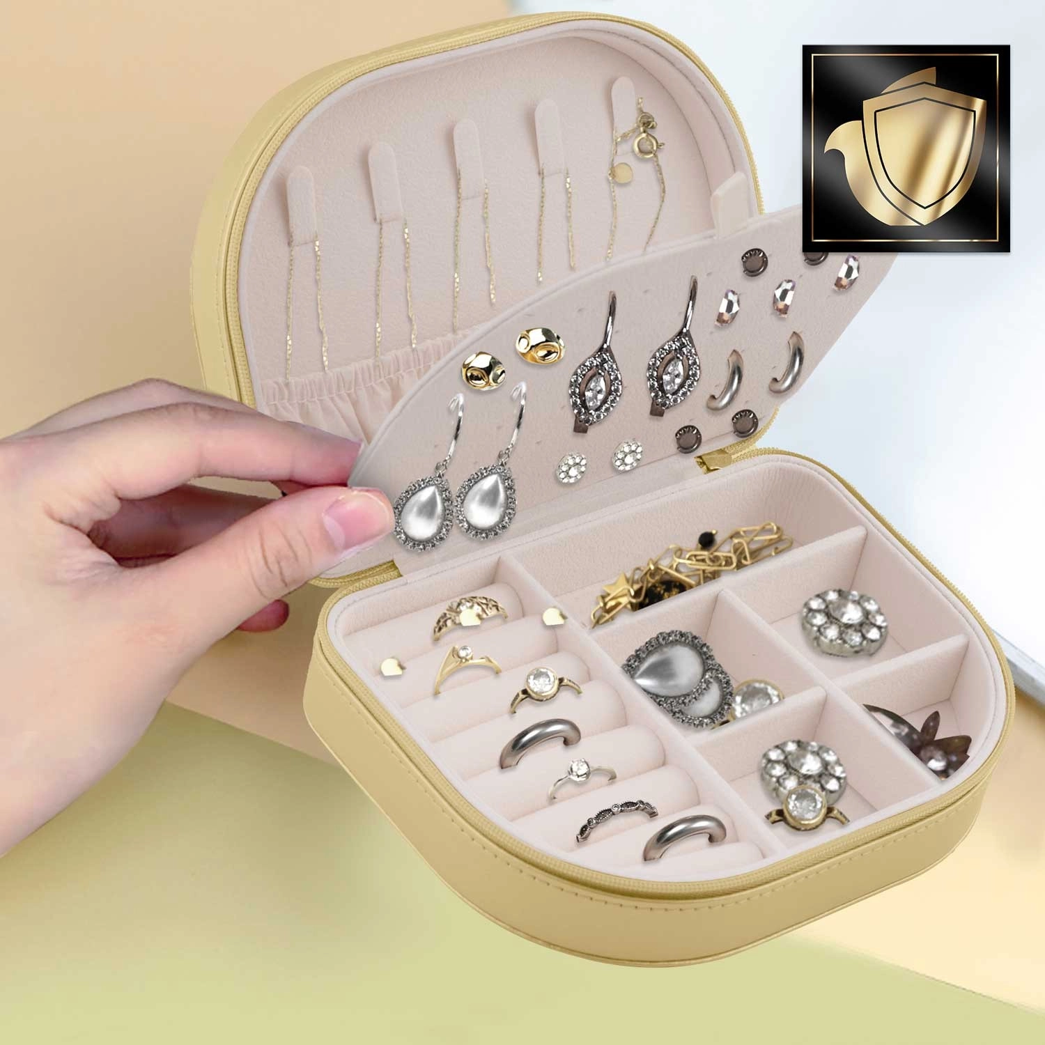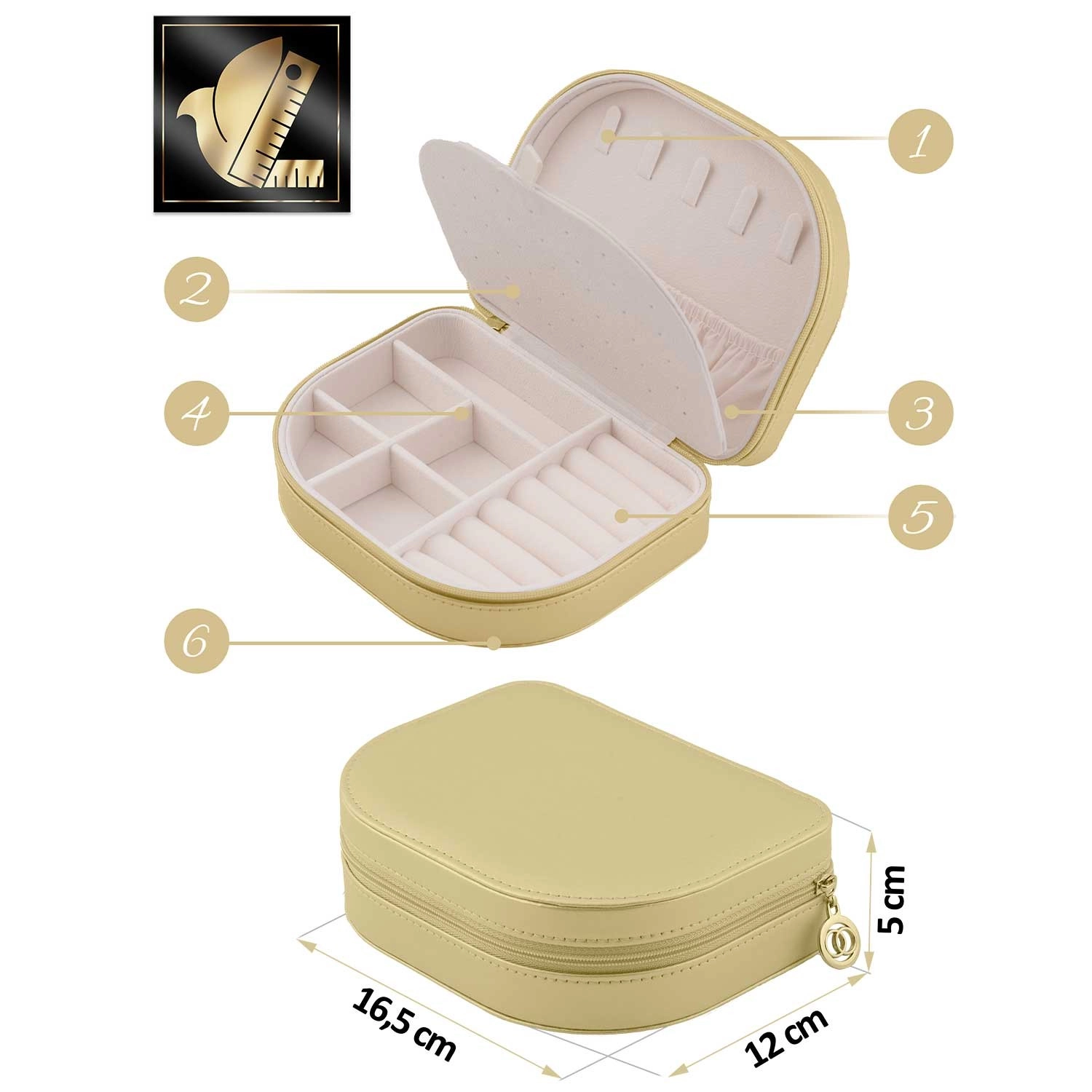 Ta stilska zlata škatlica za nakit združuje kompaktne mere z izjemno kapaciteto. Zaradi premišljene notranje razporeditve boste zlahka shranili prstane, uhane, zapestnice in ogrlice brez zapletanja. Mehko oblazinjenje ščiti nakit pred praskami, medtem ko ga trpežna zadrga zanesljivo zapre.