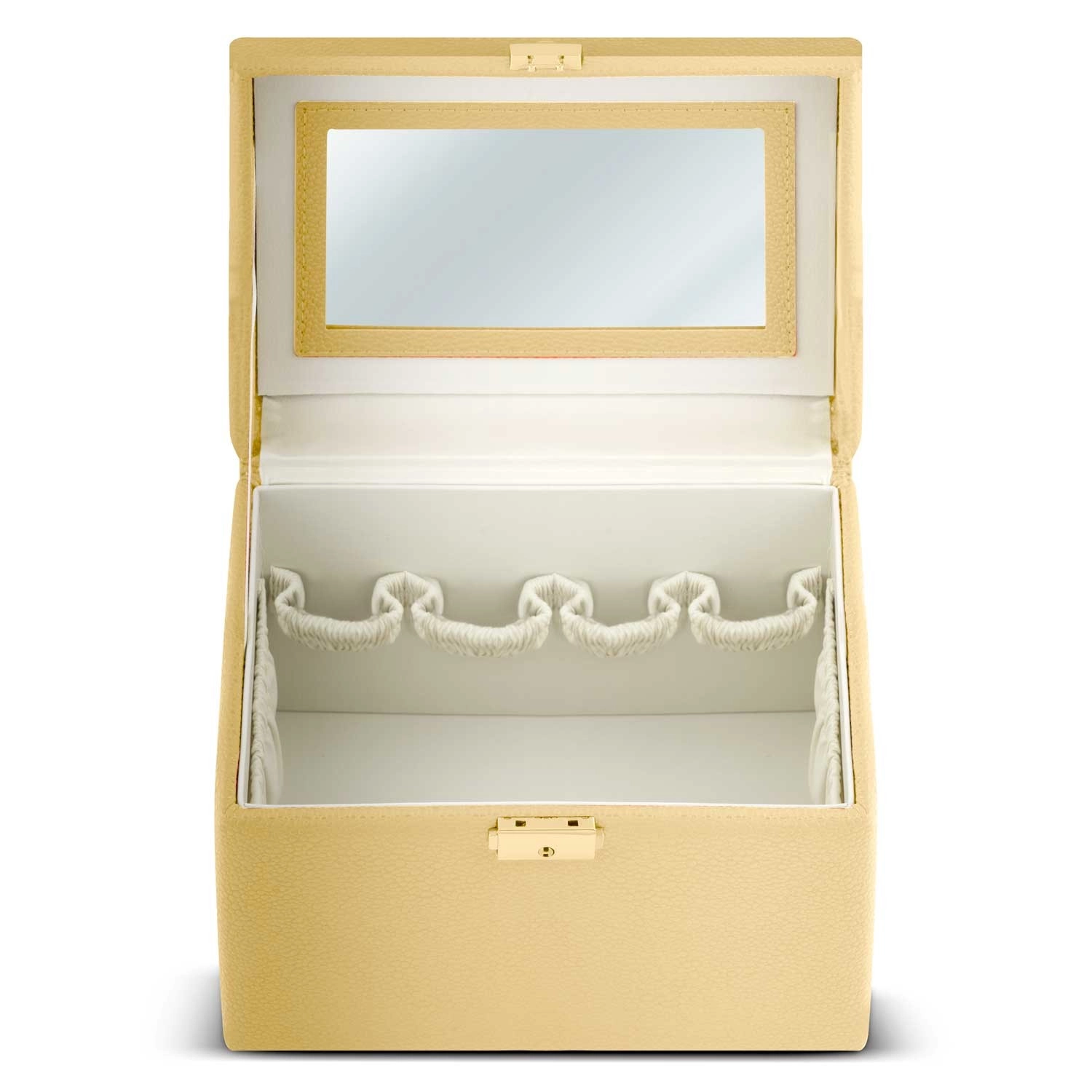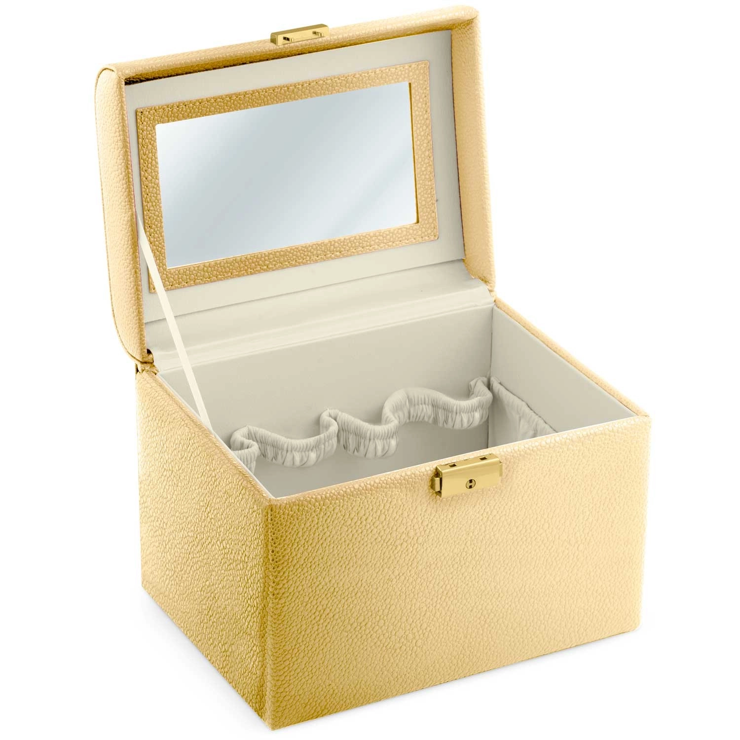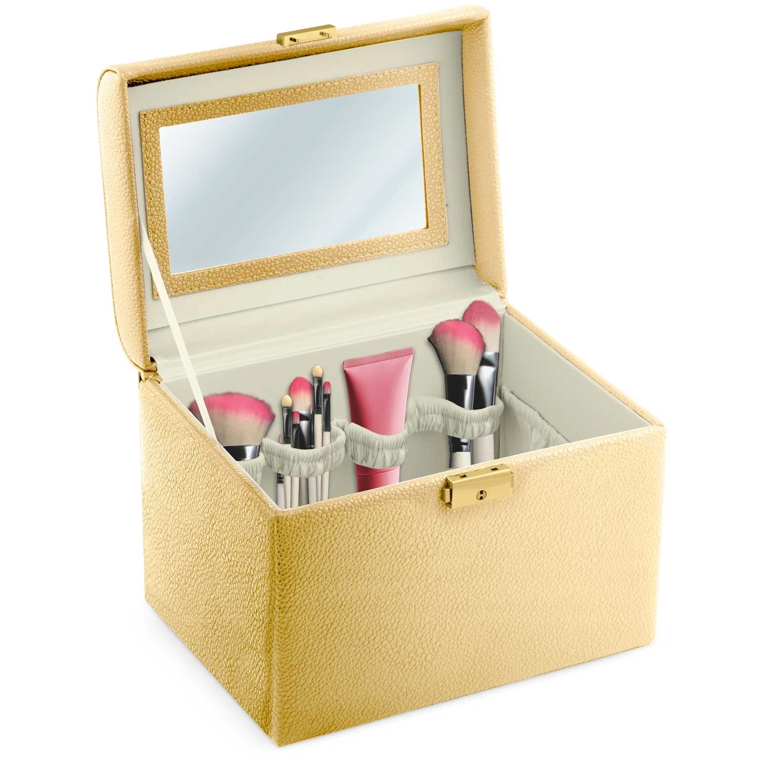 Kovček se zaklepa s ključkom, na notranji strani pokrova pa ima priročno ogledalce za hitre popravke videza doma in na poti.