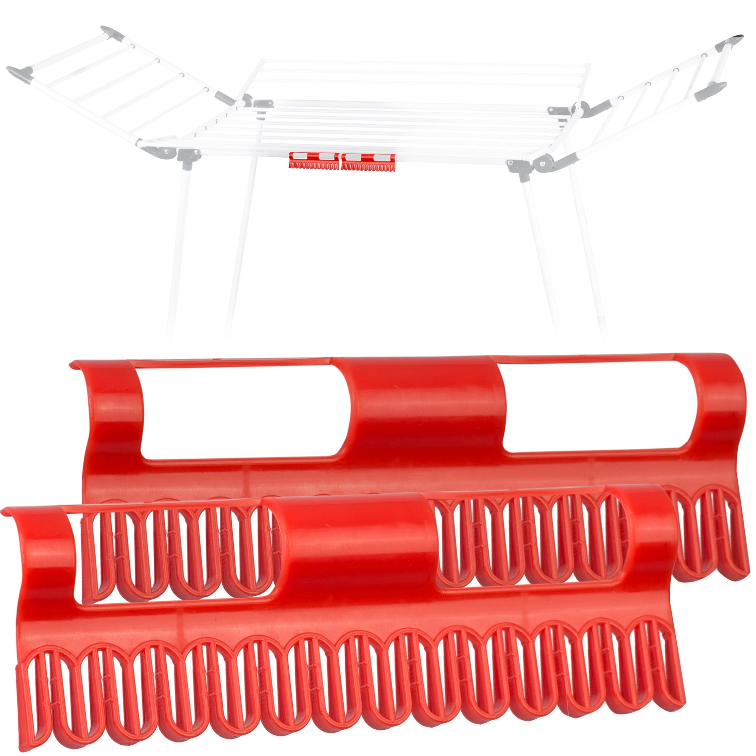 Maksimizirajte prostor na sušilnem stojalu in sušite majhne kose pametno. Rdeča držala s prilagodljivimi odprtinami trdno pritrdijo nogavice, spodnje perilo ali otroška oblačila brez kljukic. Zaradi boljšega pretoka zraka prihaja do hitrejšega in nežnejšega sušenja, kar pripomore k daljši življenjski dobi materiala.