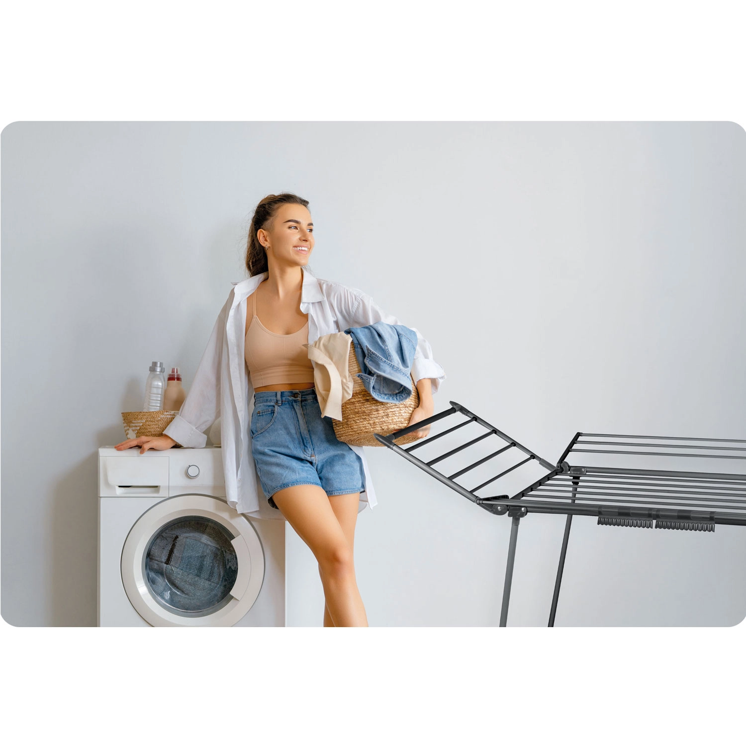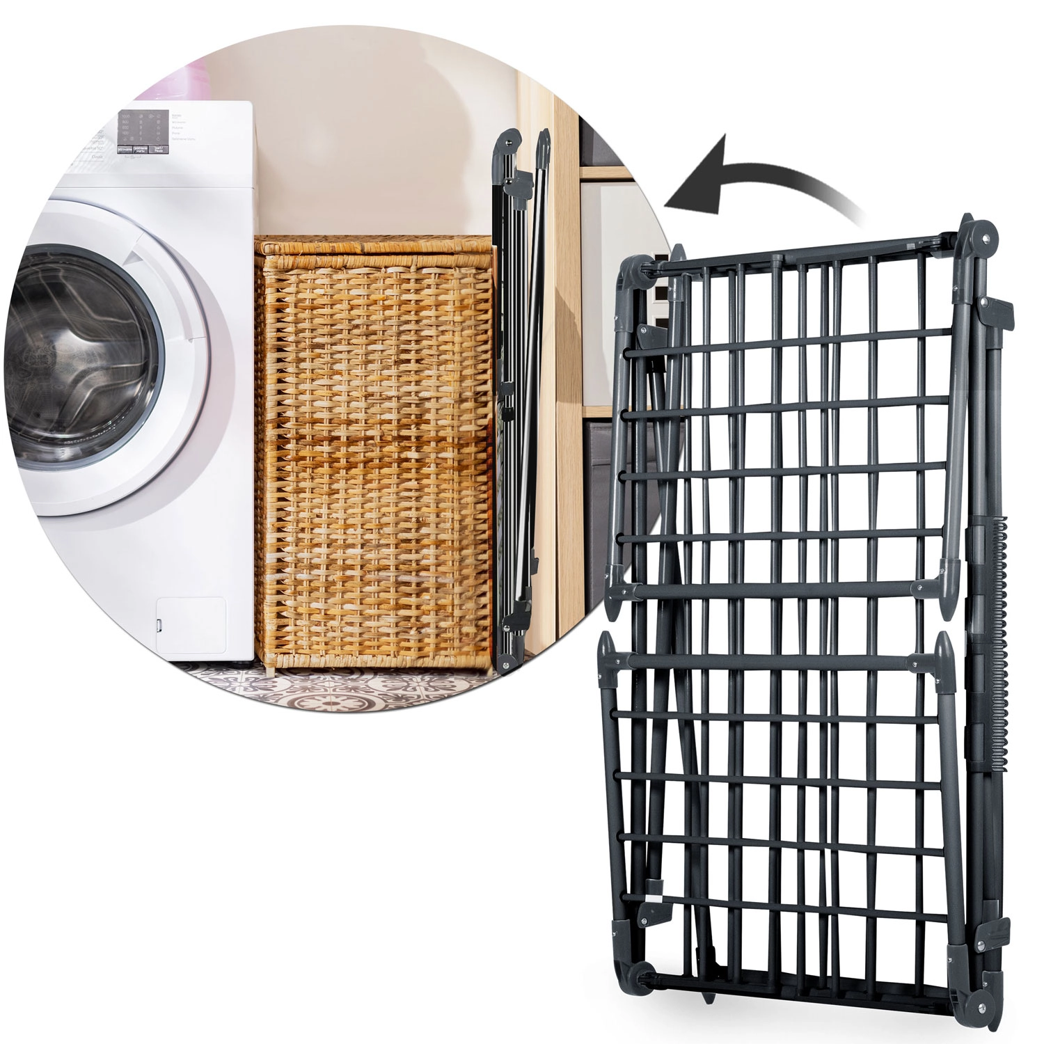 Po sušenju sušilnik preprosto zložite v kompaktno obliko in ga pospravite ob pralni stroj ali v omaro. Idealna izbira za vse, ki želijo varčno, nežno in učinkovito sušenje brez uporabe sušilnega stroja.